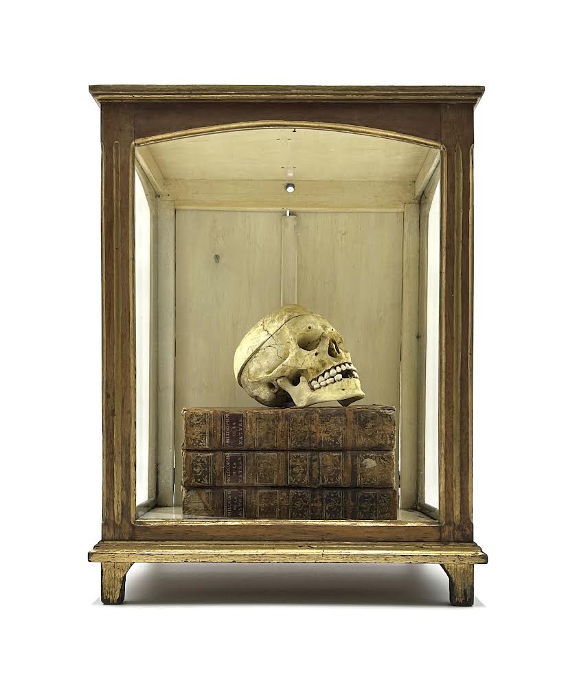 Antique, 19th century , teak with a Memento Mori composition.