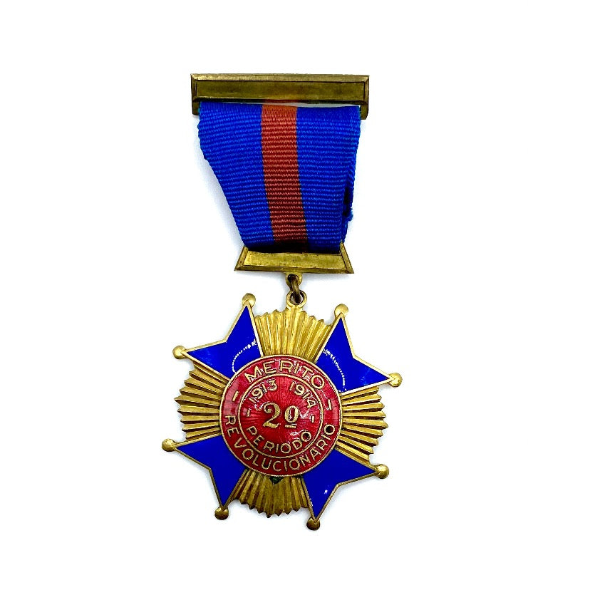 Antique Gilded bronze and enamel Medal, on original ribbon with wearing clasp, Mexico Cross of Revolutionary Merit 1913-1914 second period.