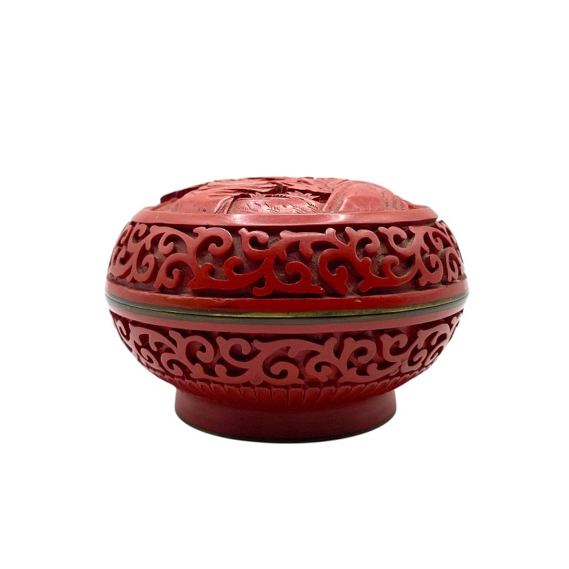 Antique beautiful, carved Red Cinnabar Round Lidded Box with blue enamel interior and brass lip. Ya