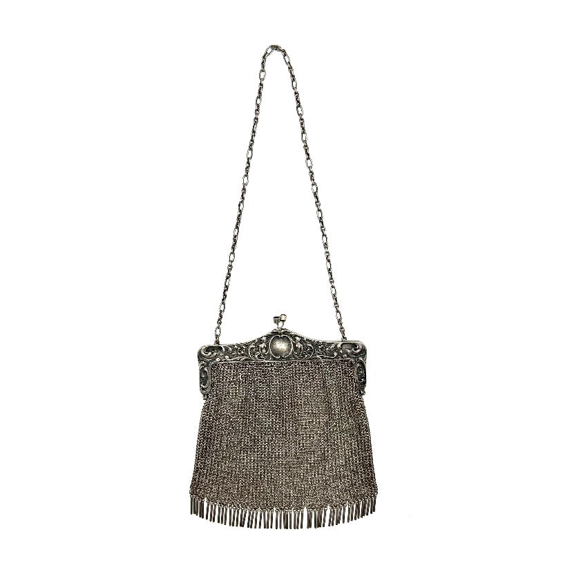 Antique, Art Nouveau, sterling silver frame, chainmail mesh bag