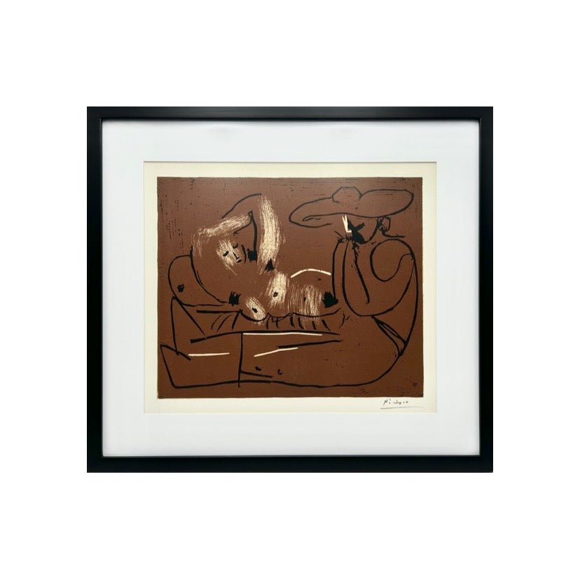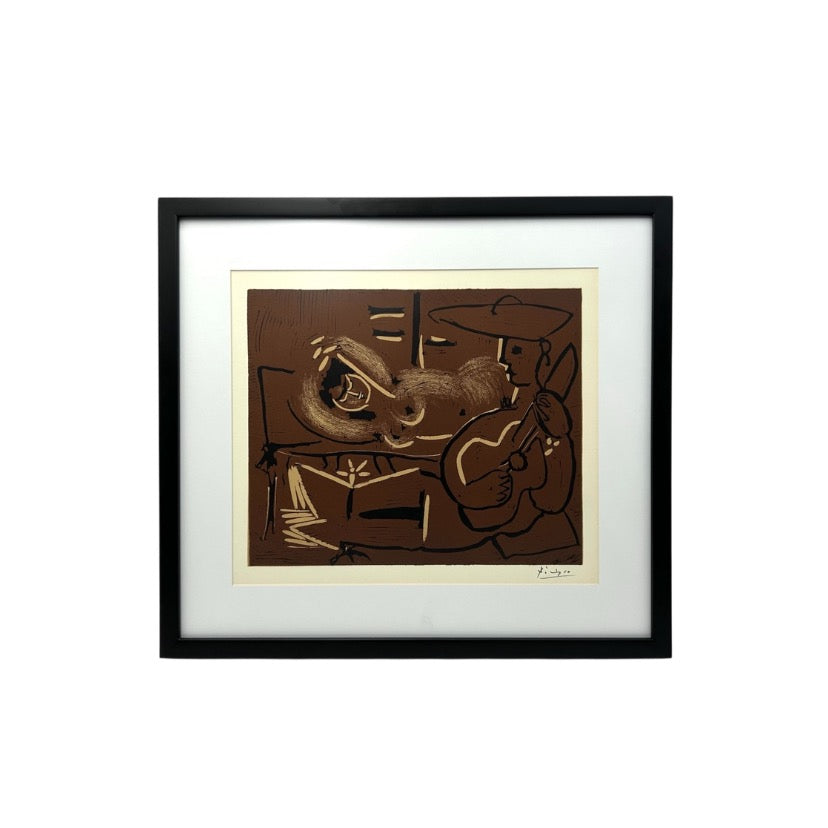 Pablo Picasso , Original linocut “ Reclining Woman and Picador with Guitar“ 1962 , Printed en France by Cercle D’Art .