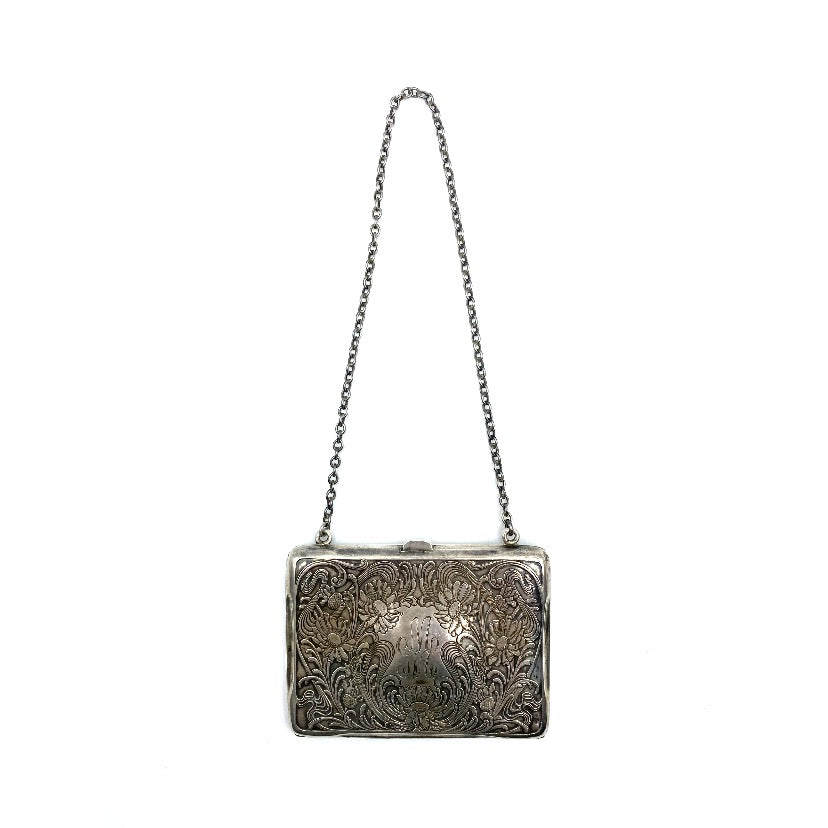 Beautiful Antique Tiffany, art nouveau, Sterling silver, square change pouch with engraved floral design and monogrammed MM. Inside is lined in pink silk. Carrying chain.