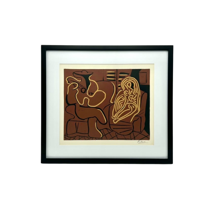 Pablo Picasso , Original linocut “ Reclining woman and guitar player picador“ 1962 , Printed en France by Cercle D’Art .