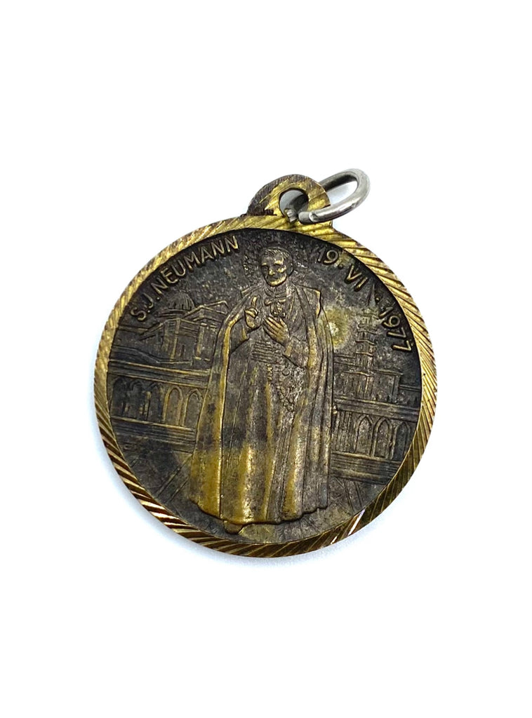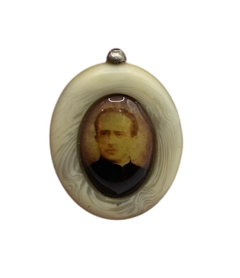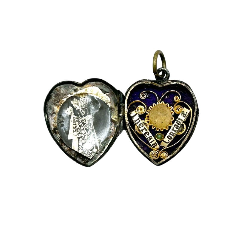 Heart medallion with profile portrait of Saint Conrad. Inside relics of St. Therese and St. Conrad.