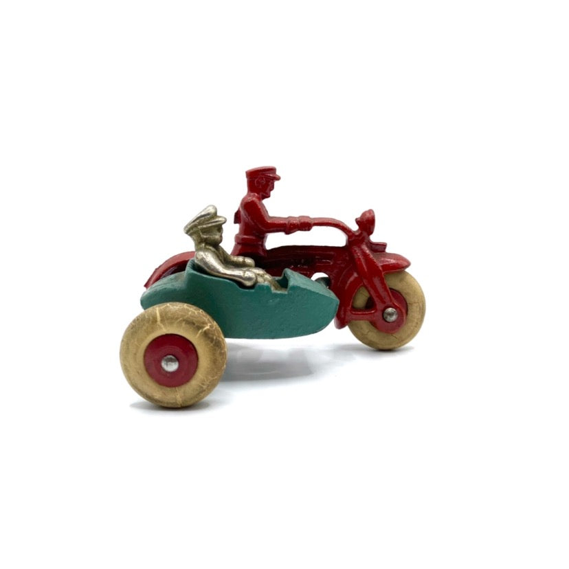 Hubley cast iron COP Motorcycle-Midget with sidecar and nickel Cop Passenger. Original White rubber tires.