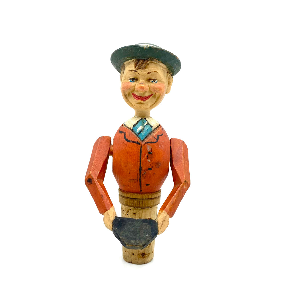 Antique 1940s Carved Wood Wine Bottle Stopper - Anri Mechanical Cork Stopper