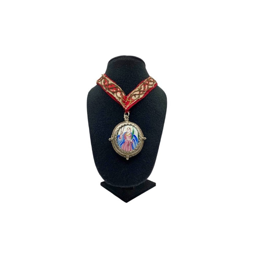 Antique medallion / reliquary, in chiselled sterling silver with a large, beautifully polychrome porcelain cabochon of St. Prisca, a Christian saint who is revered as the patron saint of prisoners.