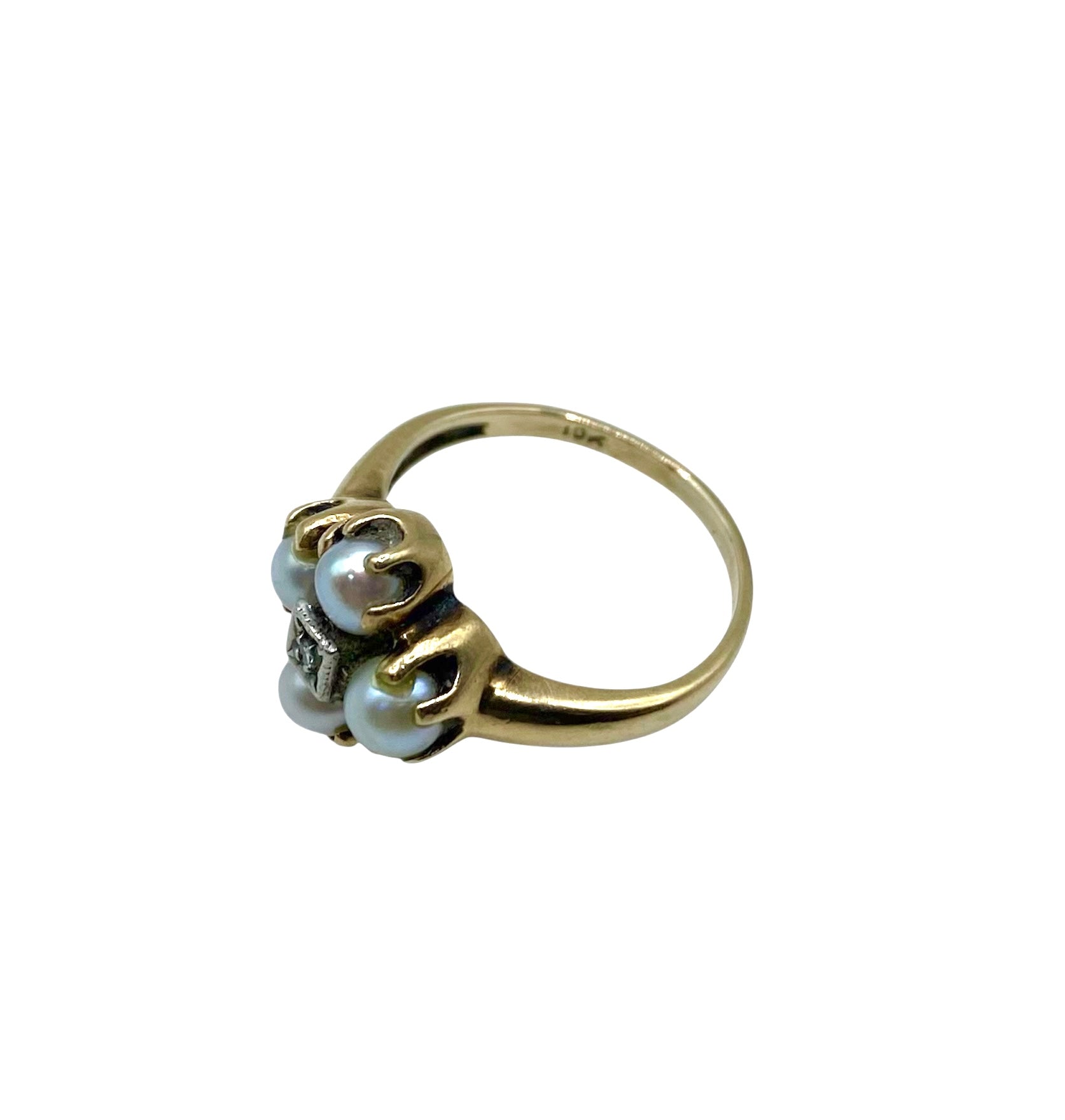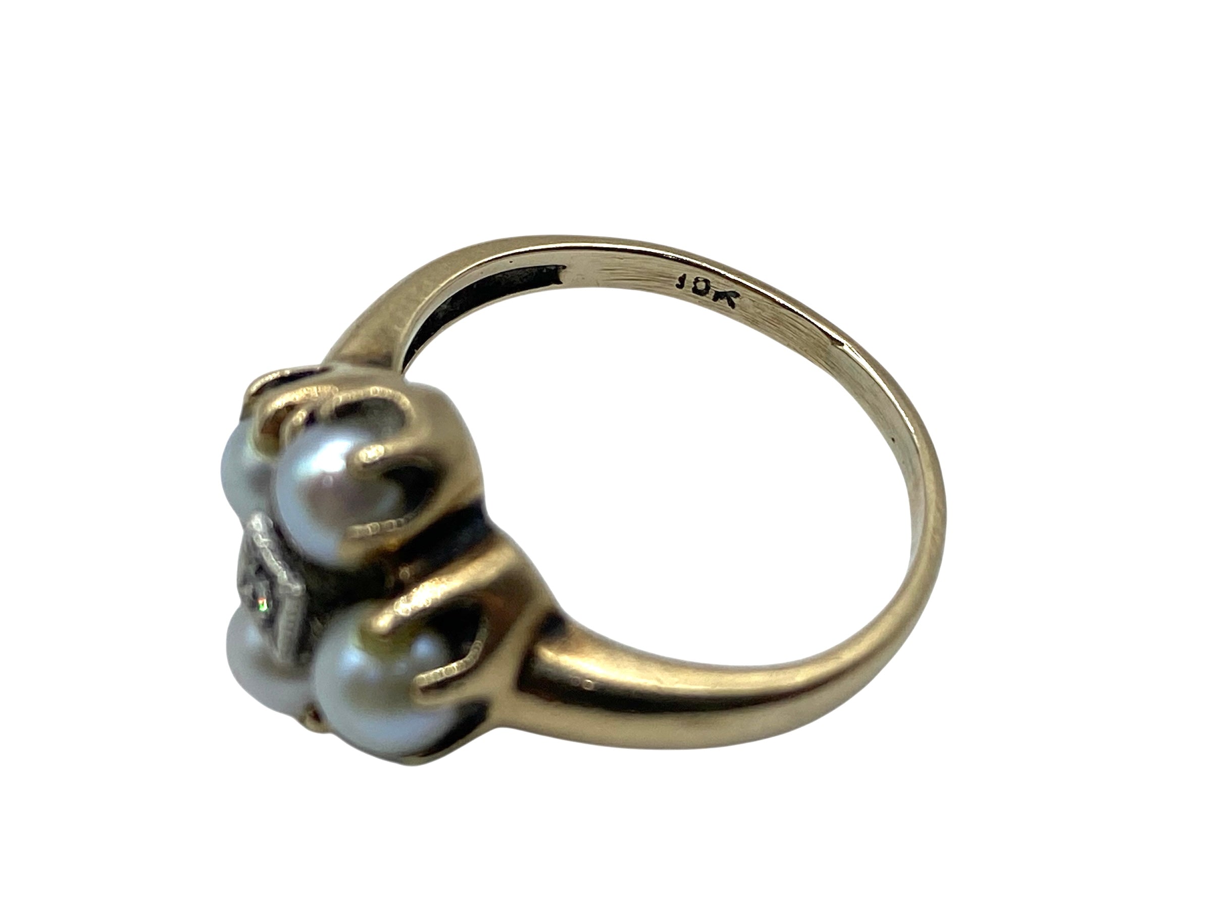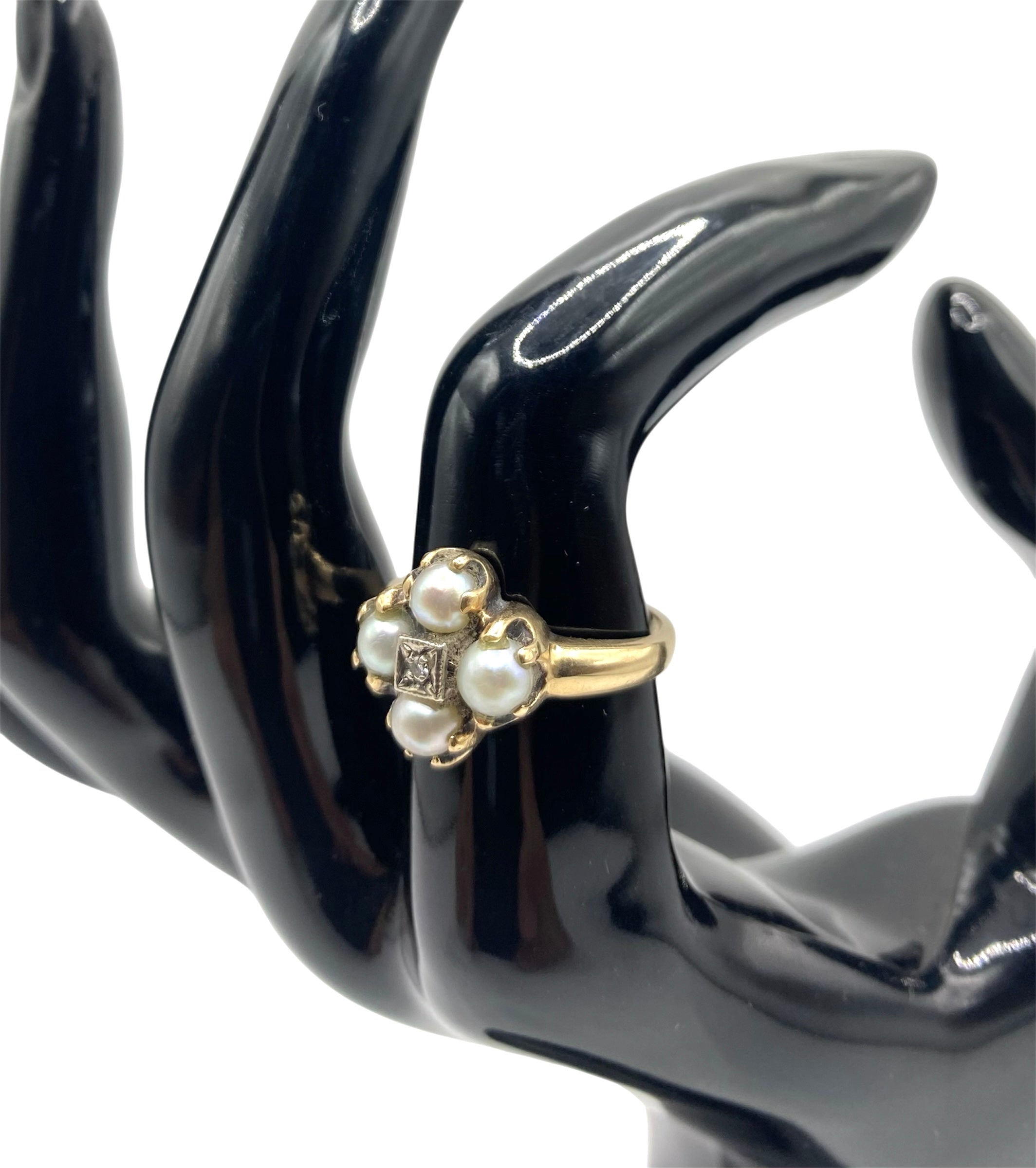 Antique 1890s/ early 20th century pearl cluster ring with small center piece diamond set in 10k yellow gold.