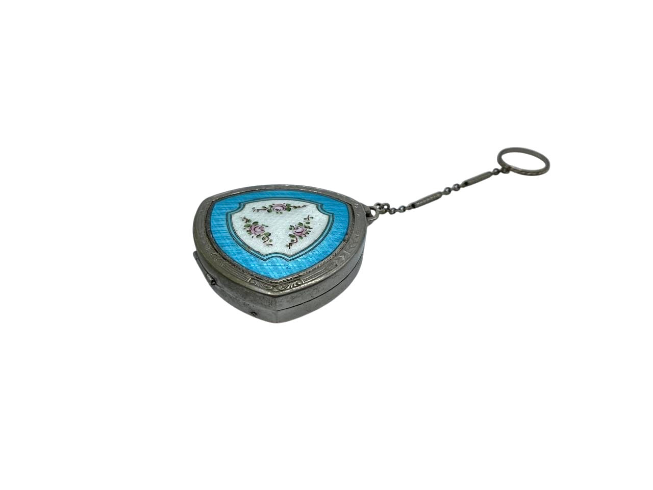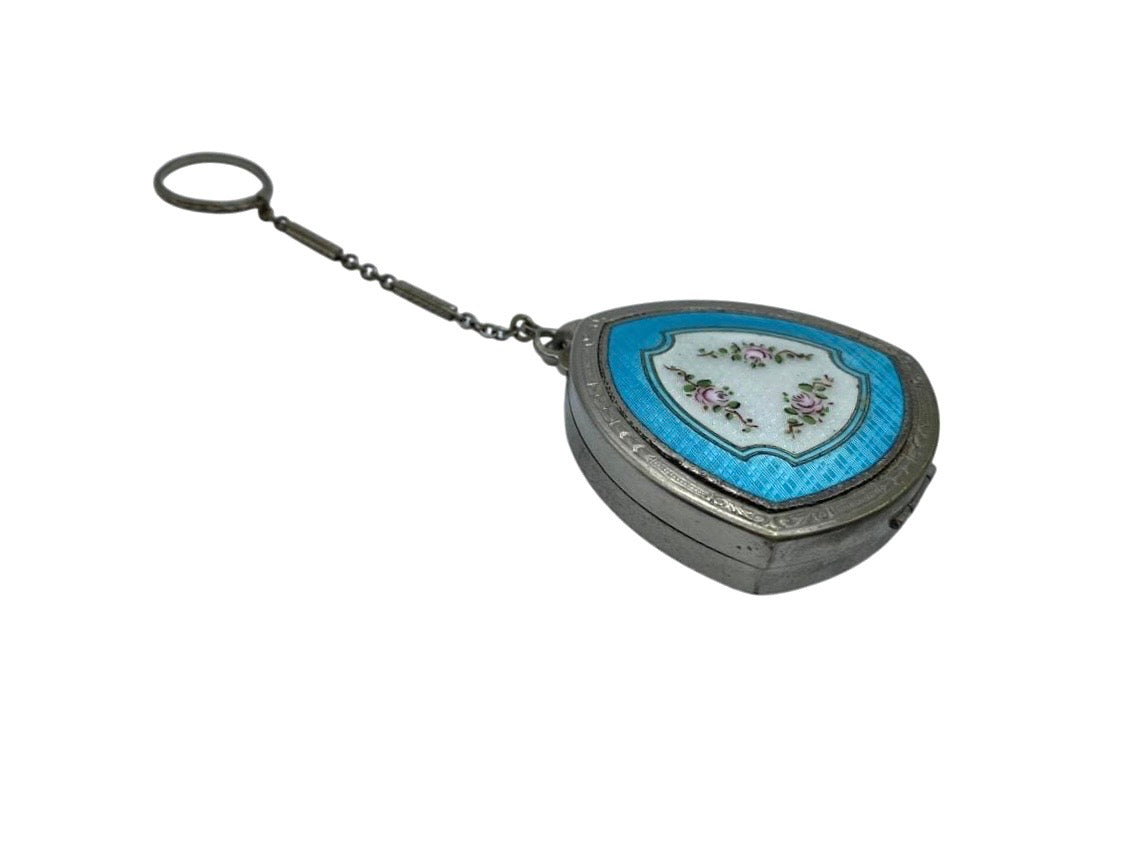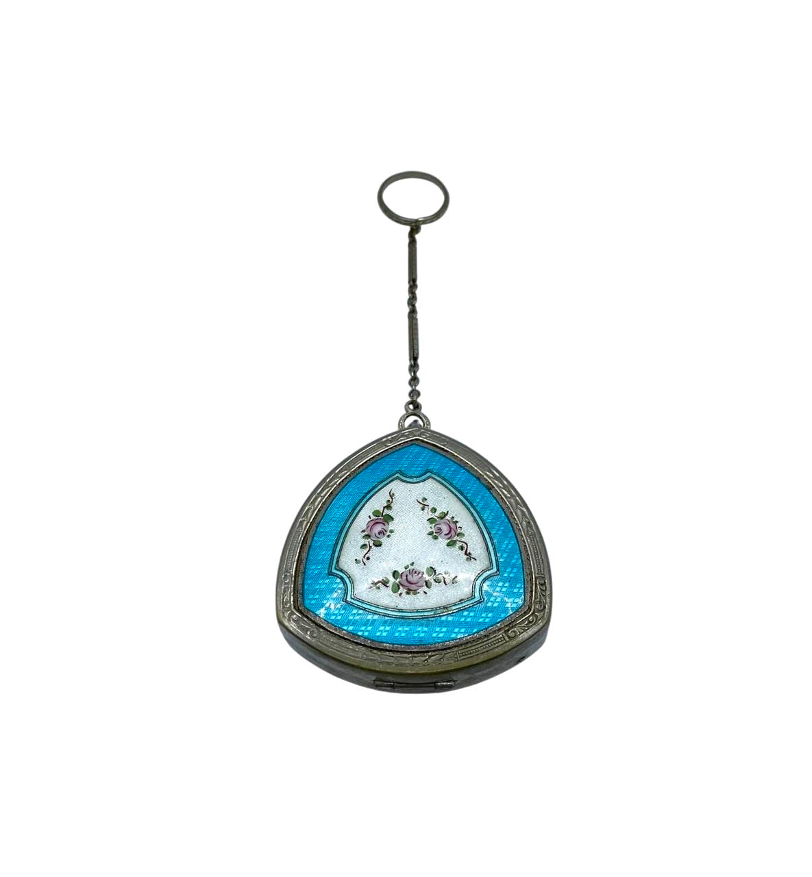 Art Deco Guilloche Enamel Silvered metal Powder and Rouge Compact with Chain and Finger Ring. Decorated with Blue guilloche enameling with three hand painted roses and Forget-Me-Nots with a chased floral border.
