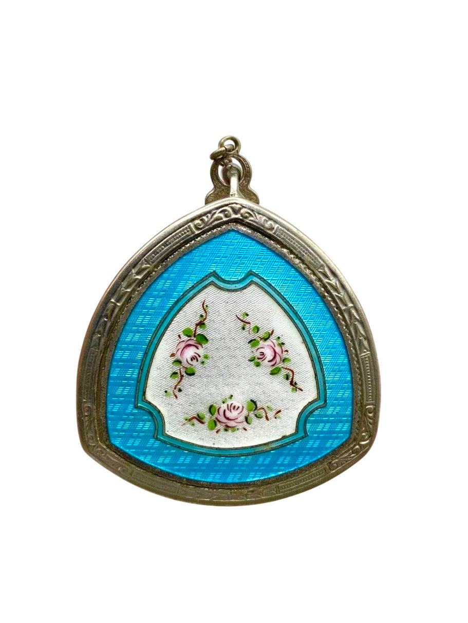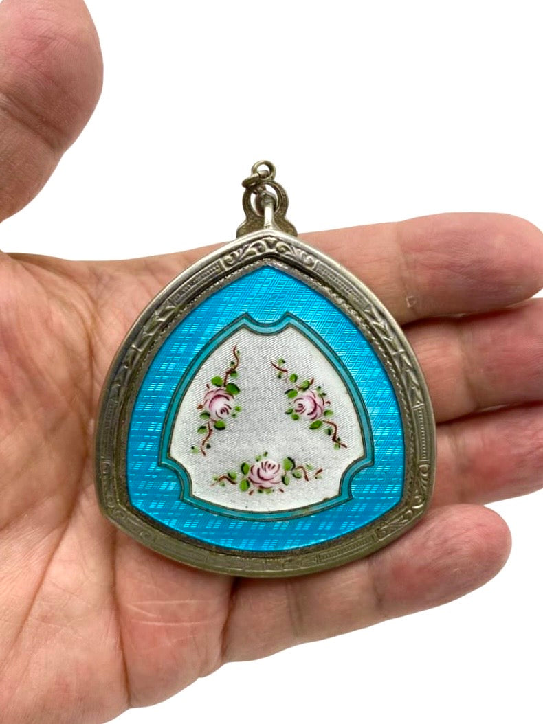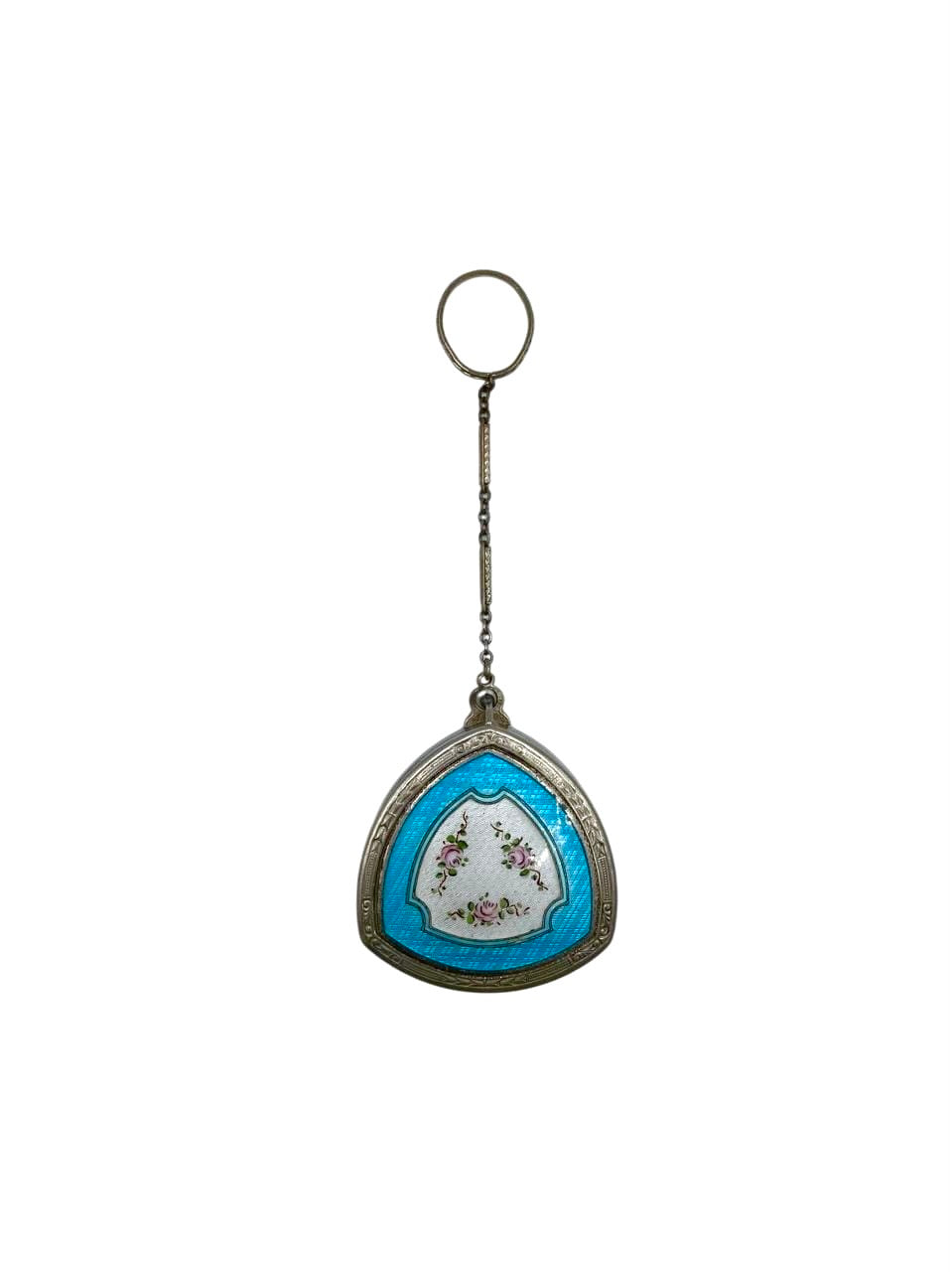 Art Deco Guilloche Enamel Silvered metal Powder and Rouge Compact with Chain and Finger Ring. Decorated with Blue guilloche enameling with three hand painted roses and Forget-Me-Nots with a chased floral border.