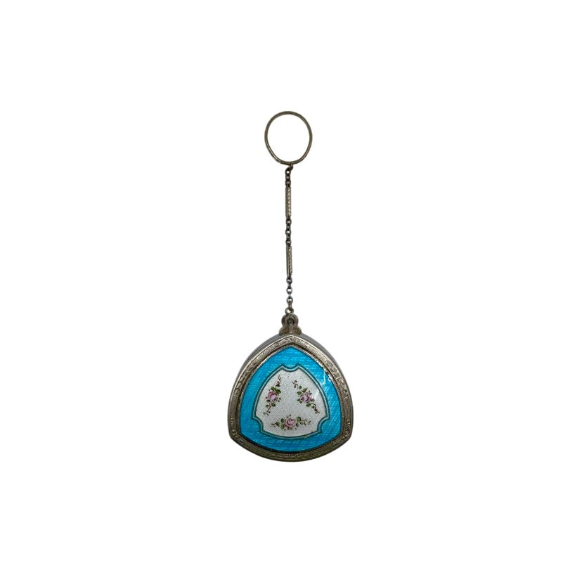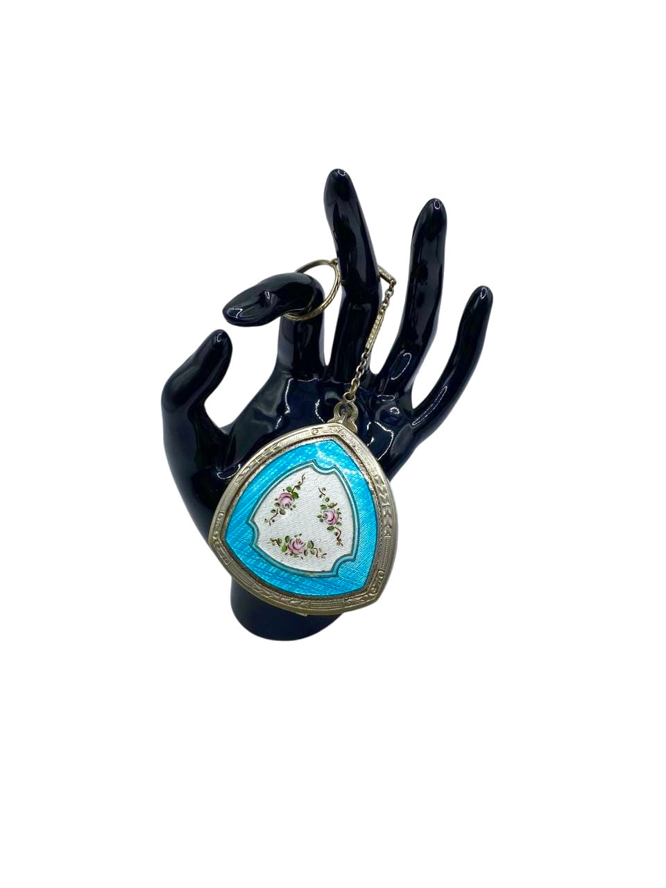 Antique Art Deco Hand-Painted Enamel Guilloche Compact with Chatelaine Chain and Hand-Painted Roses with original puff .