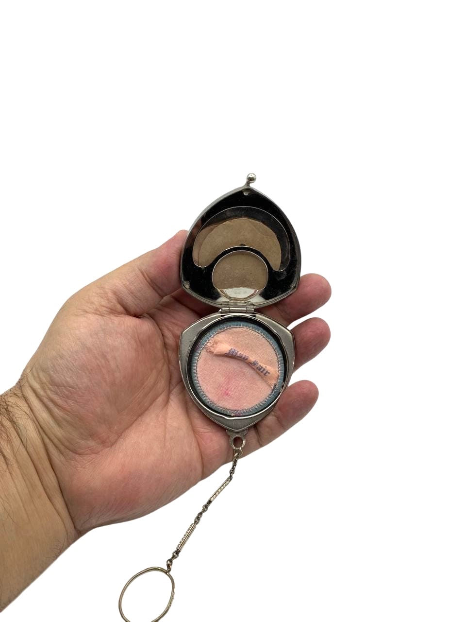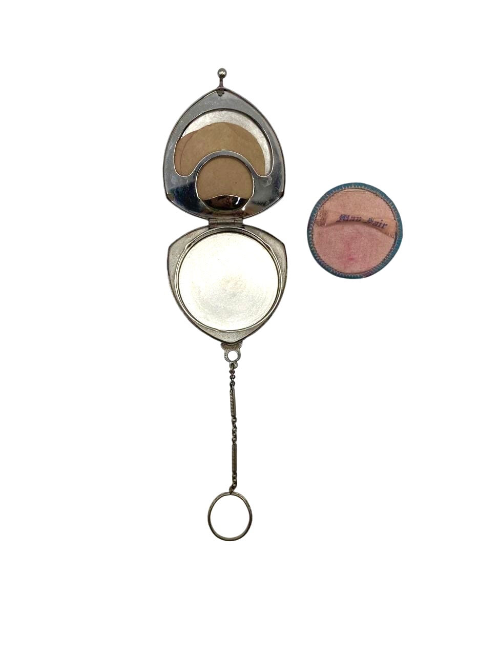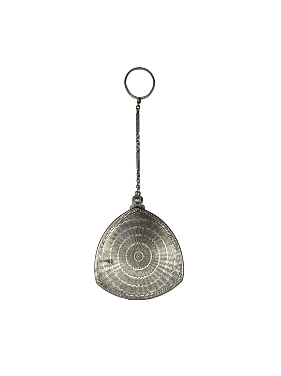 The edges surrounding the enamel are richly embossed. The sides are polished and the bottom has a beautiful damascened design. There is a chain attached to the top with a a finger ring on the end ... perfect for dancing or attaching to a chatelaine. Overall this compact is in near perfect condition.