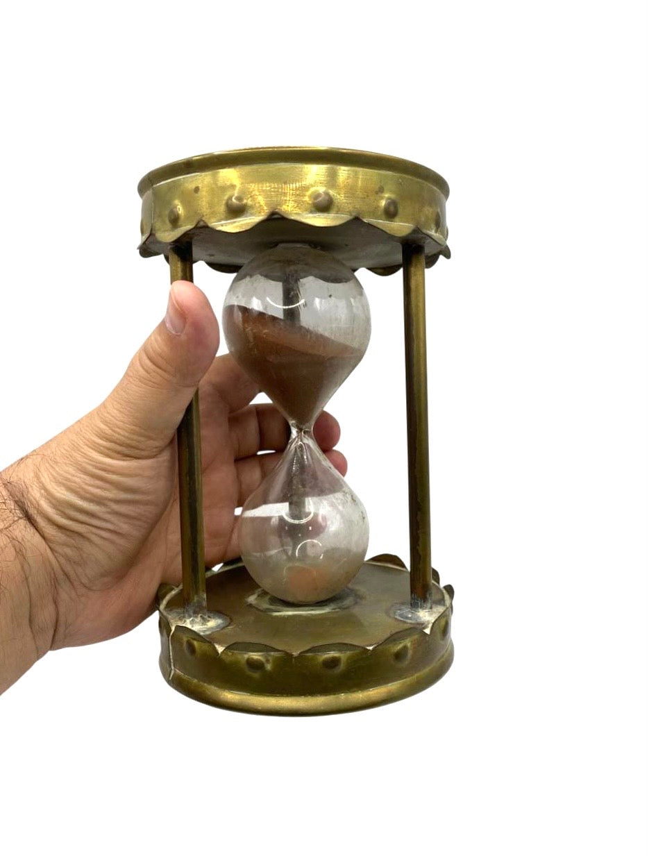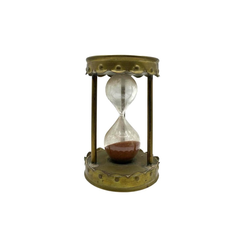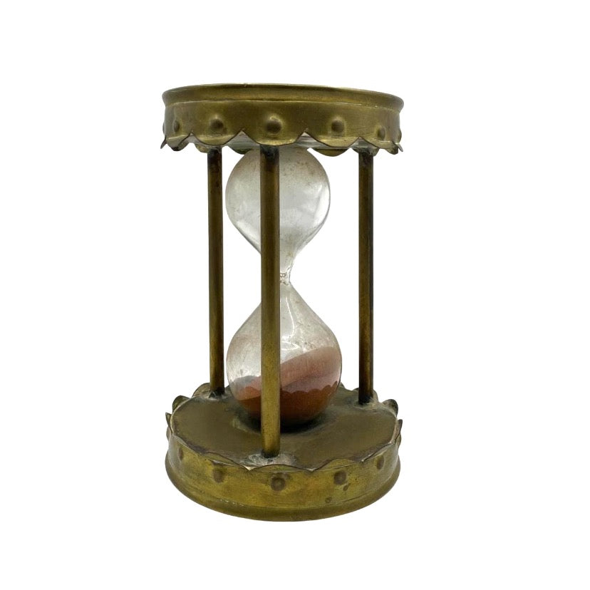 A large 19th century hour glass, or sand glass, brass framed connected by three baluster columns, encasing a large colorless blown glass bulb with red sand.