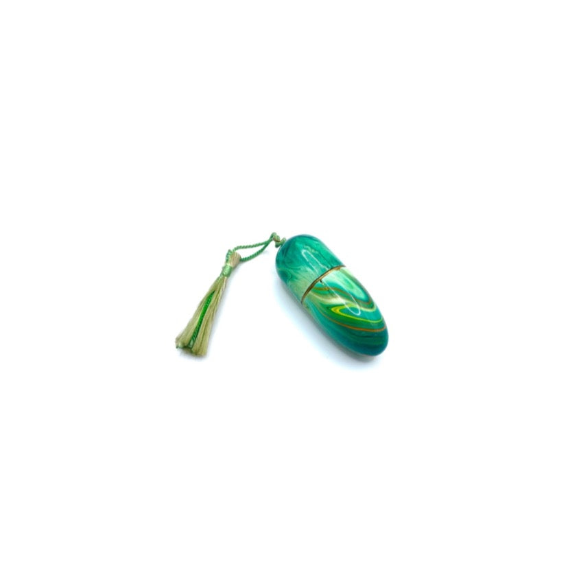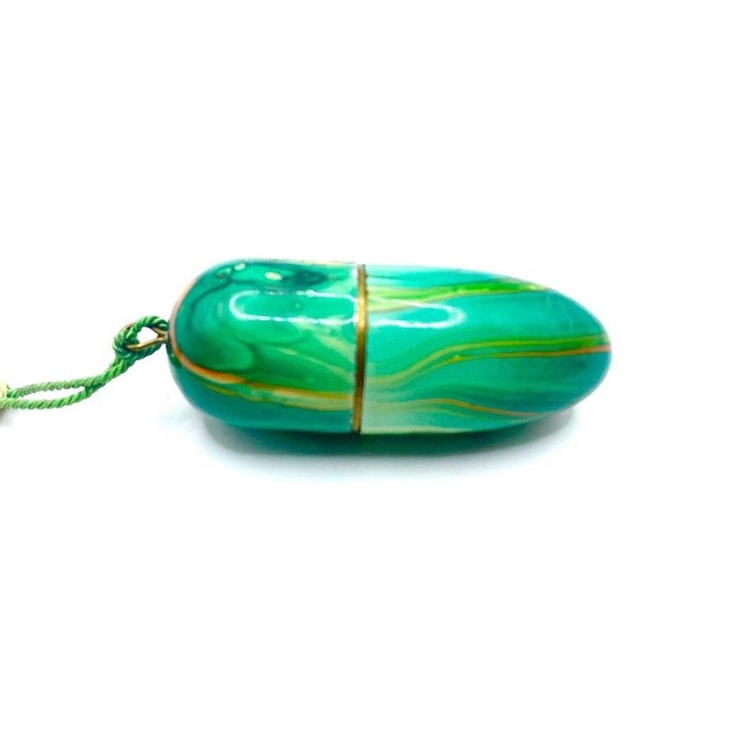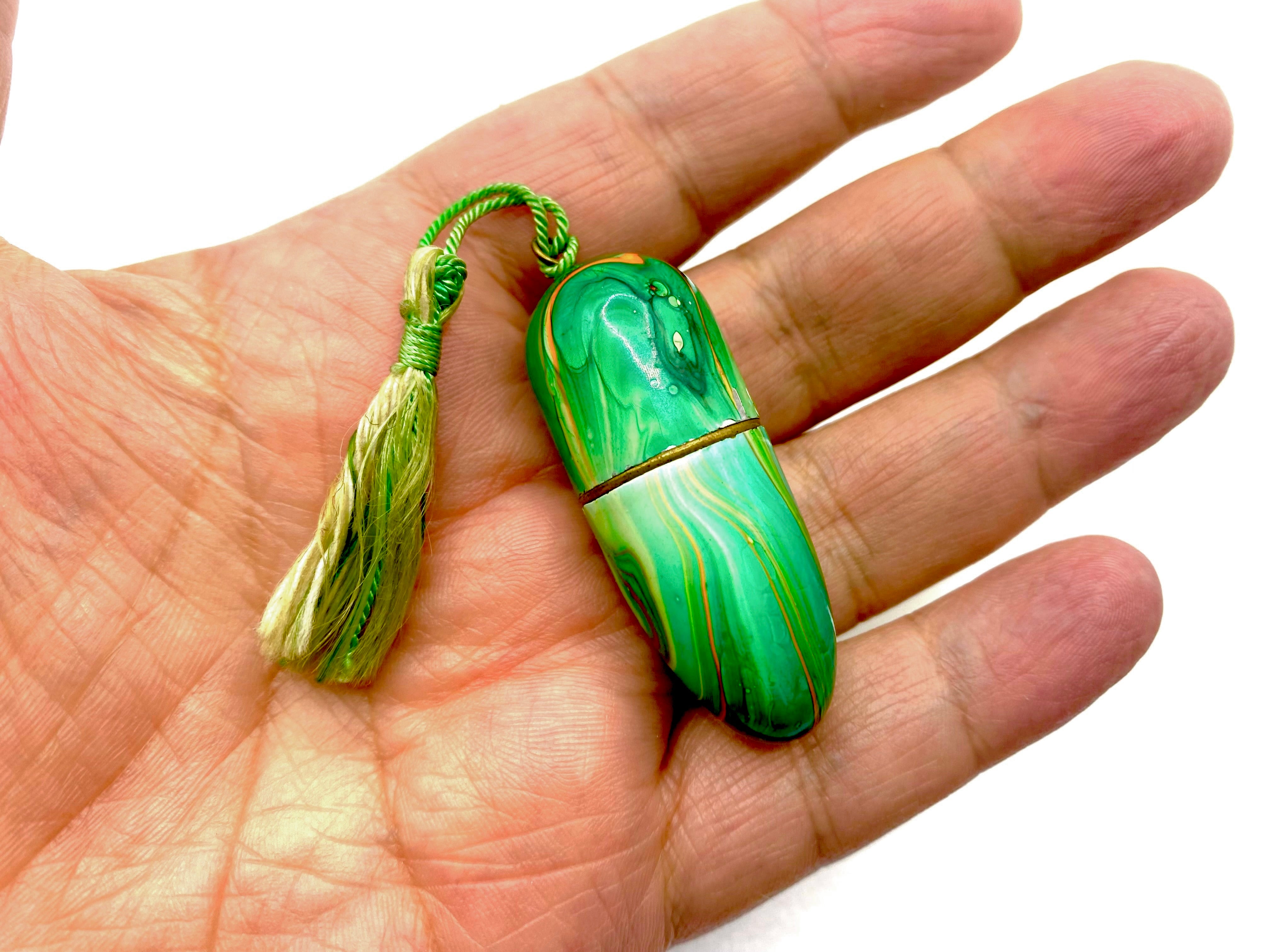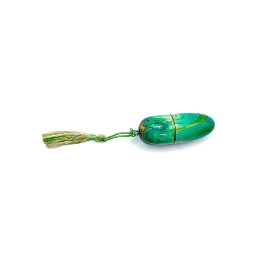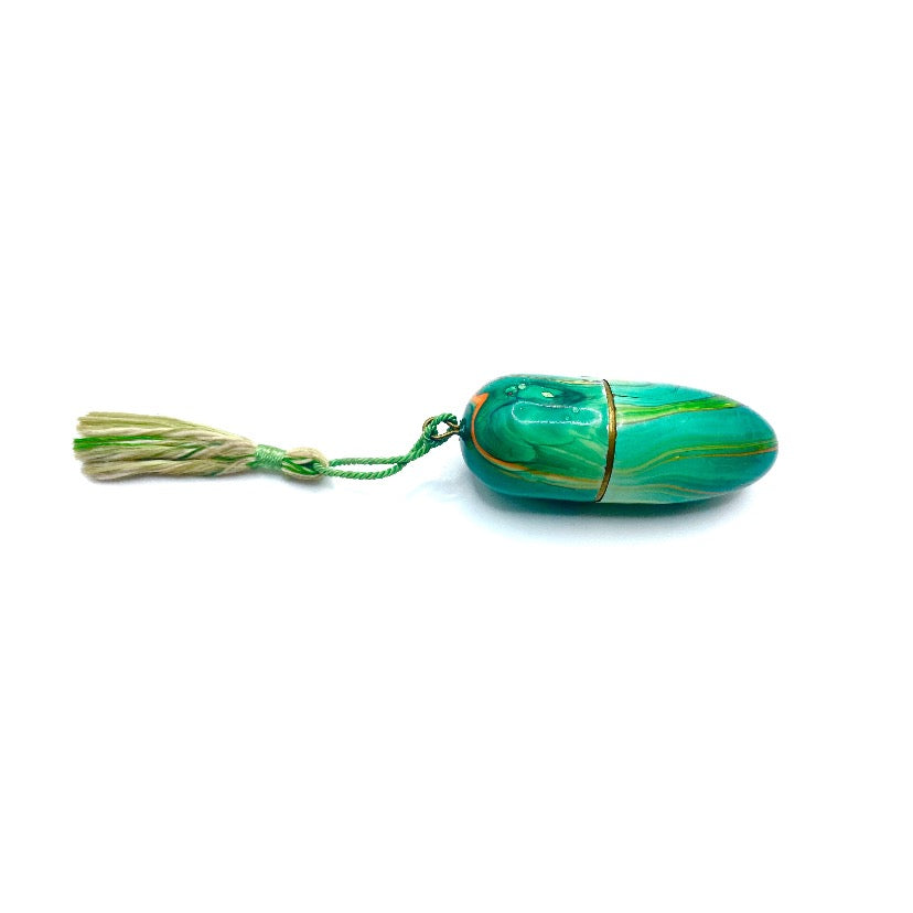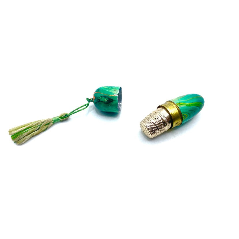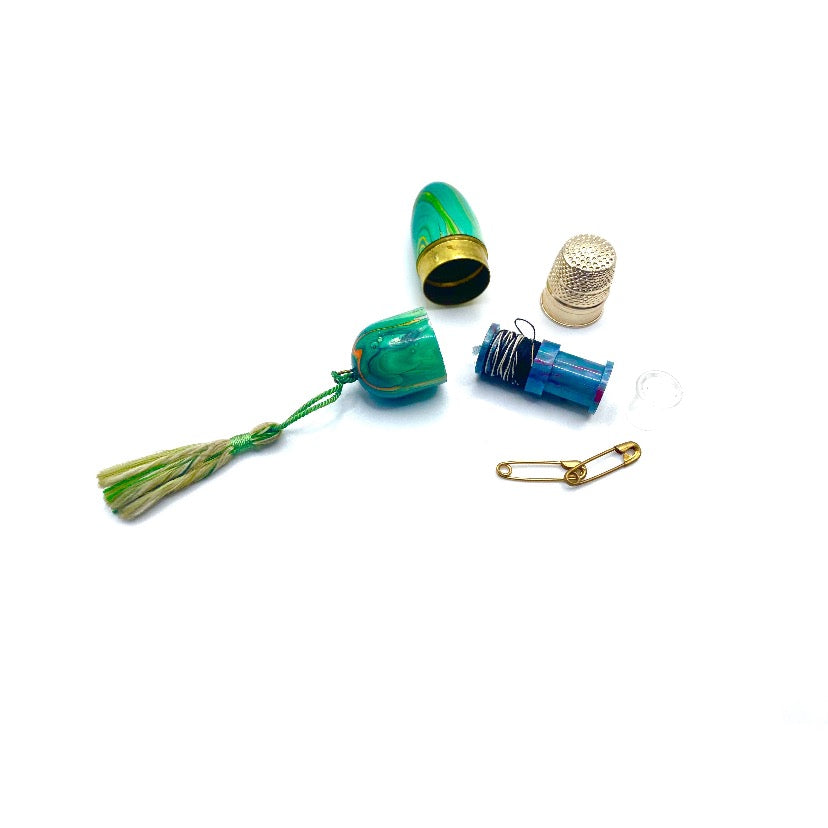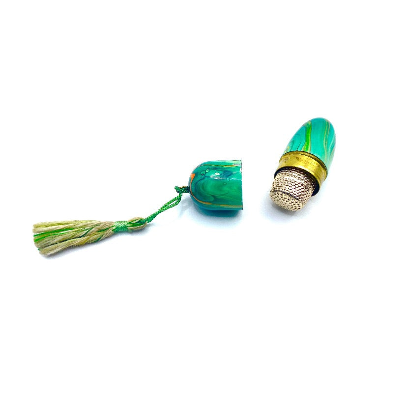 A whimsical swirled enamel sewing kit etui with original green silk tassel, circa 1930, Made in Germany The brass base etui multicolored in shades of green , yellow, blue and orange, opens to reveal a tiny sewing kit including thread on a spool with a place for needles under the cap and a aluminium thimble.