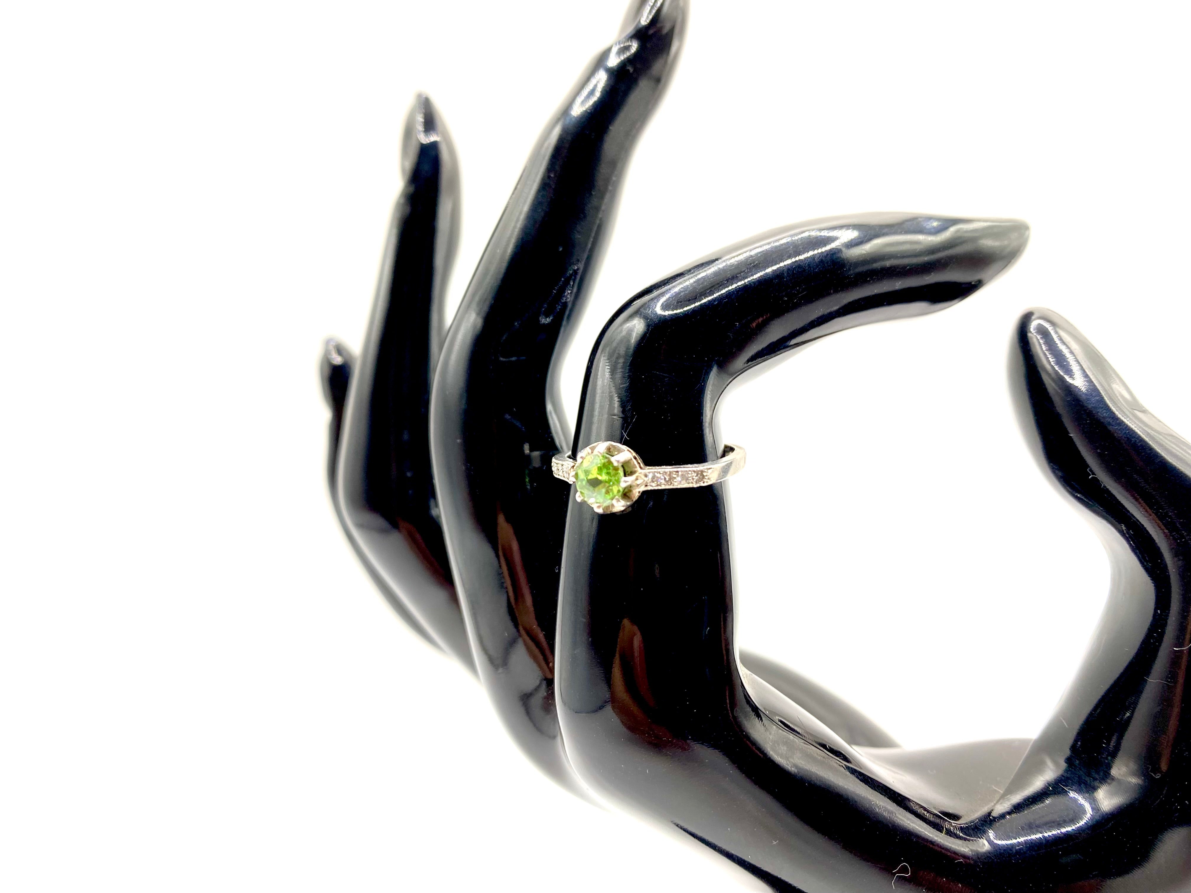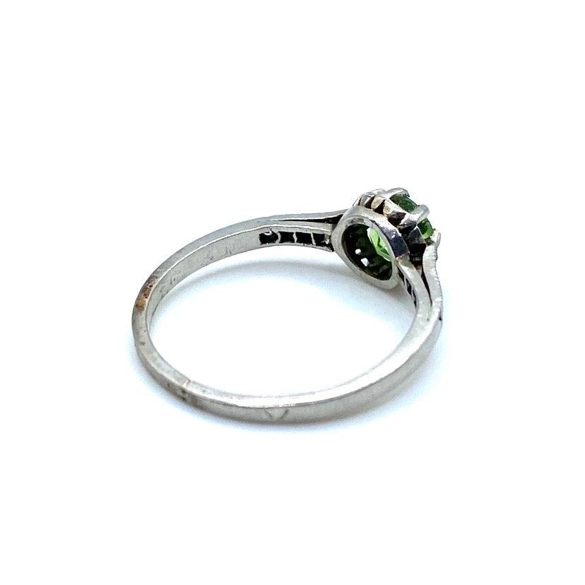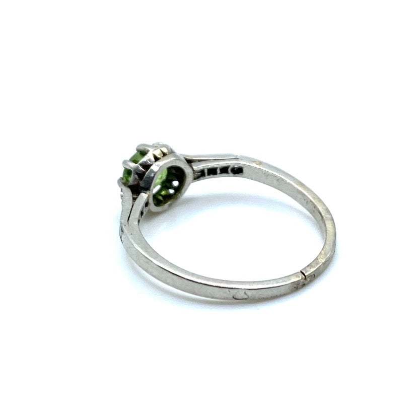 Antique, French 18k white gold ring decorated along the shoulders with diamonds and centered by a brilliant cut Peridot. Stamped along the outer band with French assay mark.
