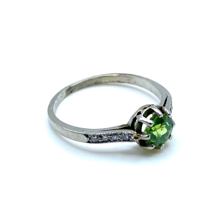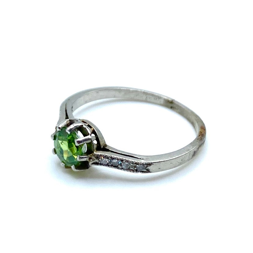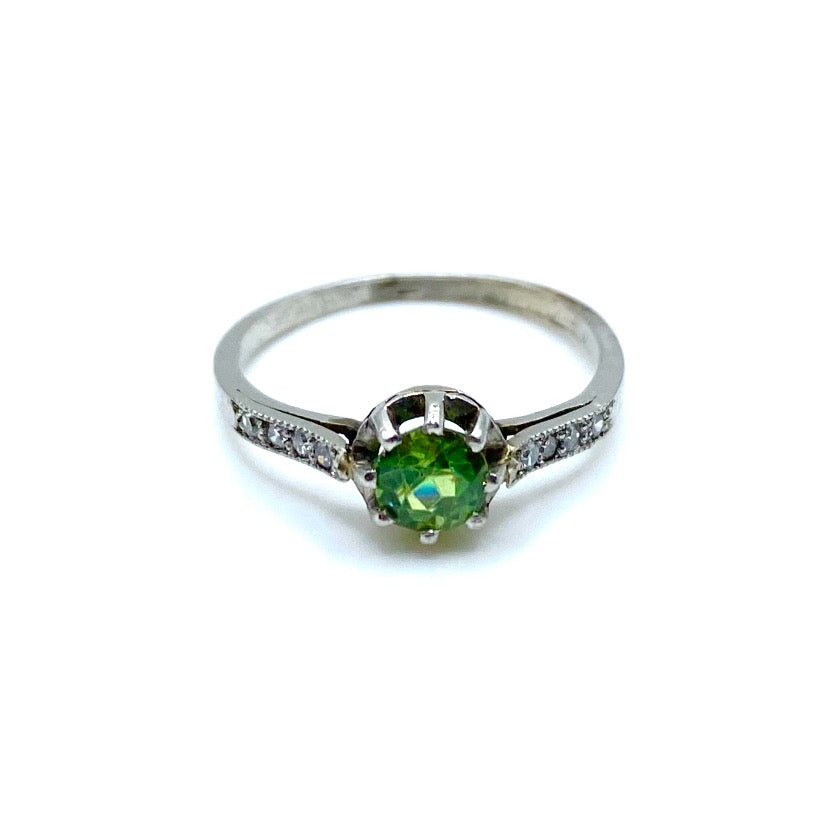 Antique, French 18k white gold ring decorated along the shoulders with diamonds and centered by a brilliant cut Peridot