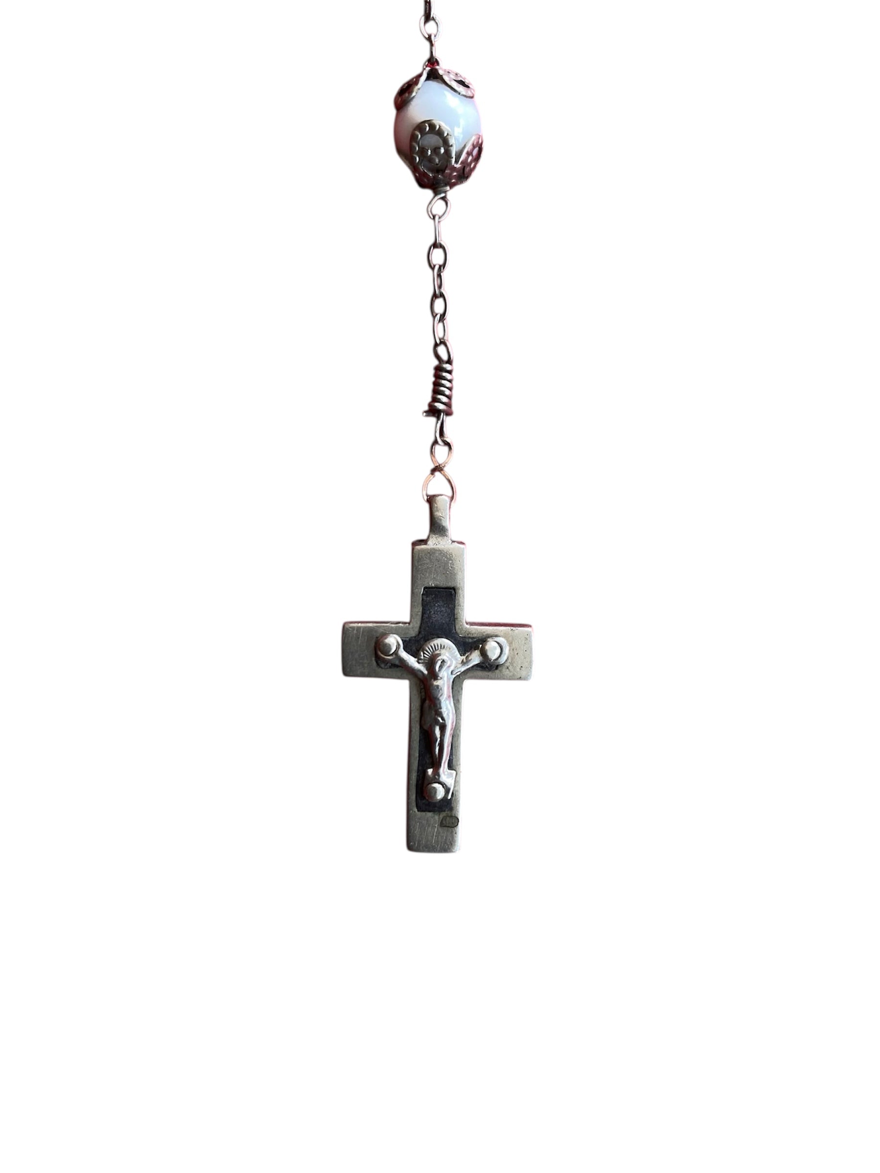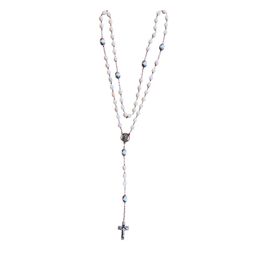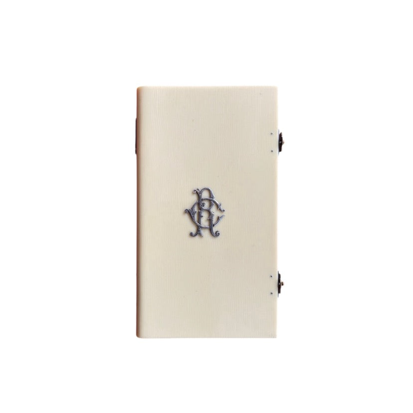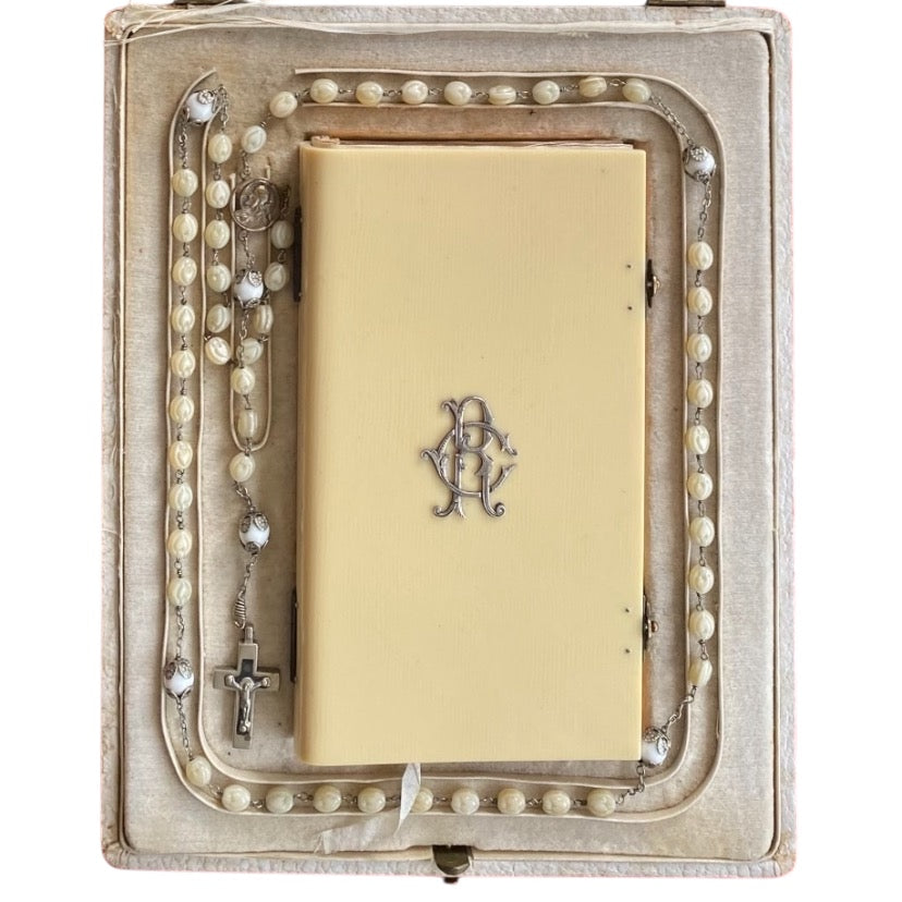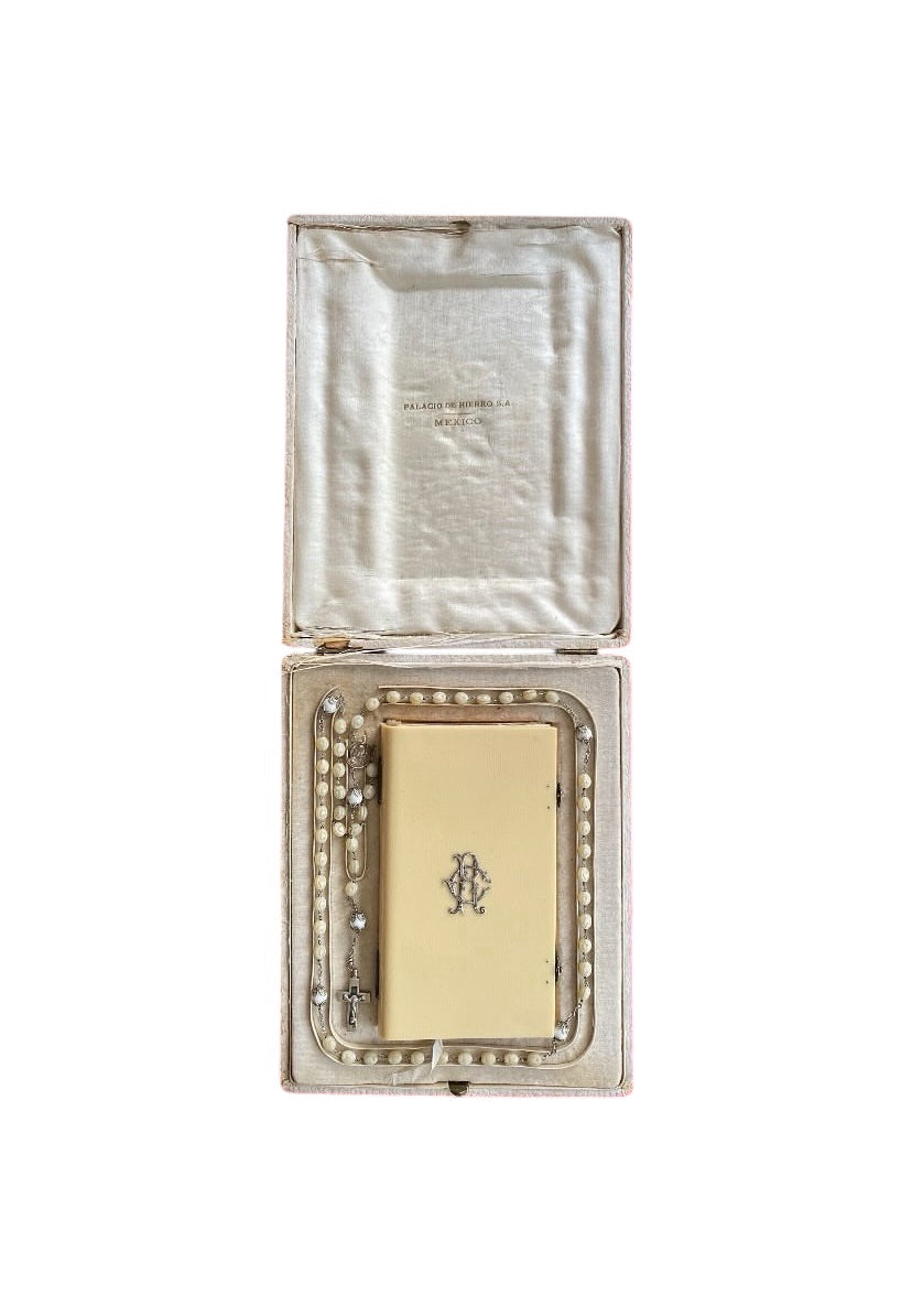 Antique prayer book OFICIOS DIVINO DEL DOMINGO by D.J.A. de LAVALLE PARIS, printer and publisher Déjardin. Hardcover binding made of bone and silver lettering on the cover, comes with a mother-of-pearl and silver rosary, all in its original box from PALACIO DE HIERRO S.A. MEXICO
