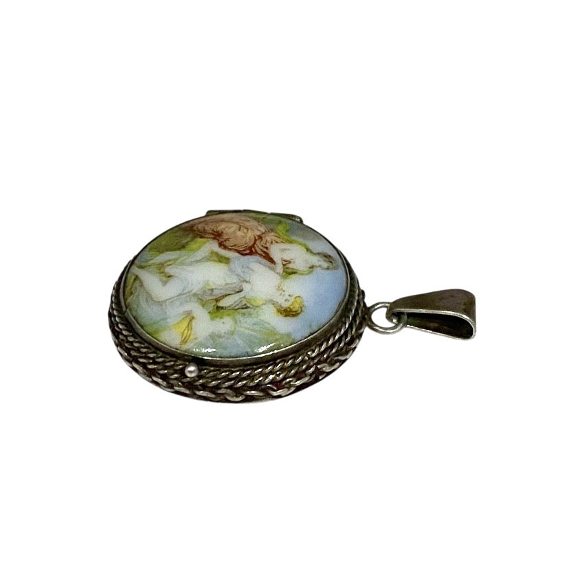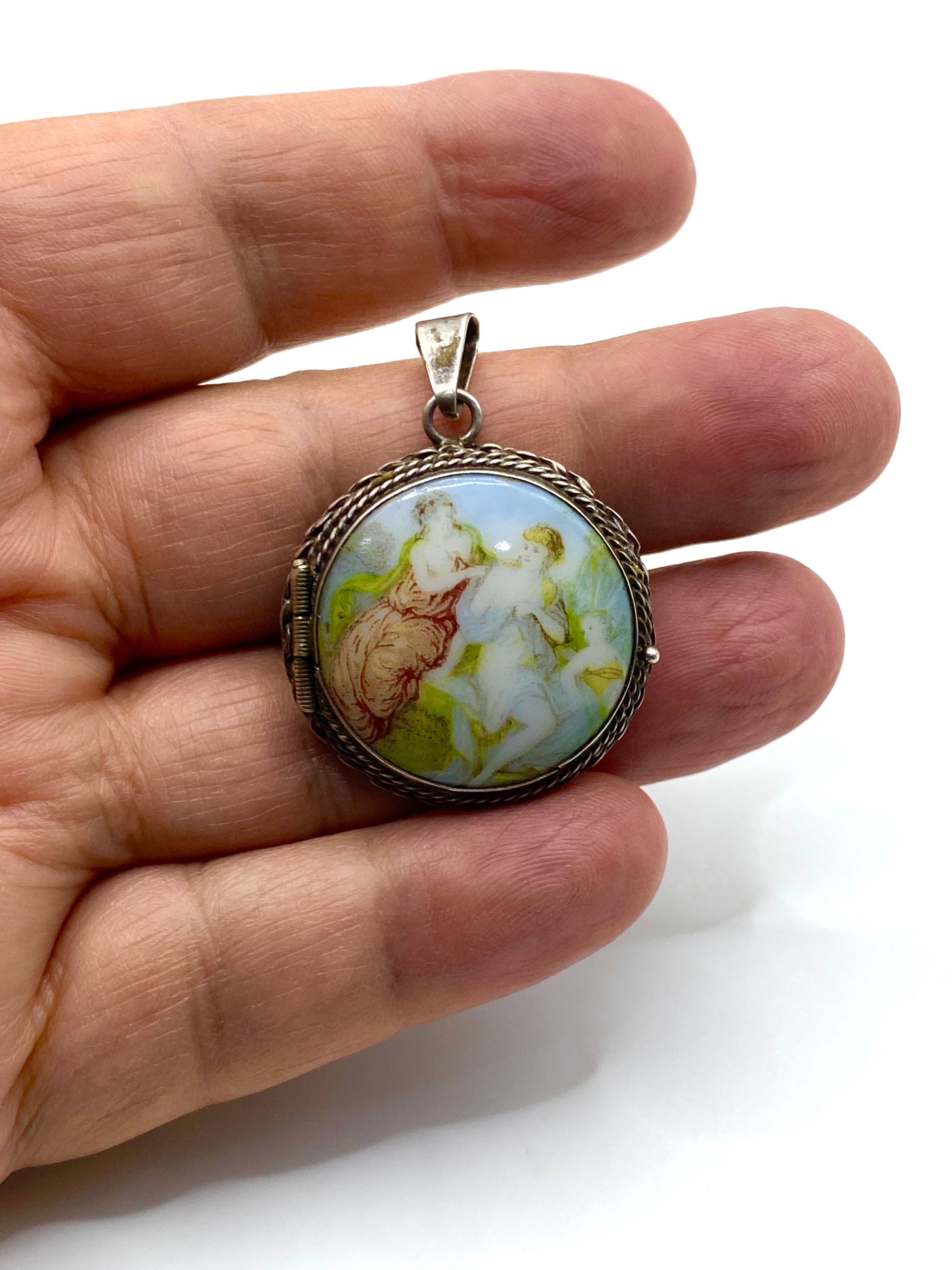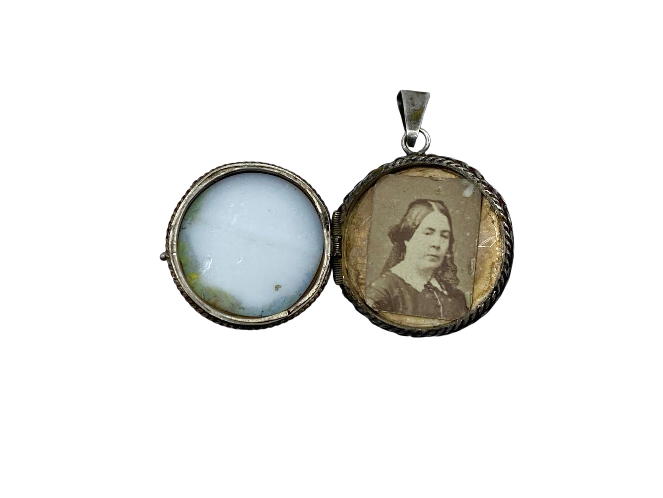 Antique silver locket / reliquary with a hand-painted miniature porcelain image, inside a photo of a woman.