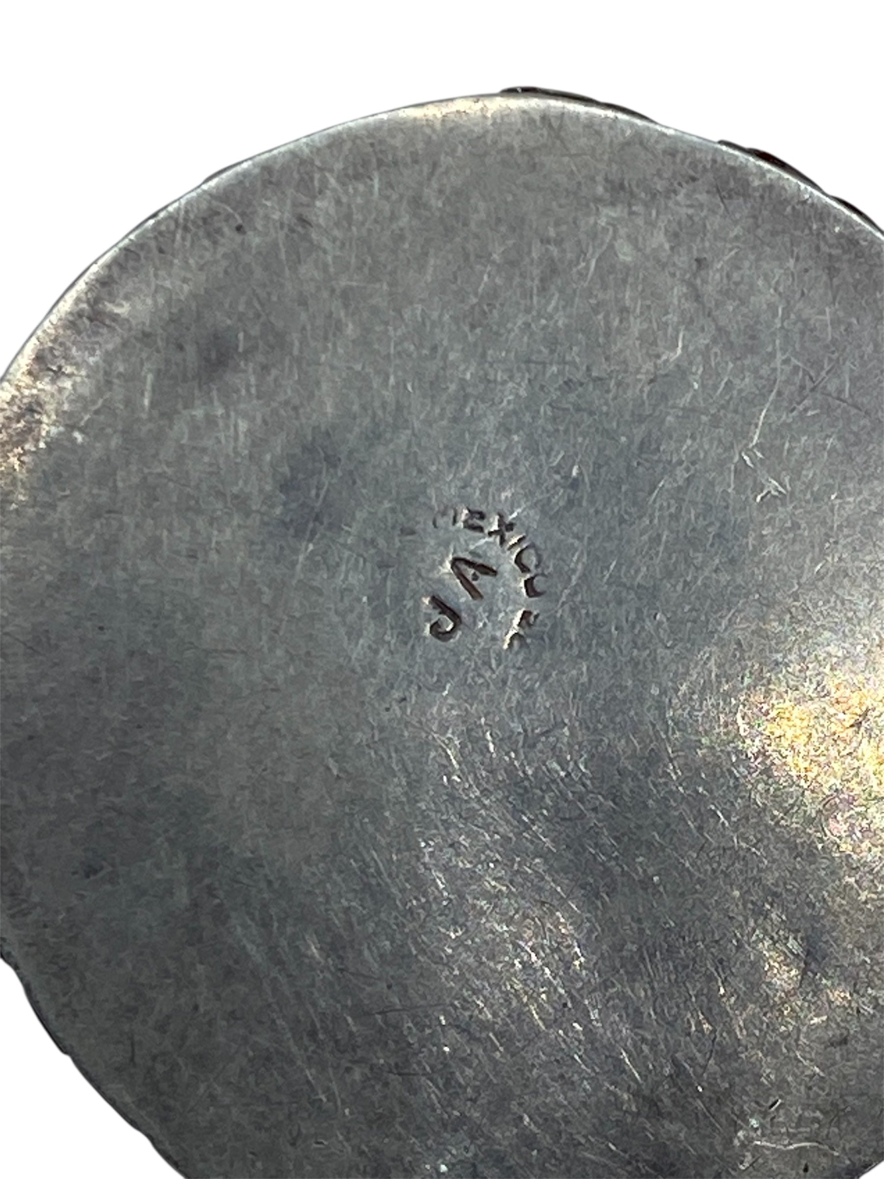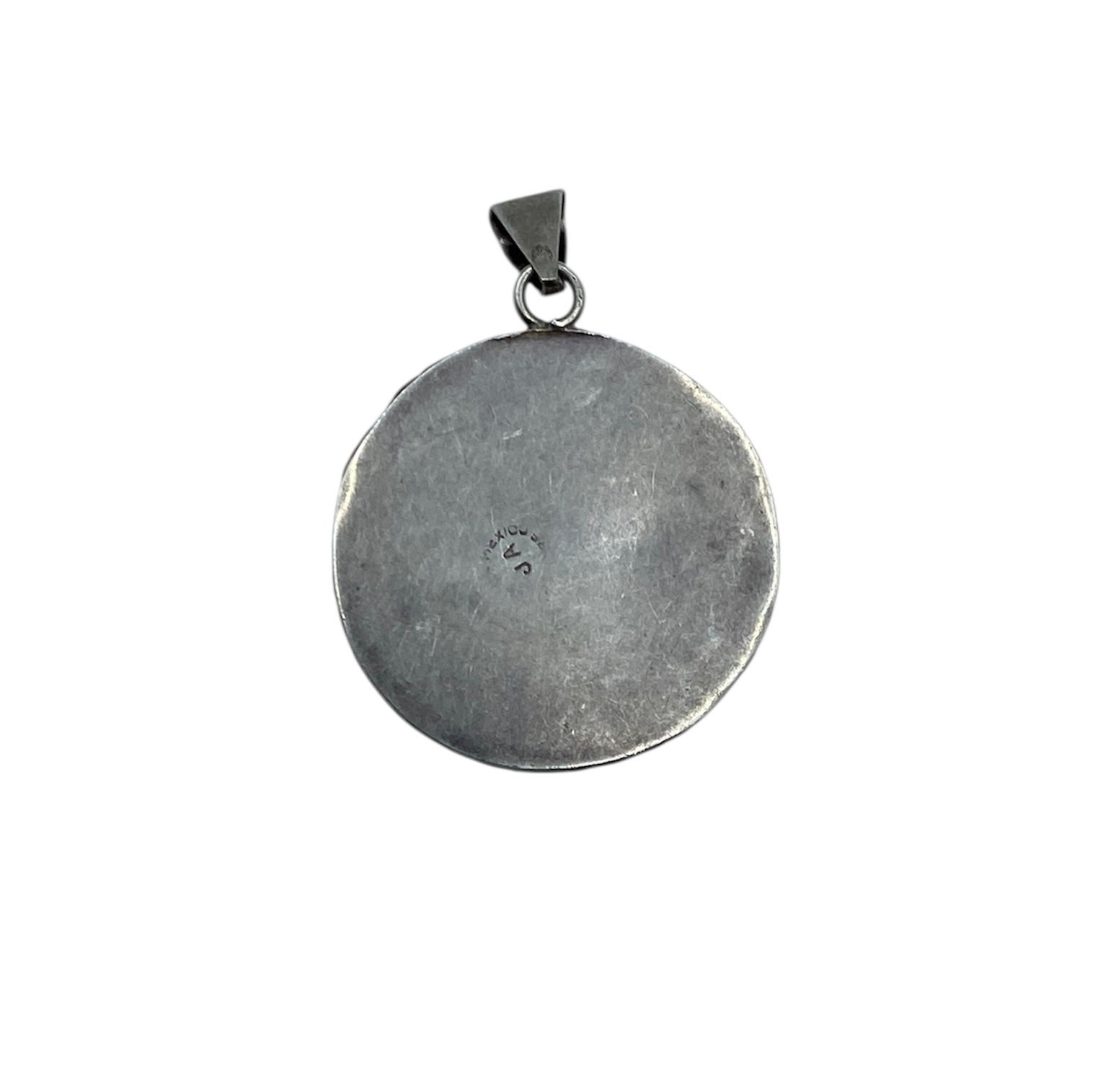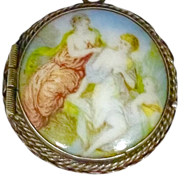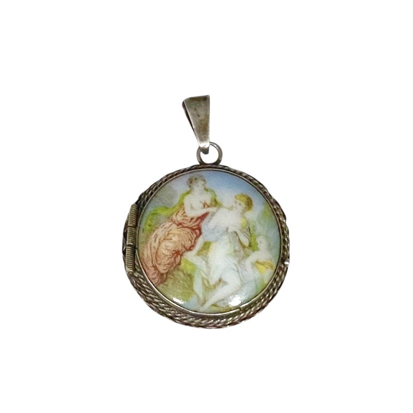 Antique silver locket / reliquary with a hand-painted miniature porcelain image, inside a photo of a woman.