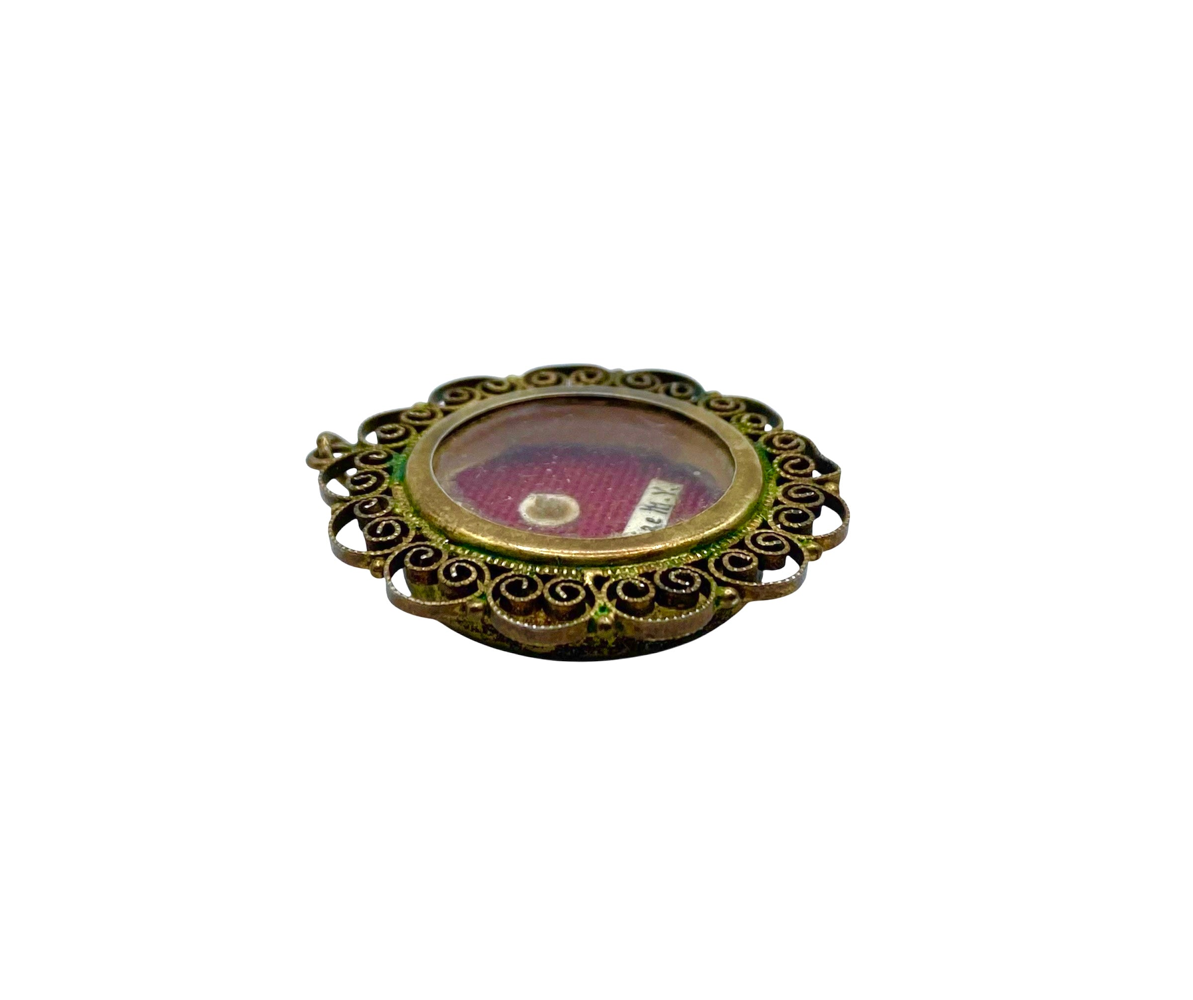 Centering the relic on red silk, labeled "S. Lusize M.Y.", set in a scrolled edge, 800 silver gilt pendant mounting.