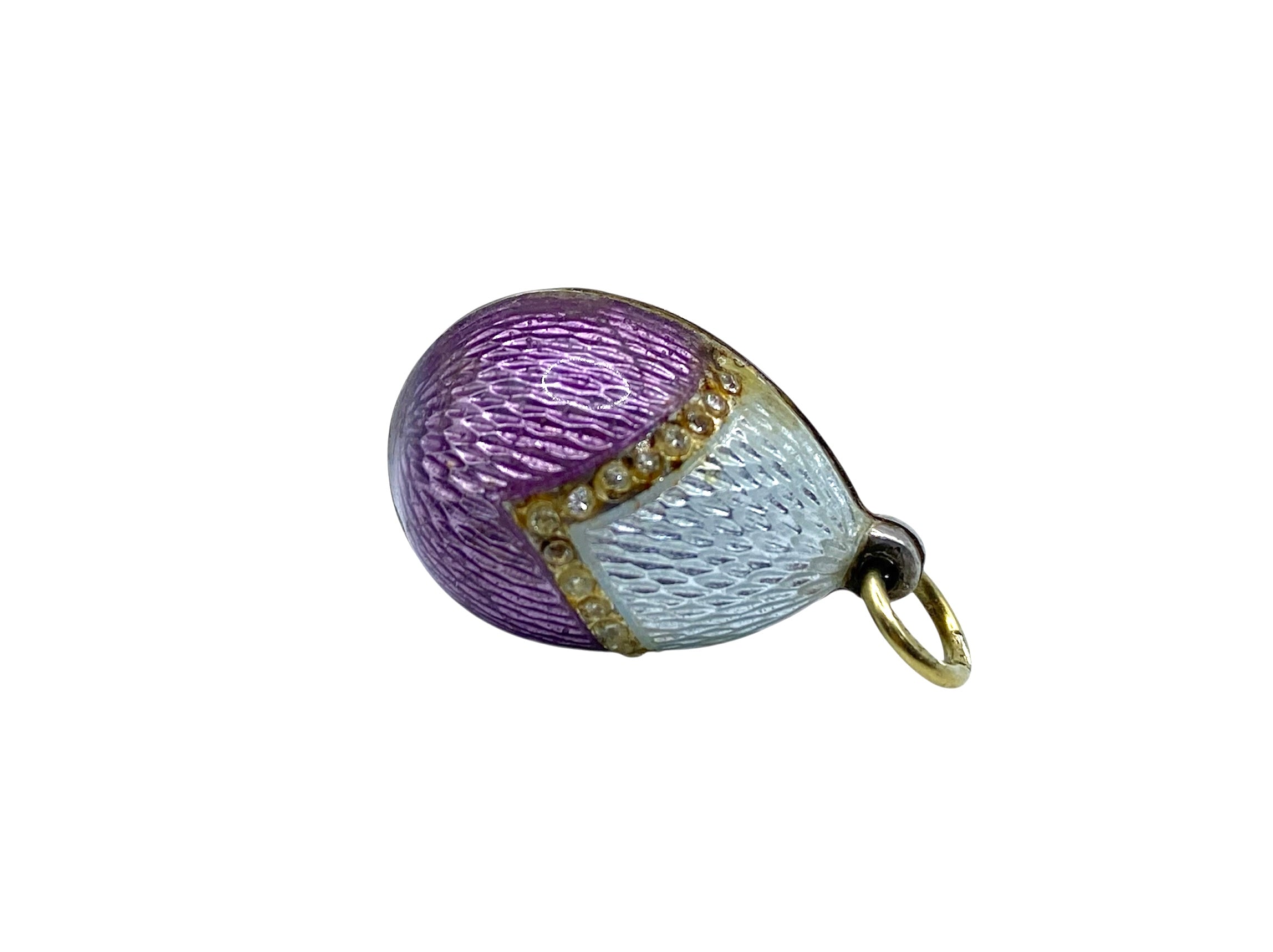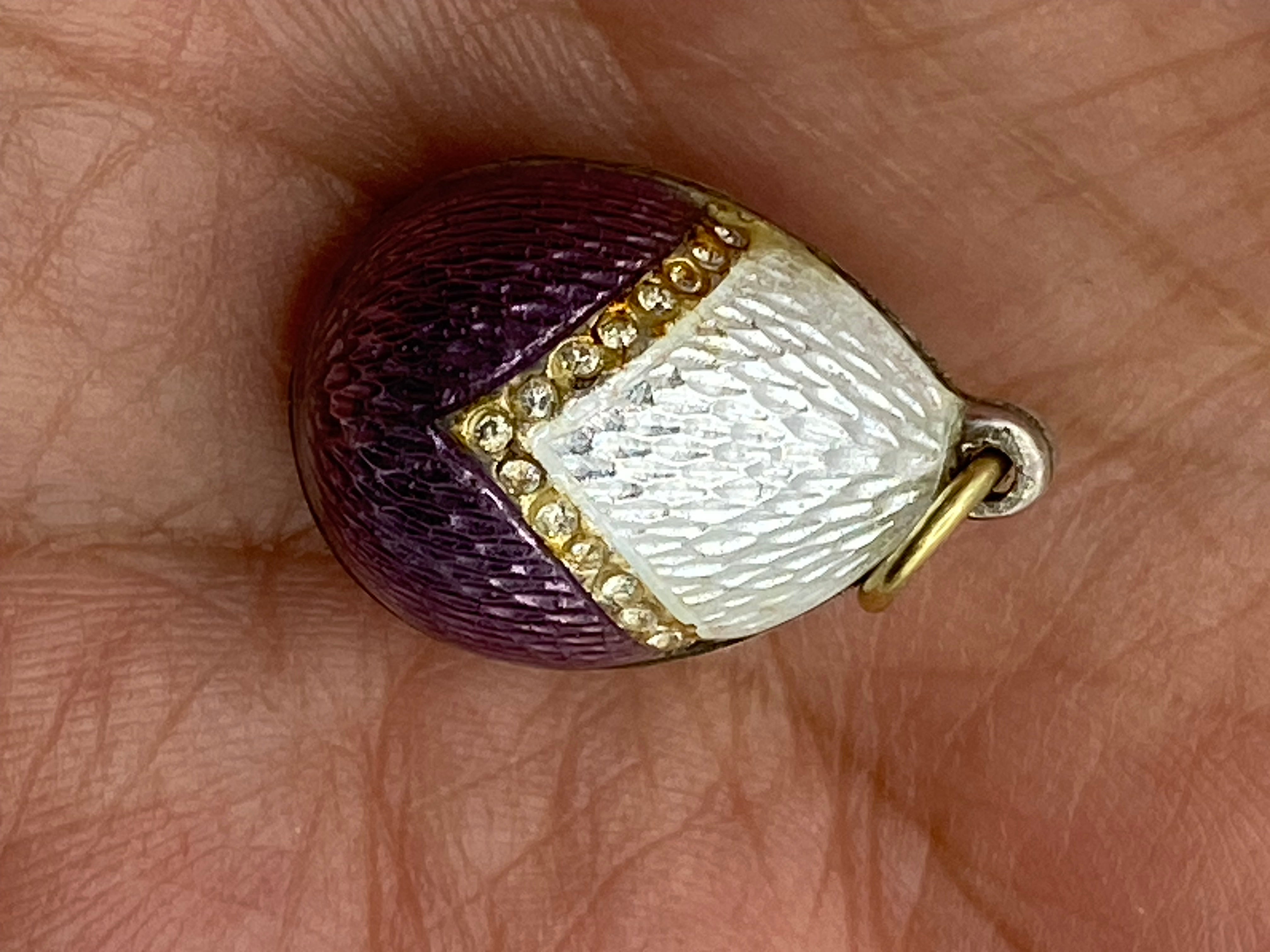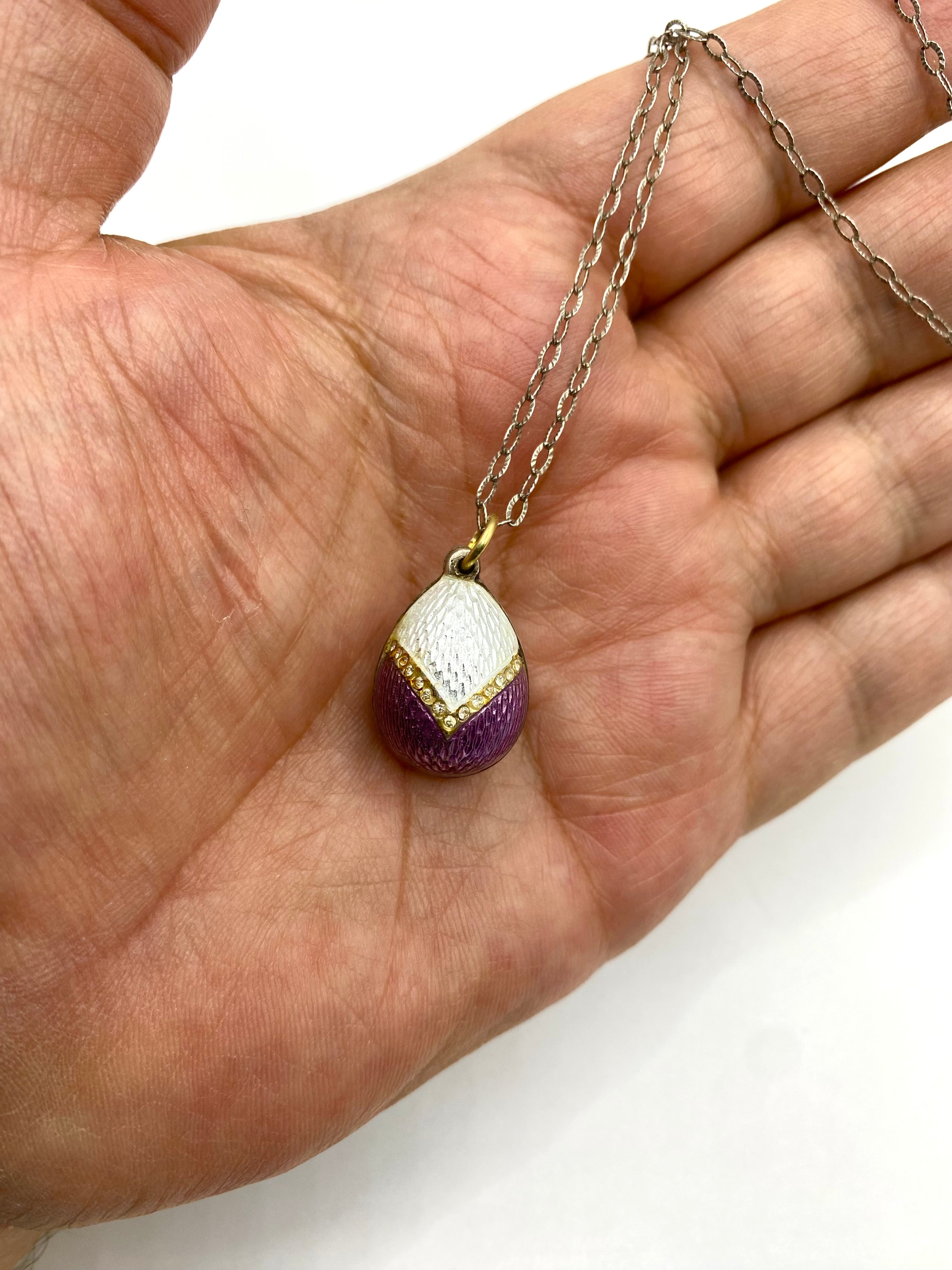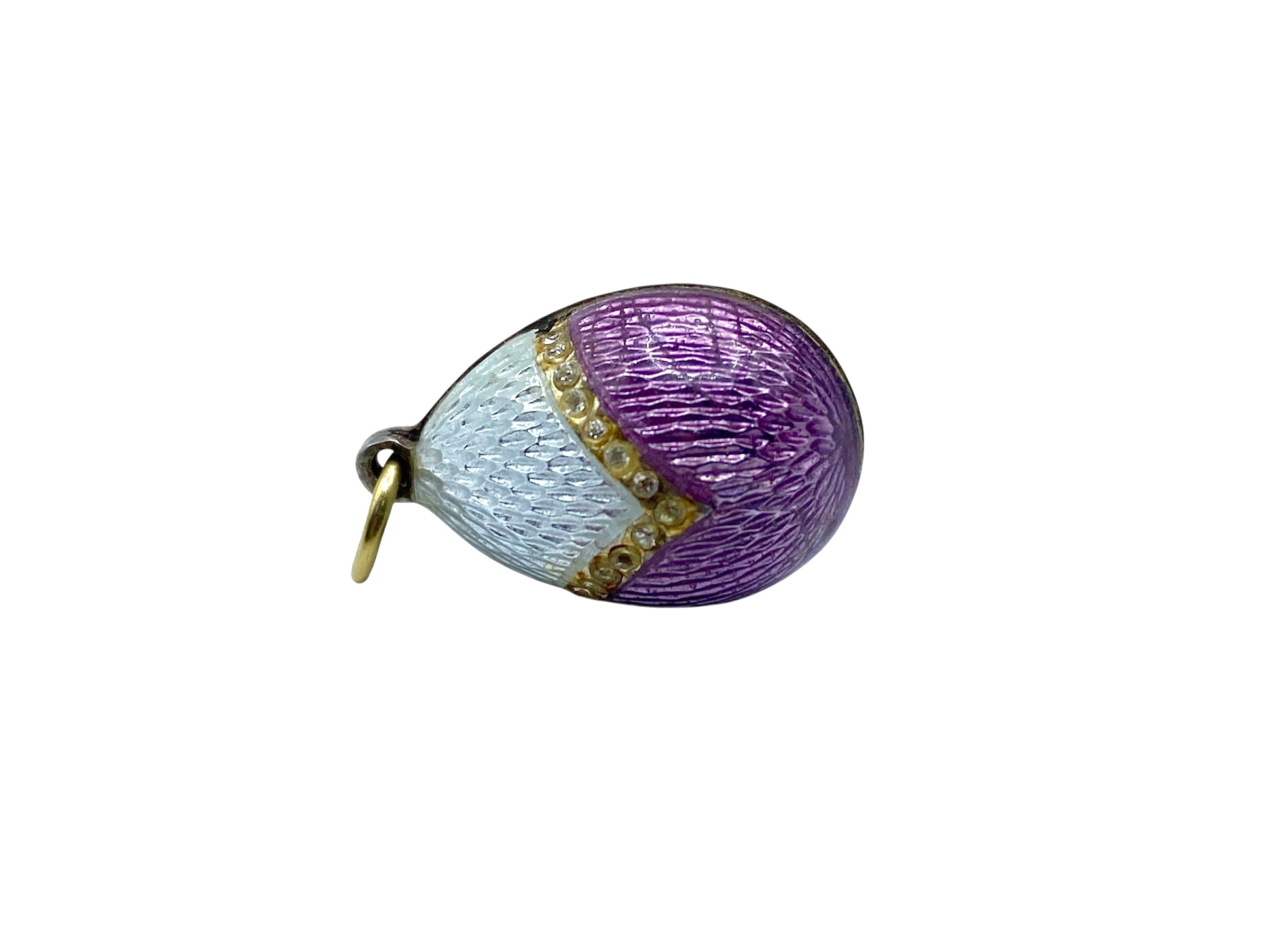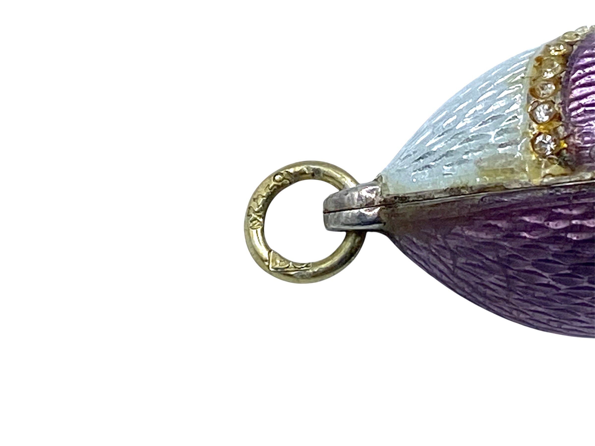 Antique Sterling silver, Russian Imperial Guilloche Enamel Egg Pendant in white and purple shades, and encrusted with diamonds by Fabergé master Phillip Theodore Ringe.