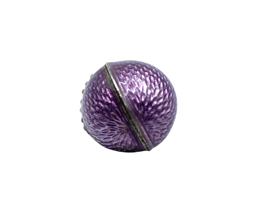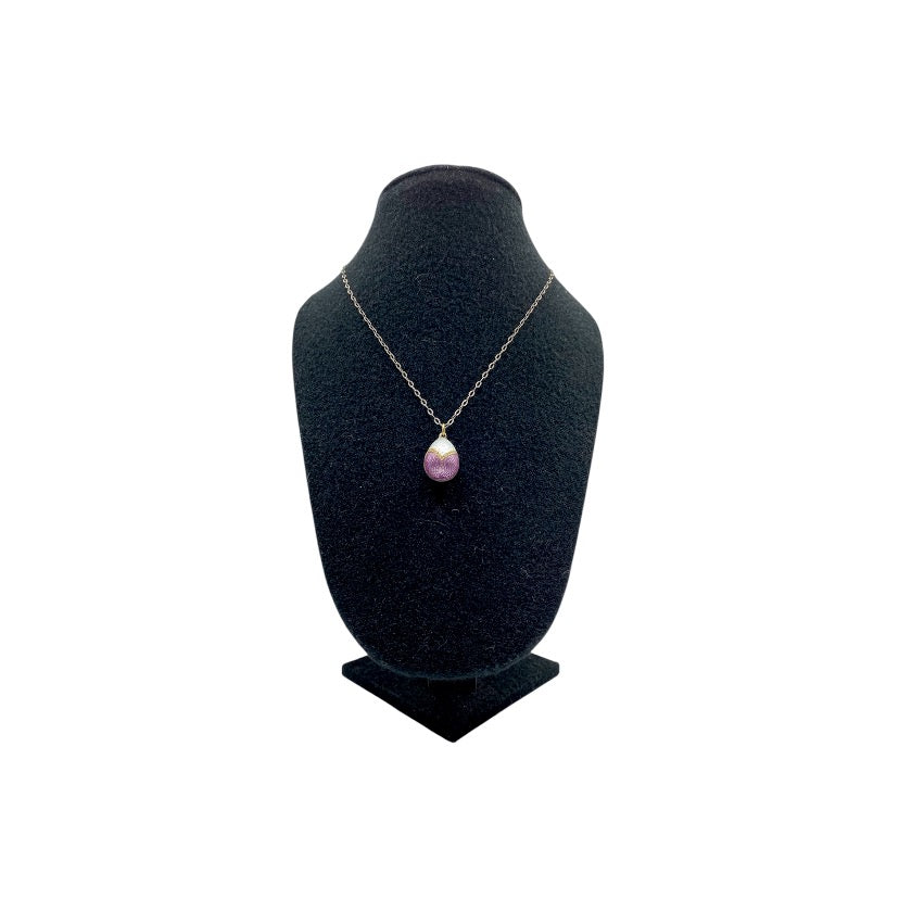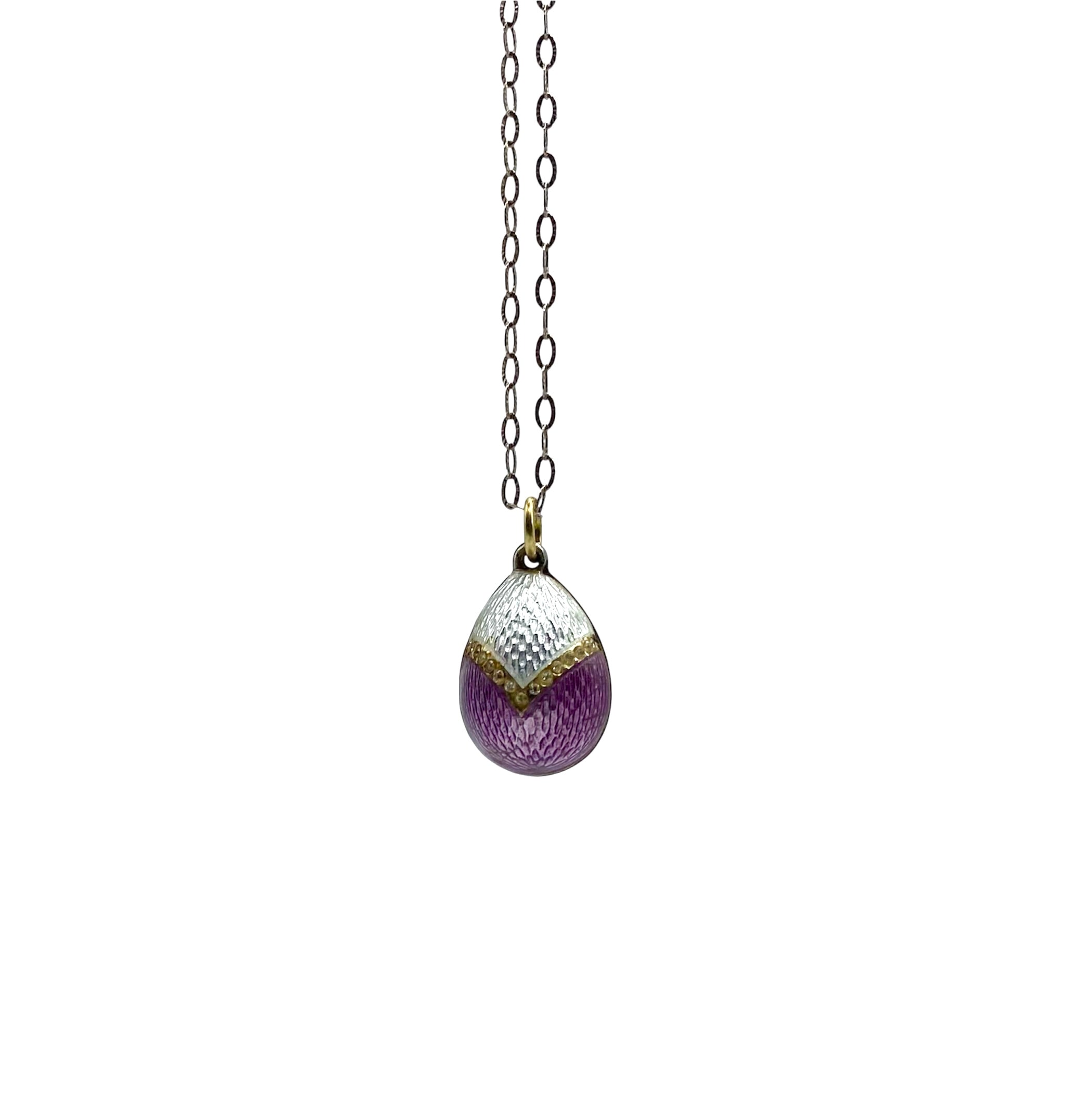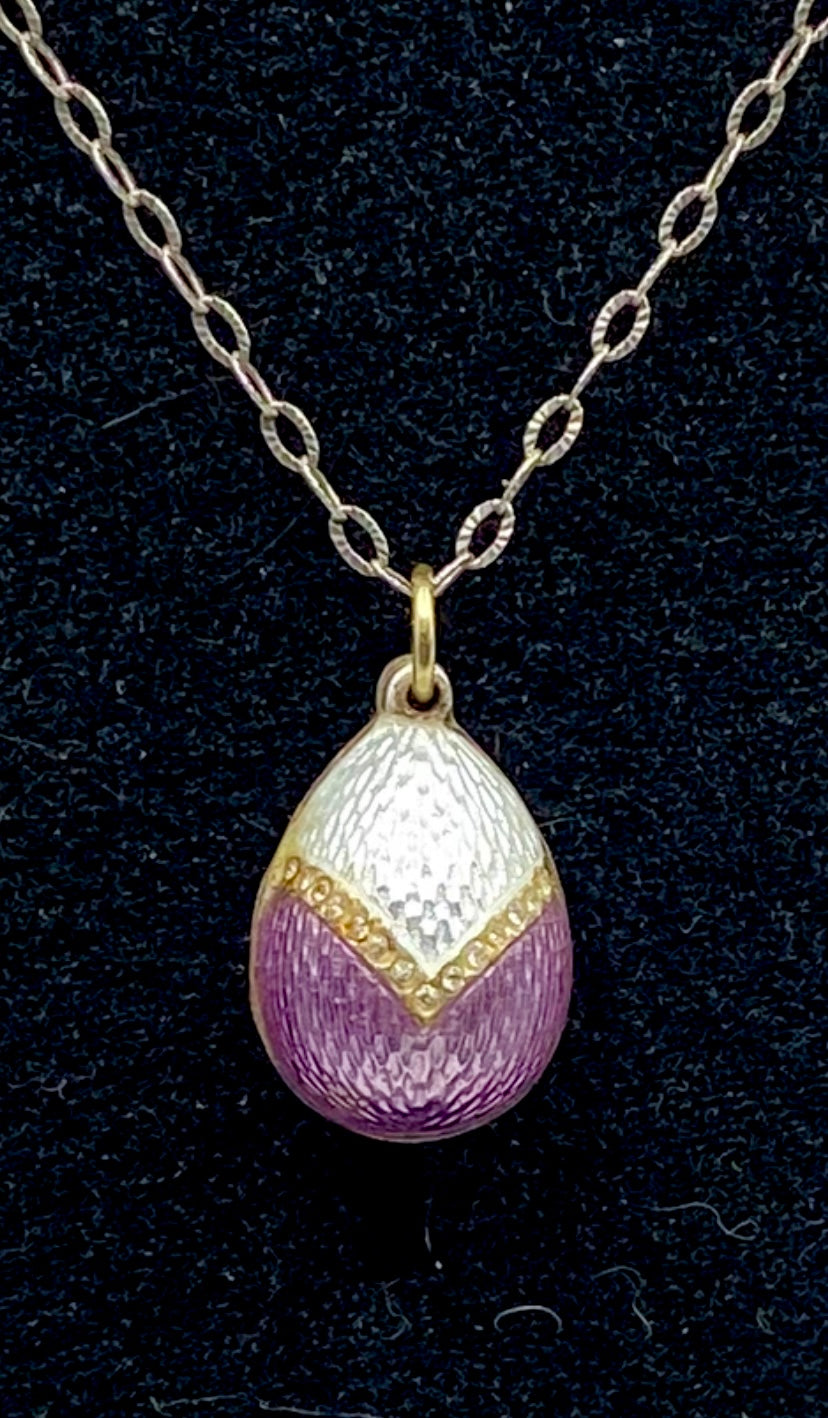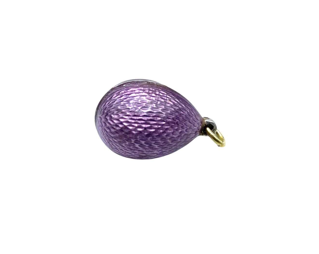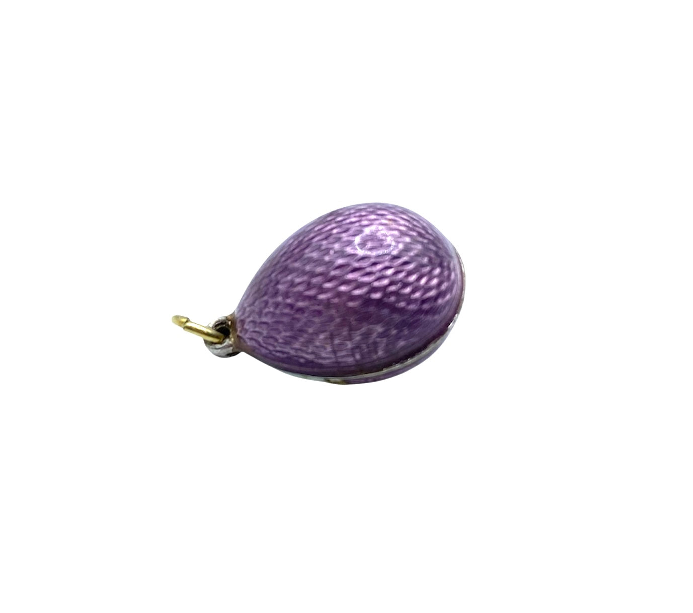 Antique Sterling silver, Russian Imperial Guilloche Enamel Egg Pendant in white and purple shades, and encrusted with diamonds by Fabergé master Phillip Theodore Ringe.