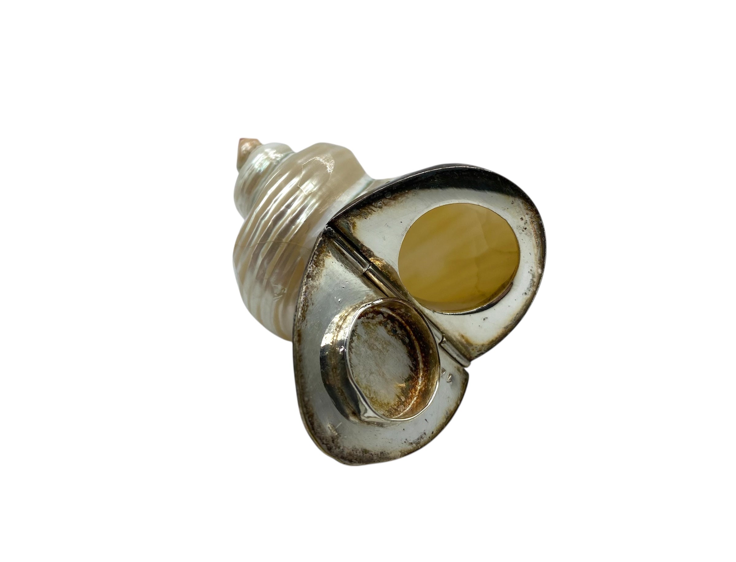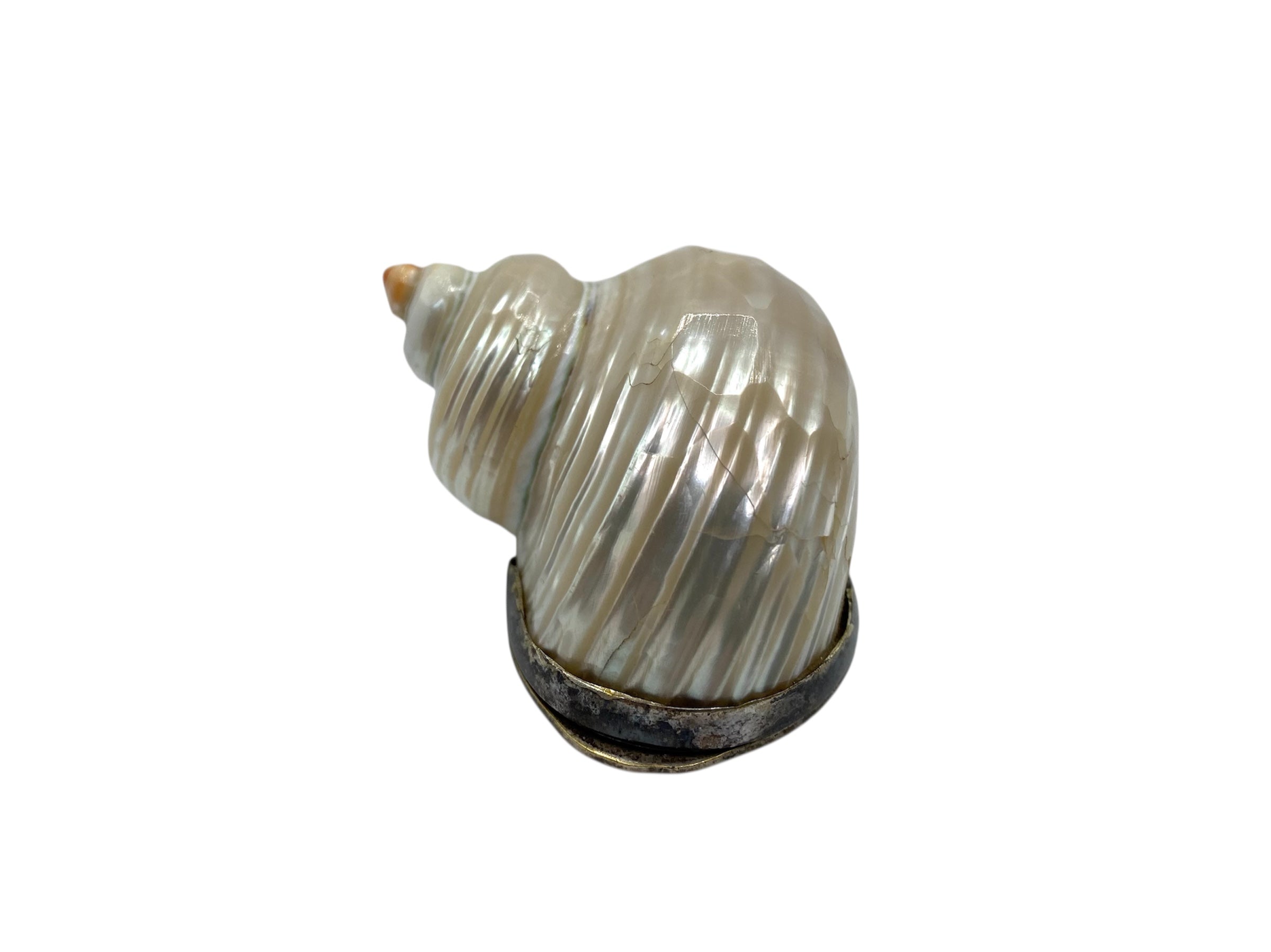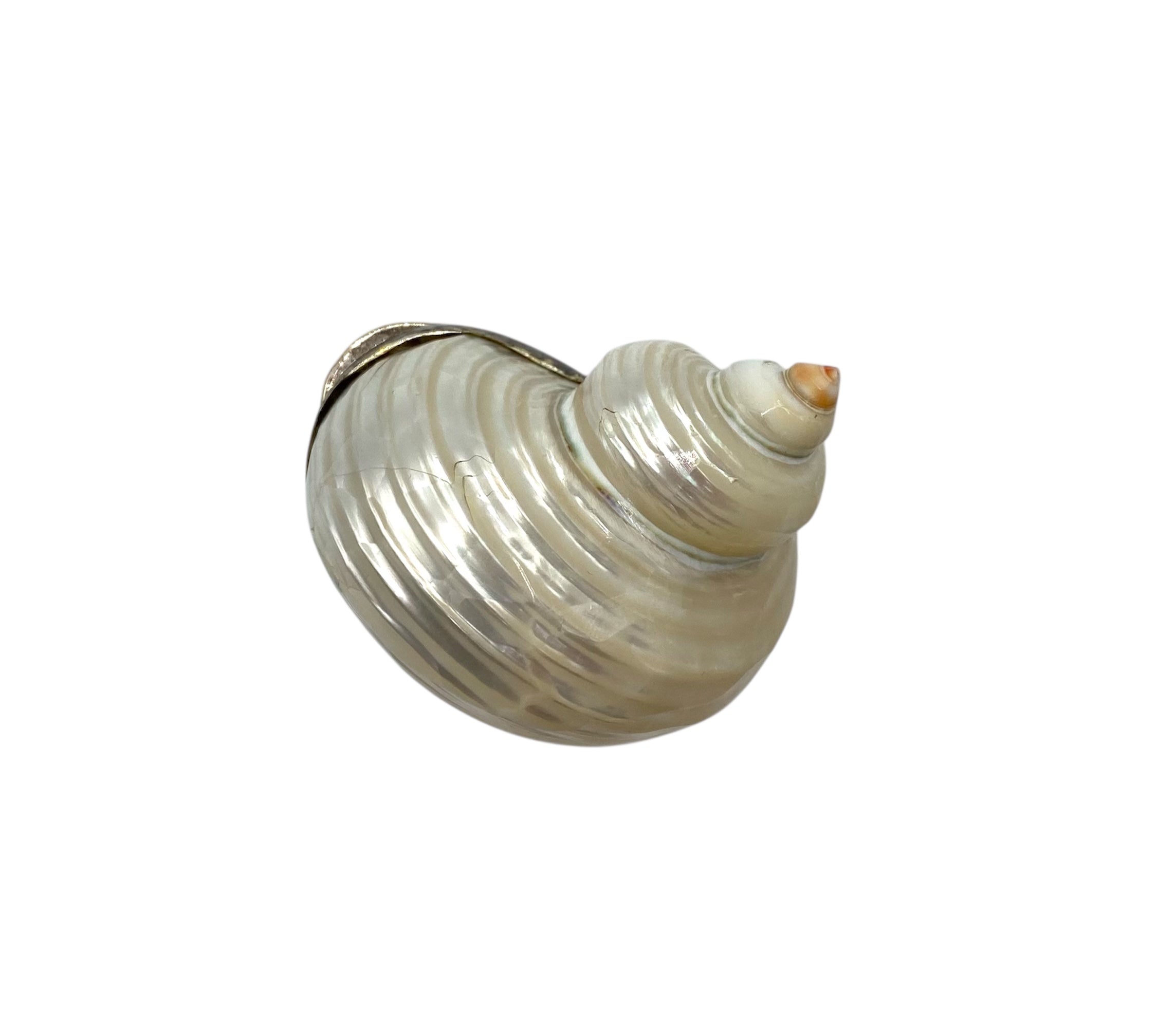 Antique Turbo Shell Snuff &/or Pill Box. Is a creamy white w/ light silvery and golden pearly hues and some rainbow reflective hues also. It has a Sterling Silver Cap.