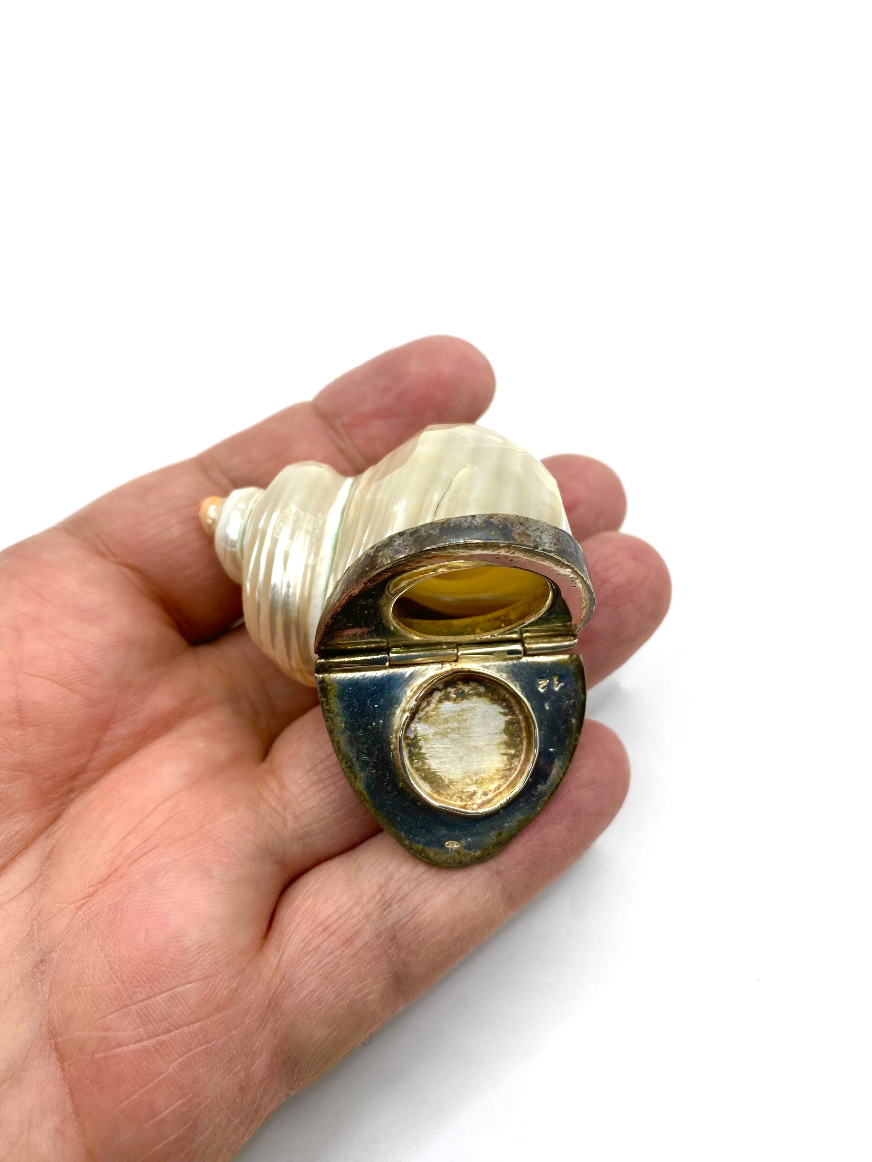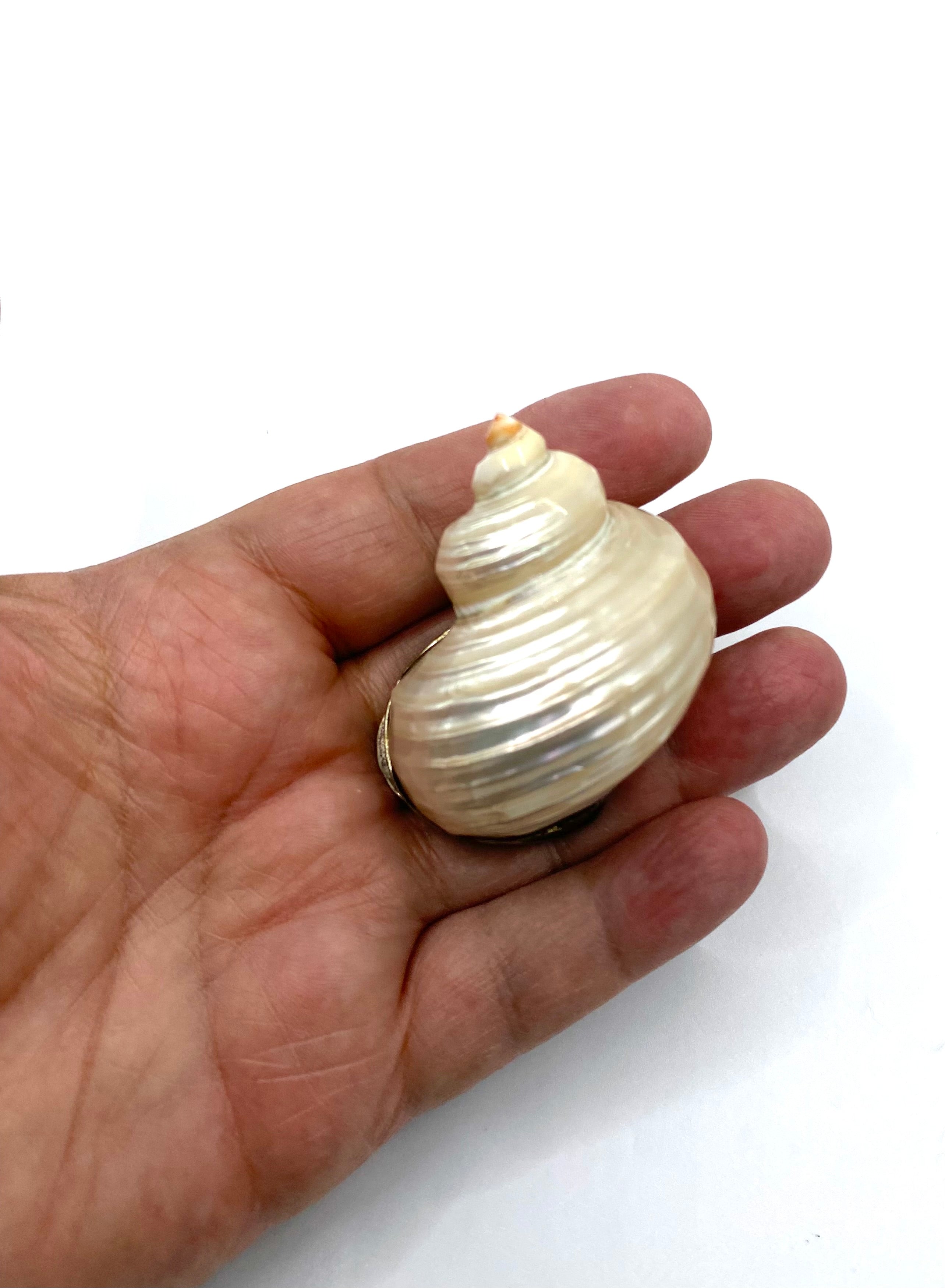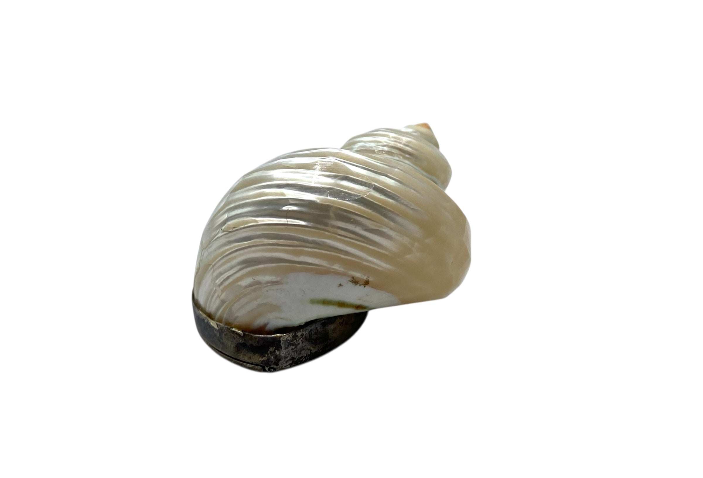 Antique Turbo Shell Snuff &/or Pill Box. Is a creamy white w/ light silvery and golden pearly hues and some rainbow reflective hues also. It has a Sterling Silver Cap.