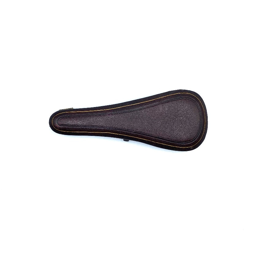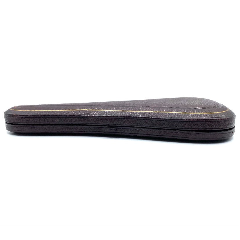 Scissors have ornate design on handles and finger holds. Utensil presented in its own case with felt lining