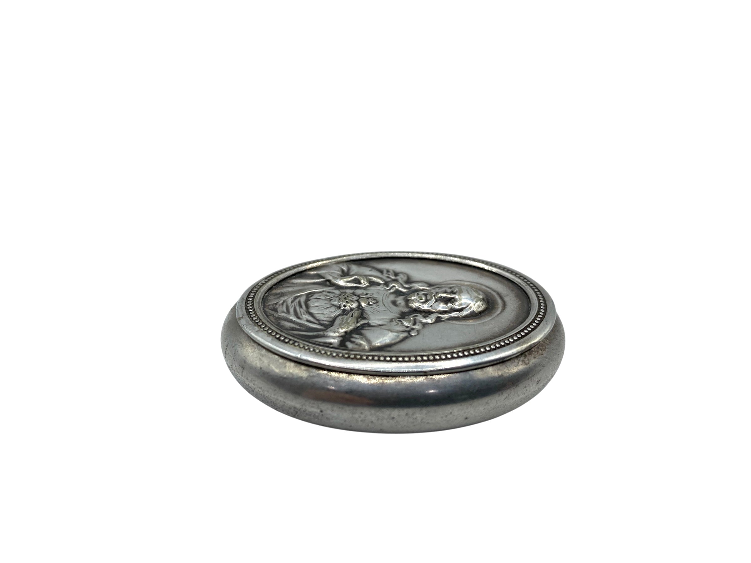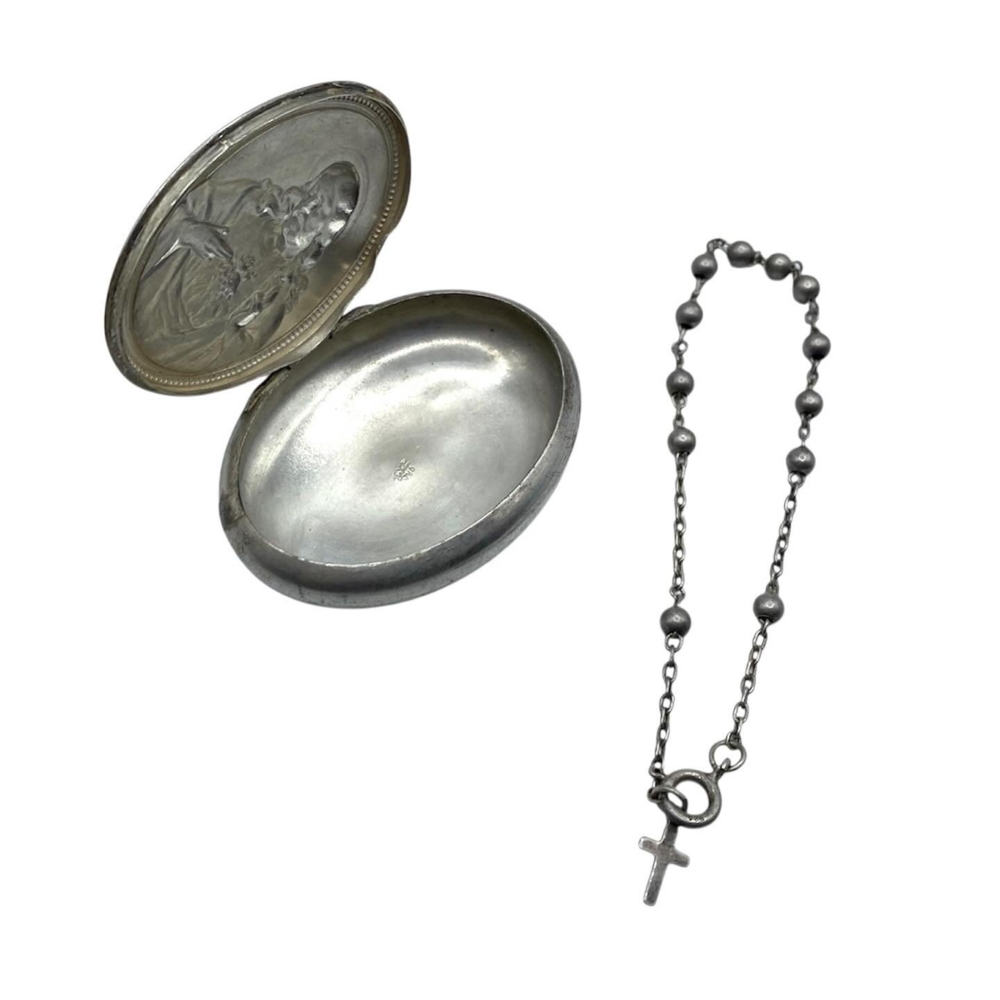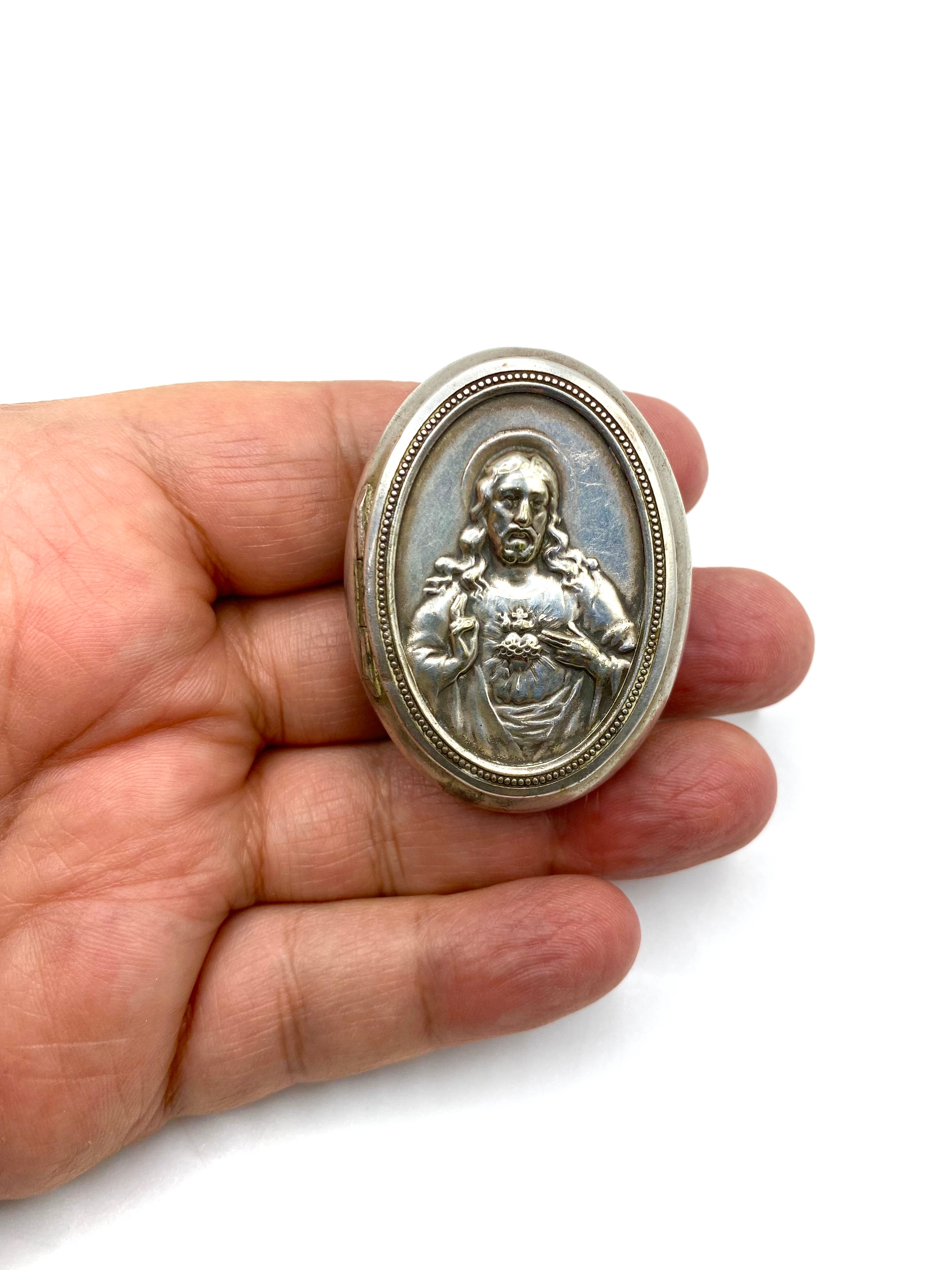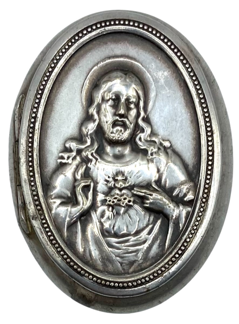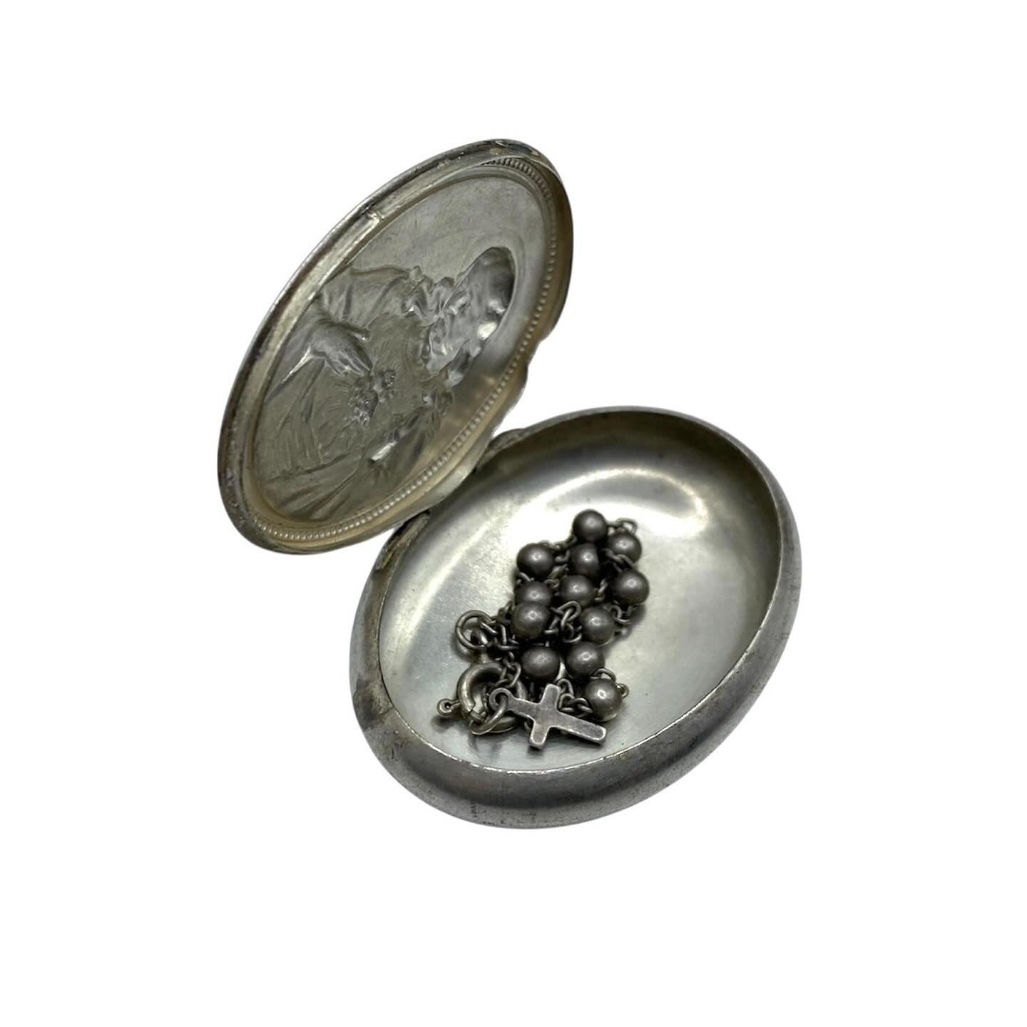 Beautiful Antique “Sacred Heart of Jesus” Nickel silver Rosary Box with Tiny Rosary