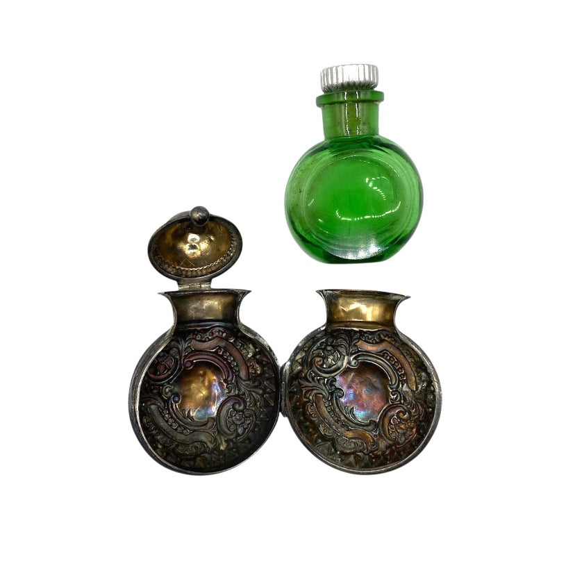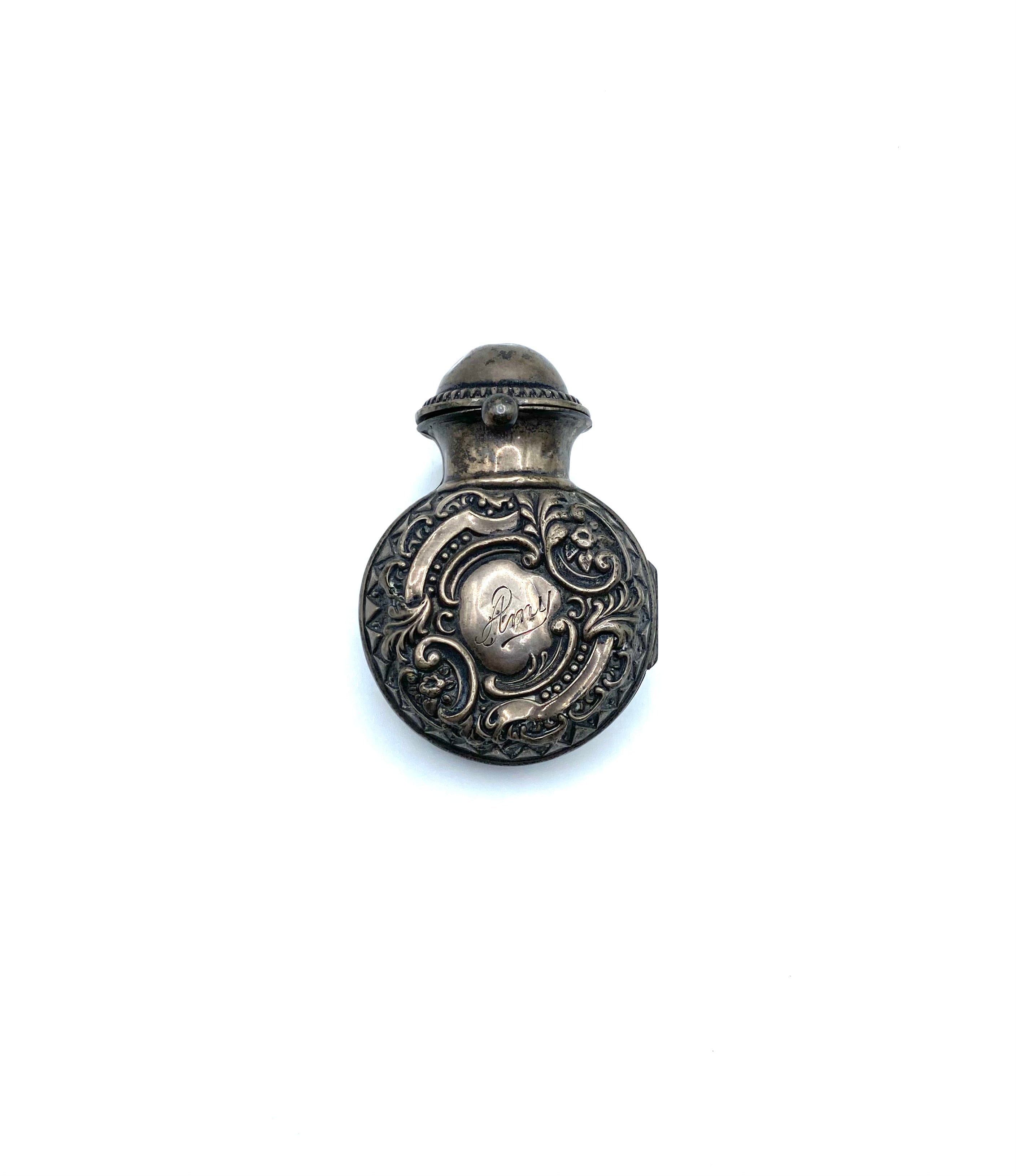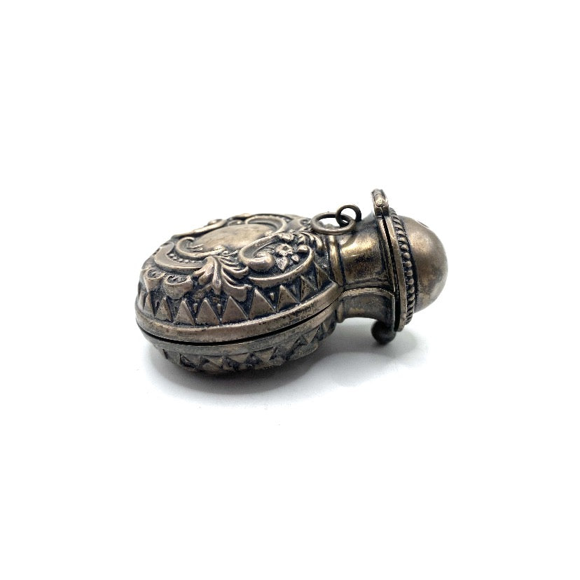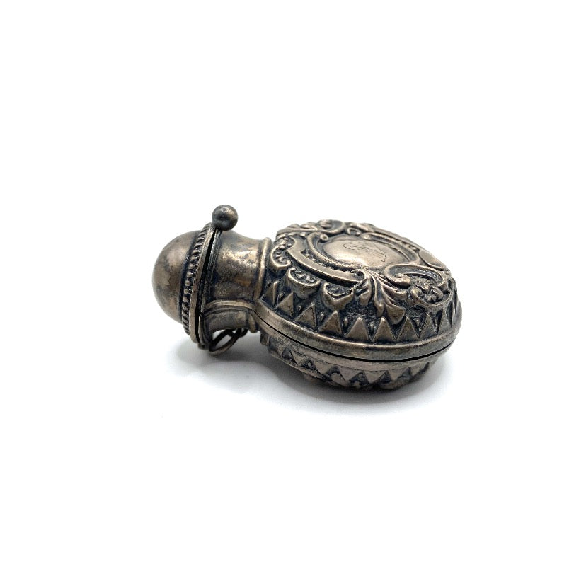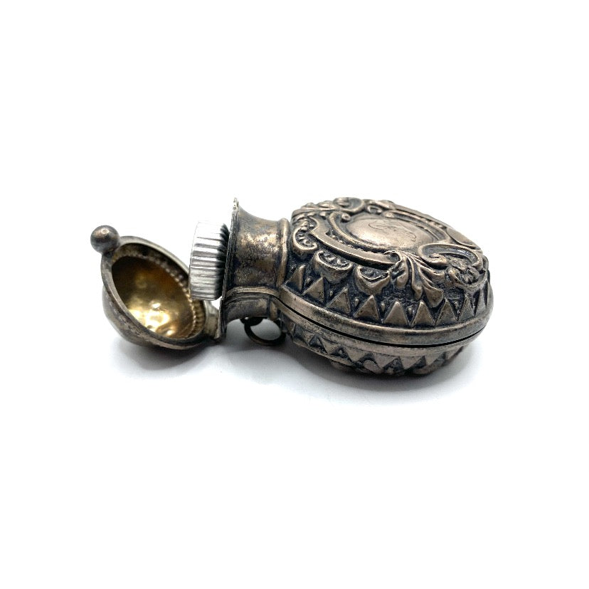 Sterling silver vinaigrettes are small decorative boxes that were used during periods of travel, as a more accessible and practical alternative method of carrying perfume and scents than moving large glass bottles and vials. The perfume, or aromatic vinegar, would be contained within these boxes soaked in a sponge. The box would also have a grille to cover the sponge. Vinaigrette sizes tended to vary, with their widths spanning from half and inch to 4 inches. Silver examples would always be gilded at the point where the sponge would touch the metal. This was to avoid any corrosion. Today, vinaigrettes are a highly collectable item of antique silver