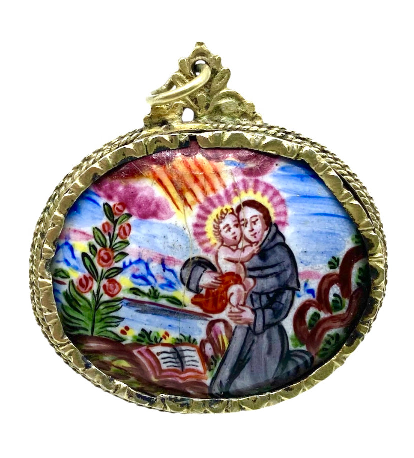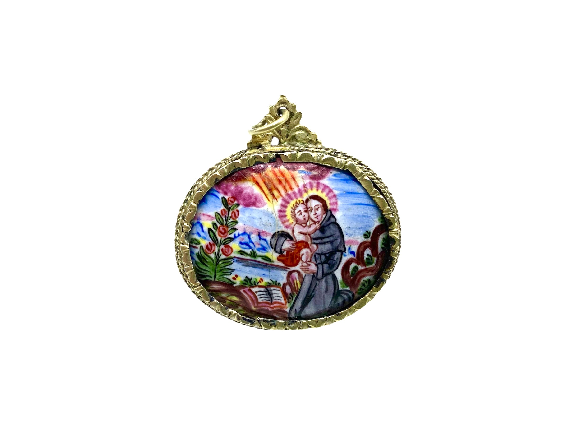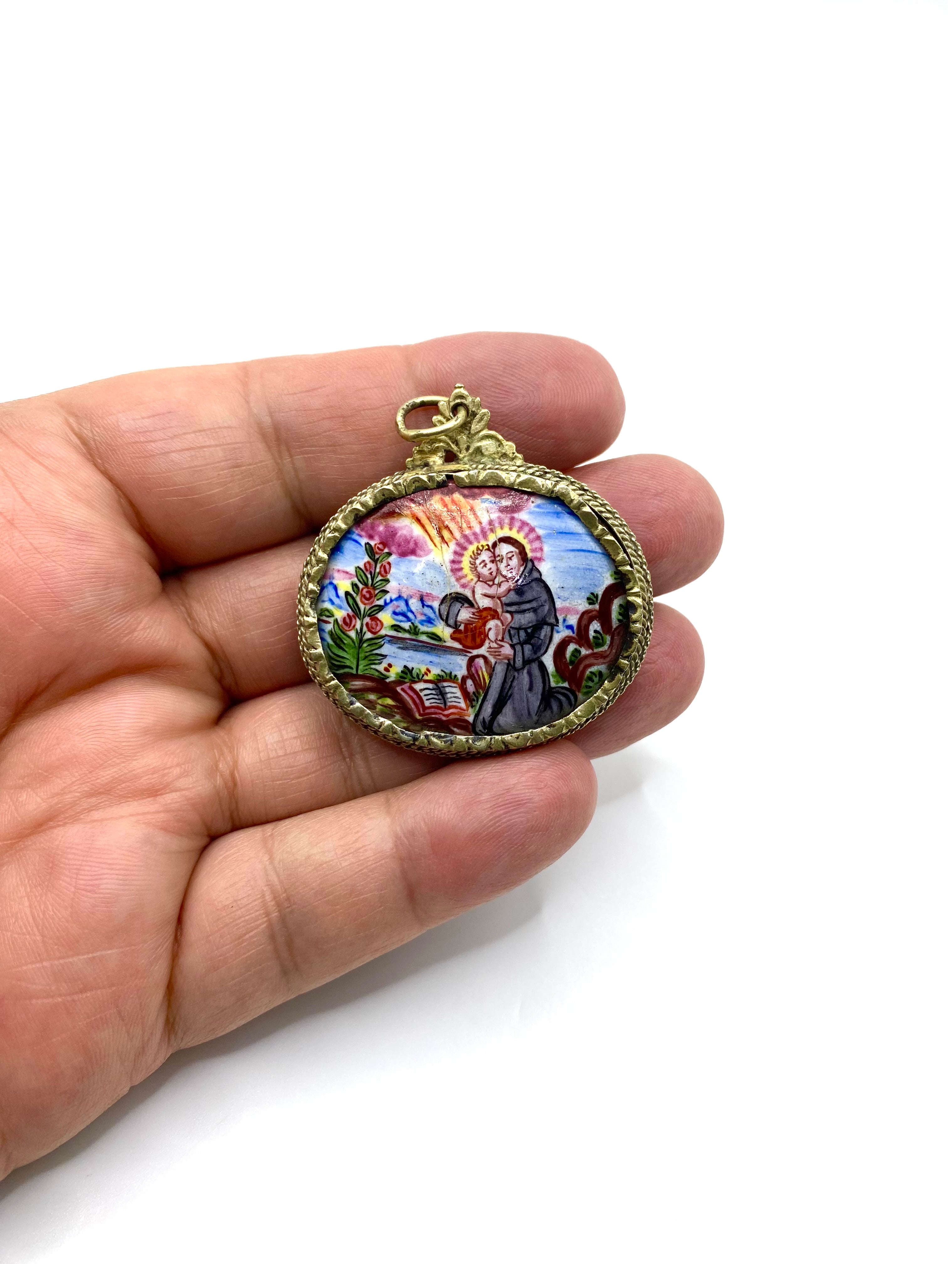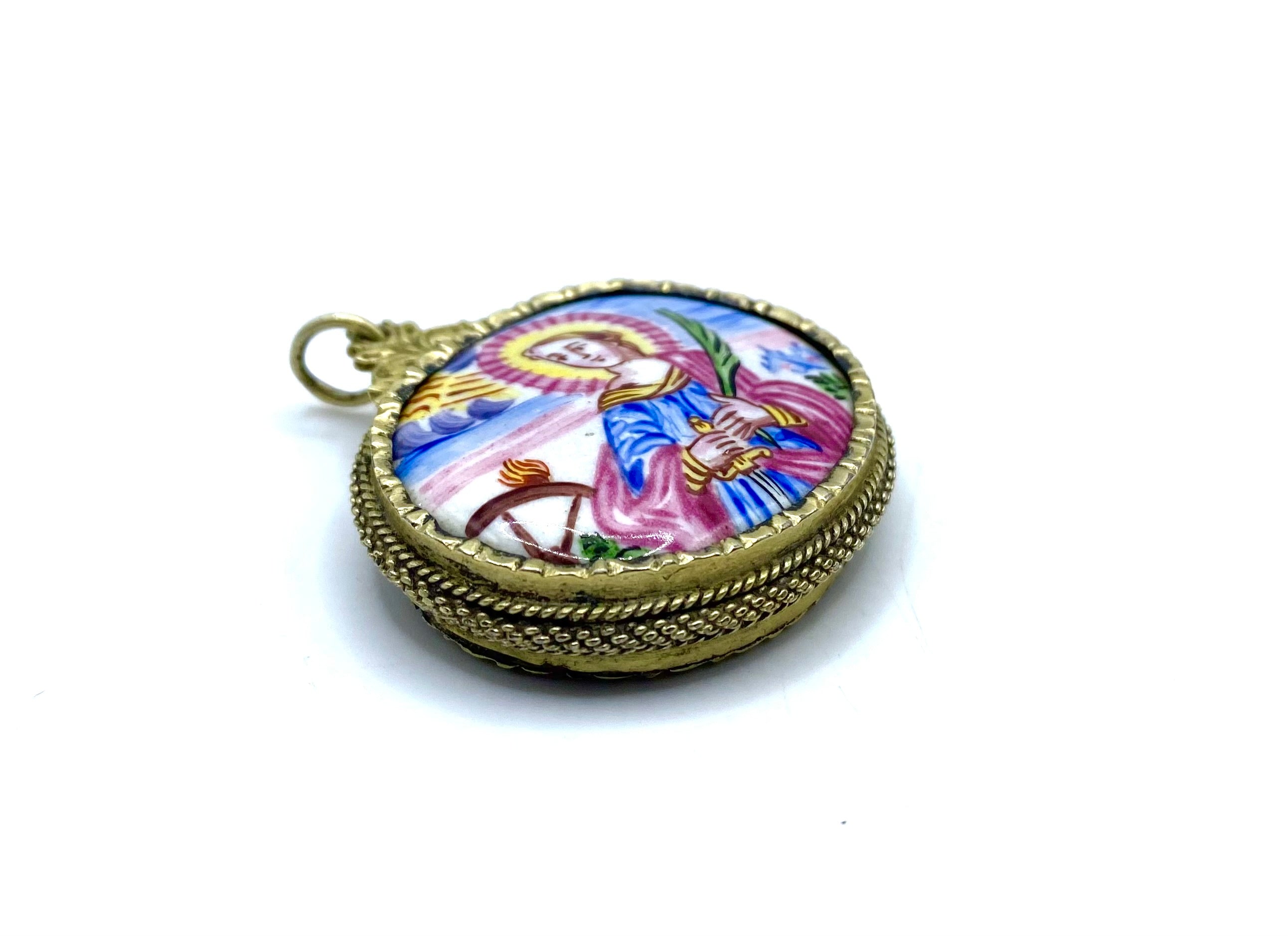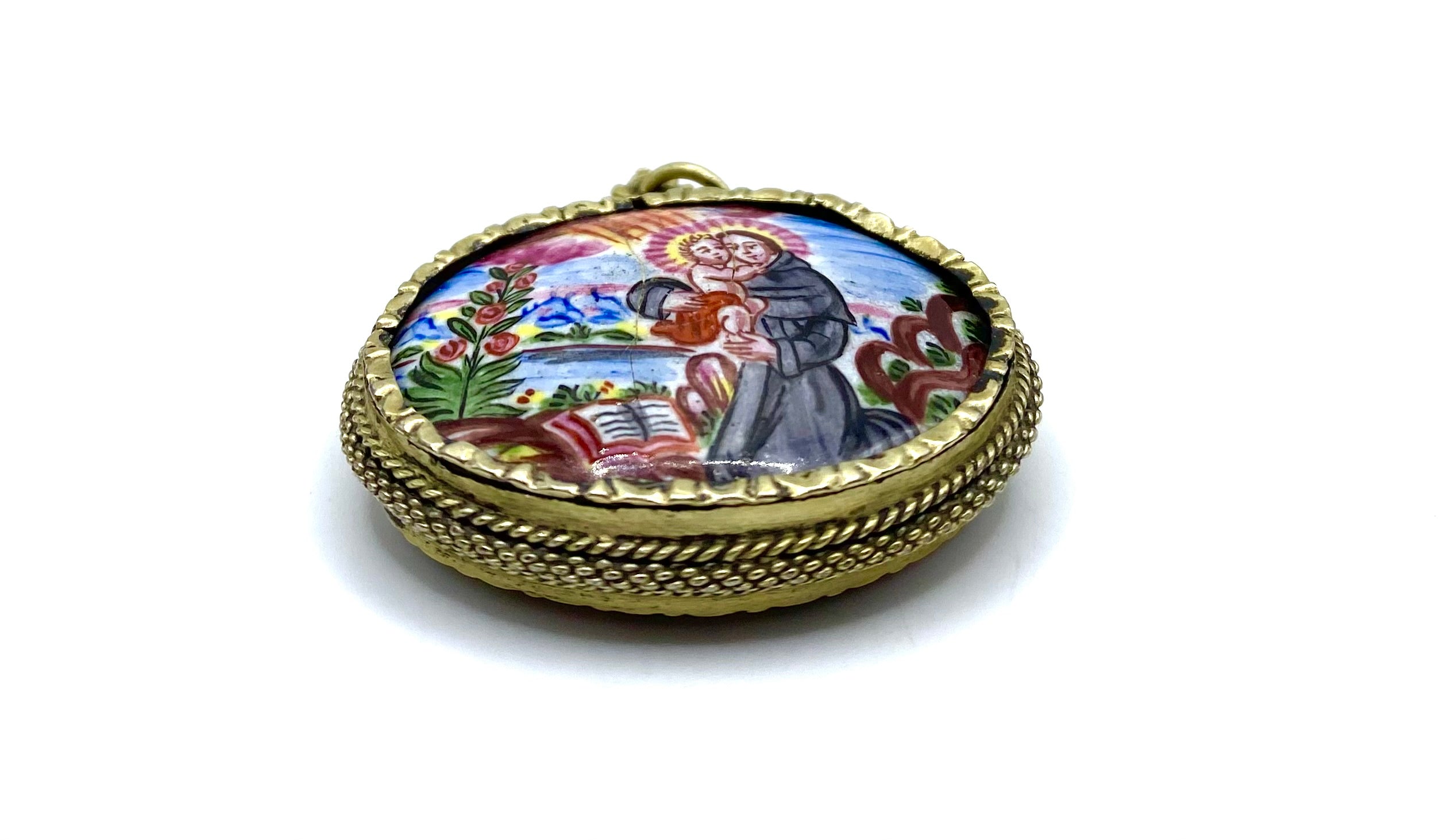 Oval pendant with a gilt silver frame decorated one side Saint Anthony of Padua with the child Jesus in his arms and on the other side Catherine of Alexandria is, according to tradition, a Christian saint and virgin, who was martyred in the early fourth century at the hands of the emperor Maxentius. In this medallion you can see the wheel of torture and the palm of his sainthood in his hands.