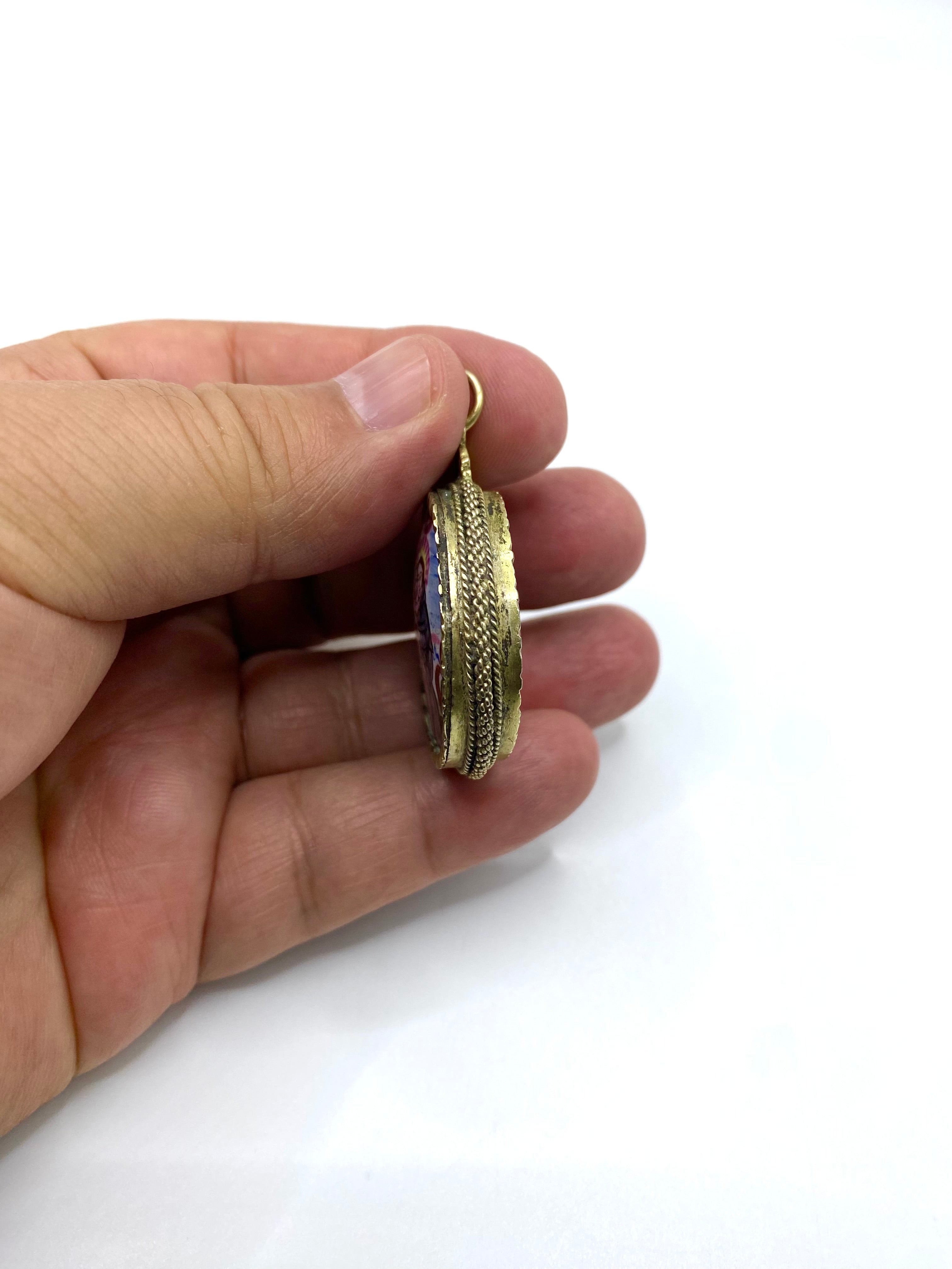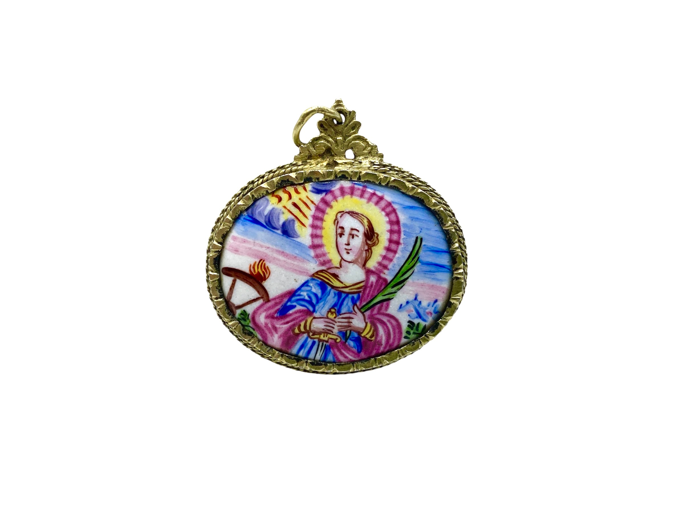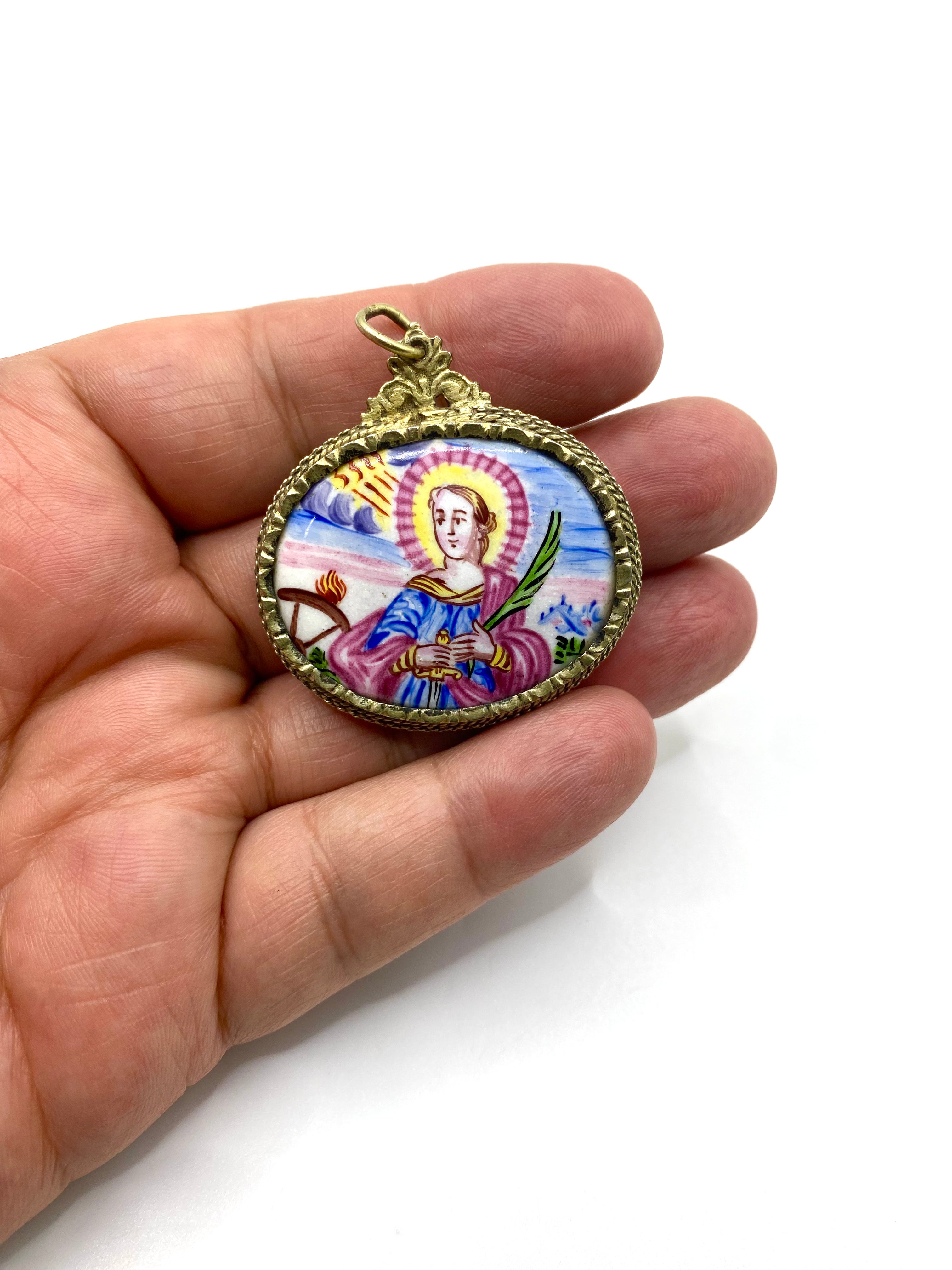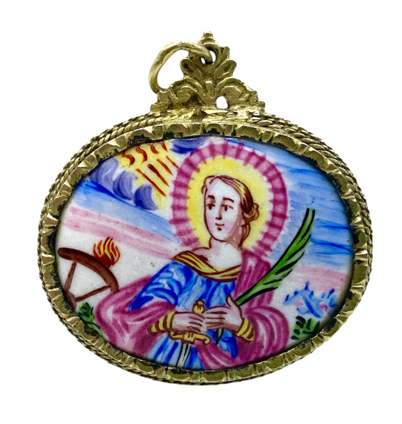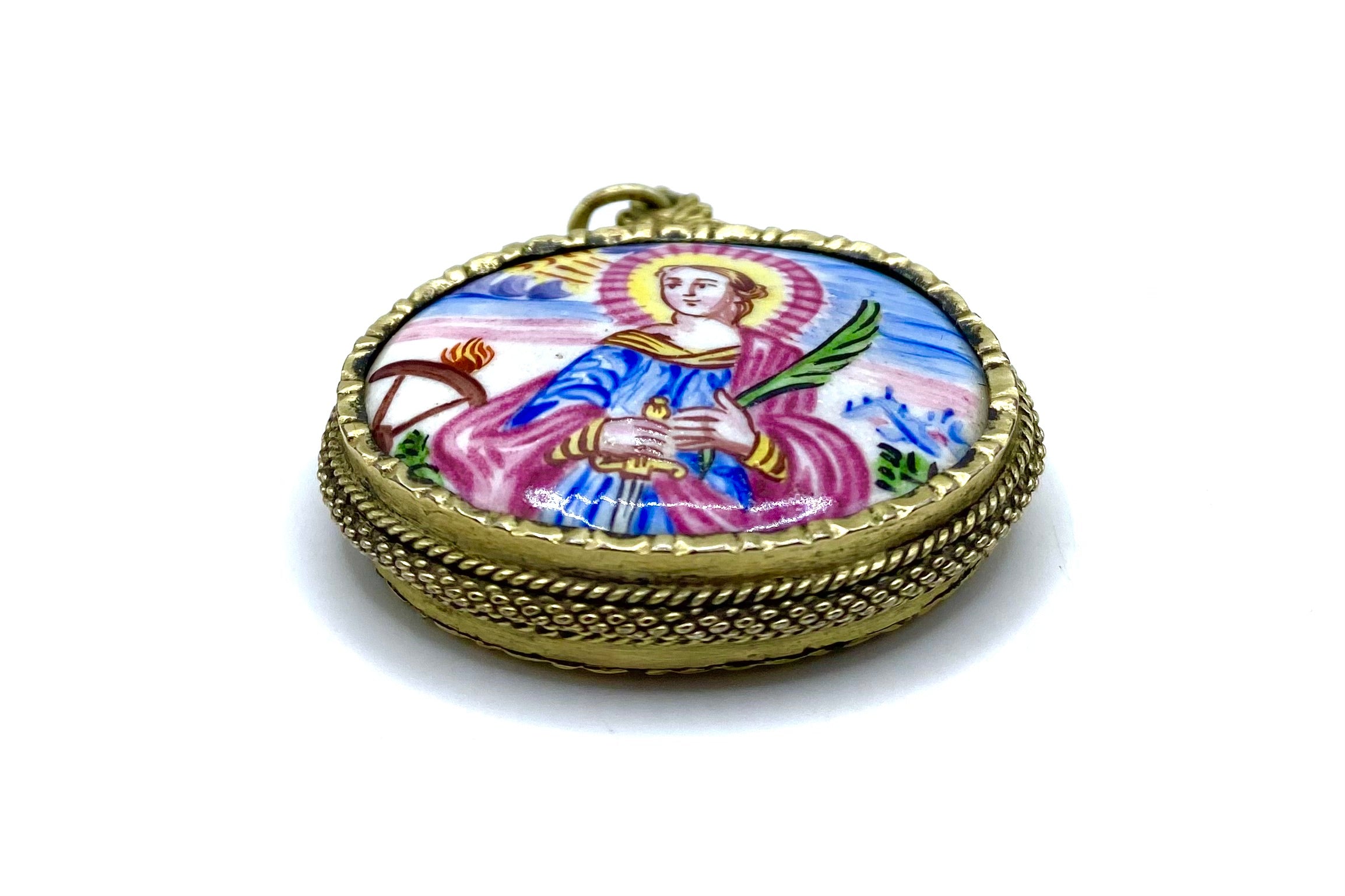 Oval pendant with a gilt silver frame decorated one side Saint Anthony of Padua with the child Jesus in his arms and on the other side Catherine of Alexandria is, according to tradition, a Christian saint and virgin, who was martyred in the early fourth century at the hands of the emperor Maxentius. In this medallion you can see the wheel of torture and the palm of his sainthood in his hands.