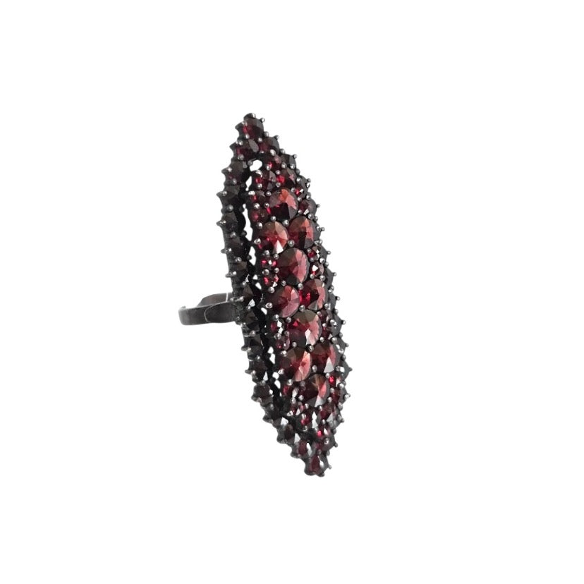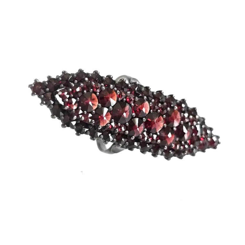 Featuring numerous rose-cut Bohemian garnets set in an 800 silver ring mounting.