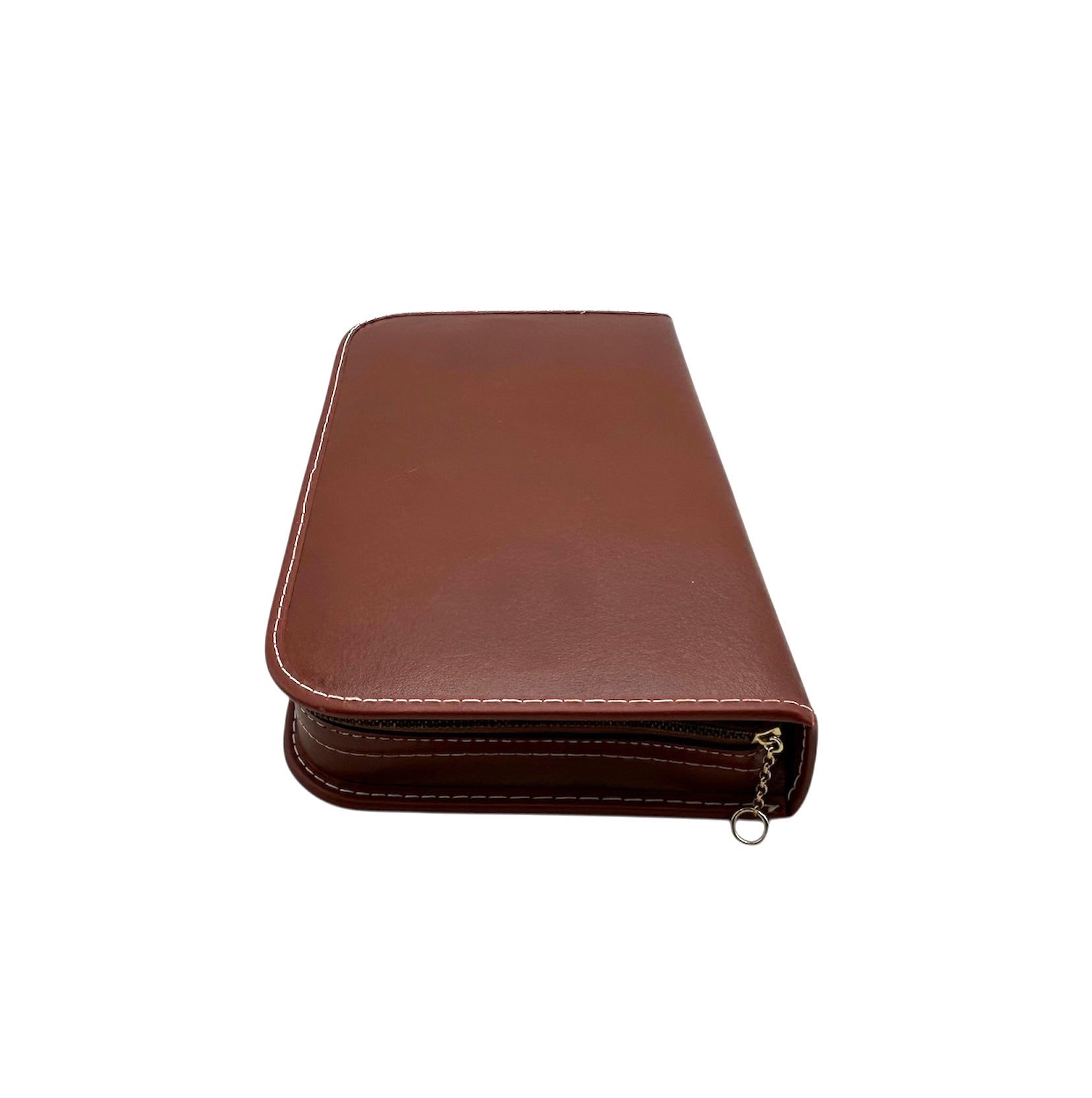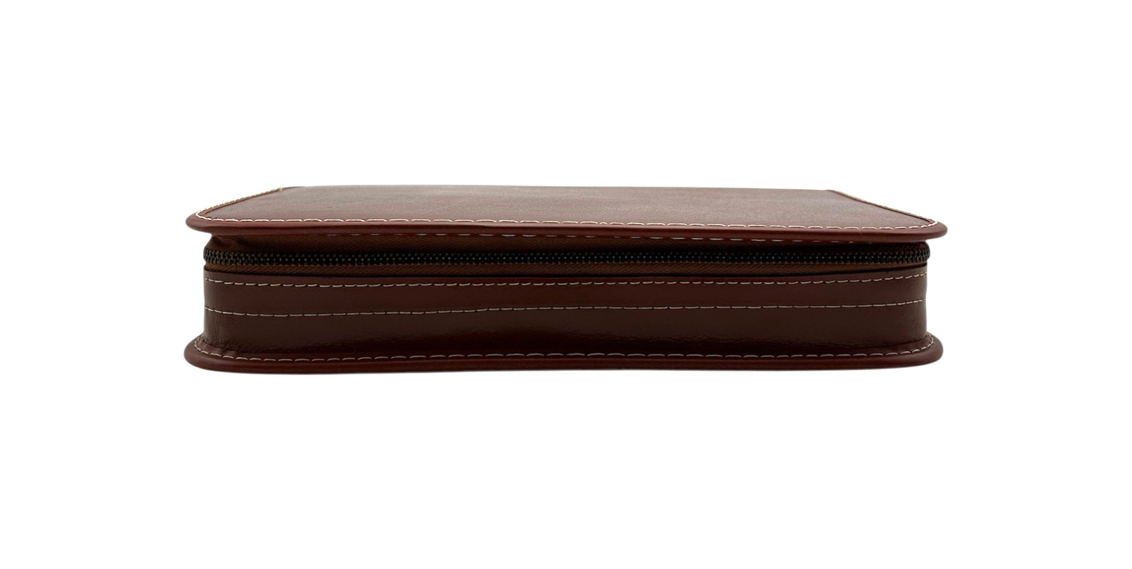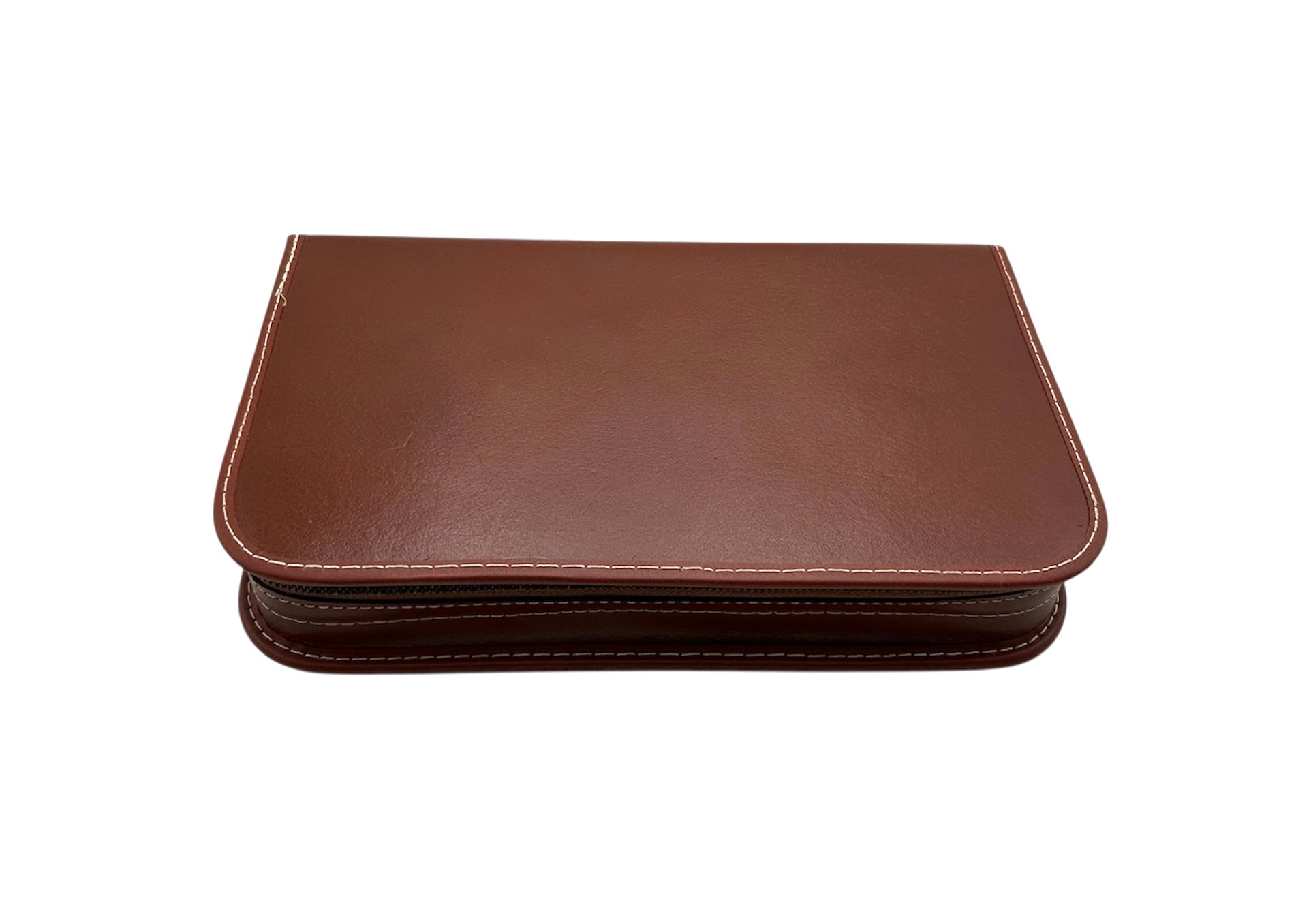 All men's travel essentials neatly stowed into convenient leather zip carrying case. Stainless steel holders for toothbrush, soap, other sundries, brush and nail accessories. Picture frame for loved ones to go with you is provided. Hampshire Genuine Leather tag.