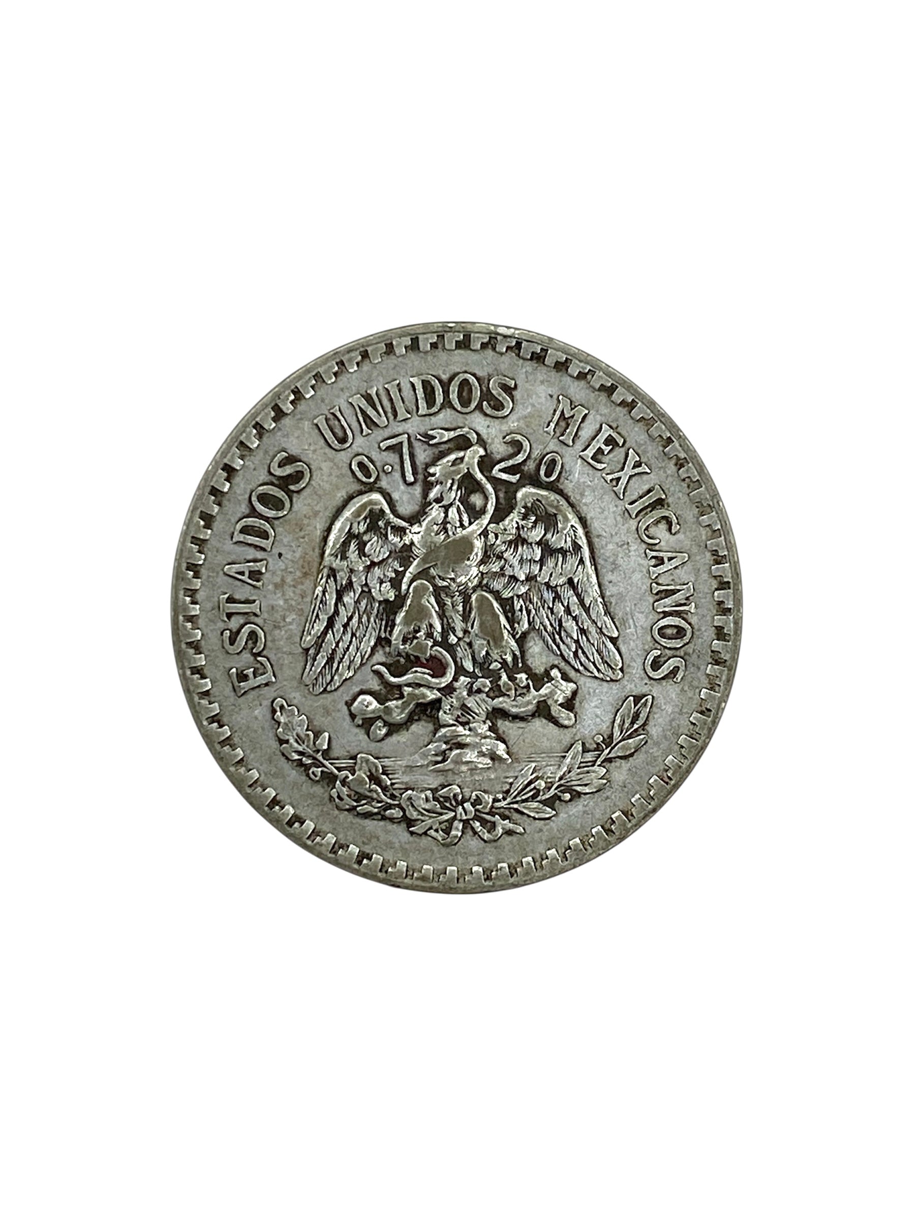 The Mexican coat of arms: a Mexican golden eagle perched on a prickly pear cactus devouring a rattlesnake. The eagle, cactus and snake are surrounded by a holm oak (encina) branch on one side and a laurel branch on the other. The head of the eagle and snake separates the purity (0.720). “ESTADOS UNIDOS MEXICANOS” over the coat of arms.