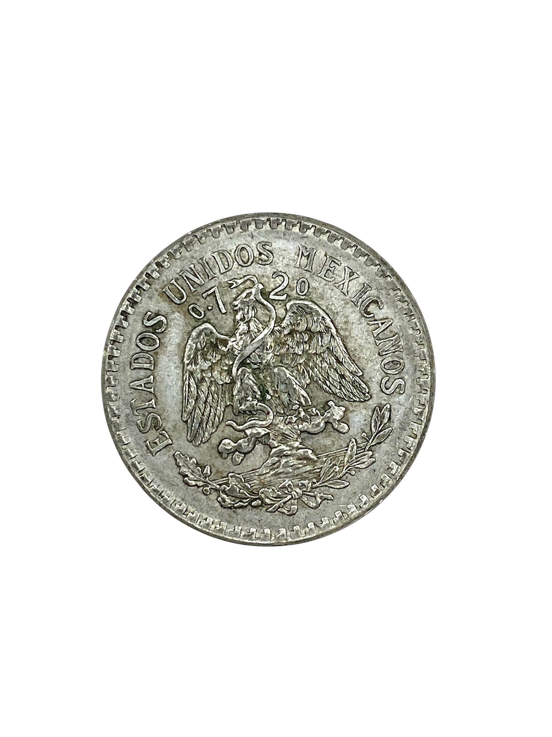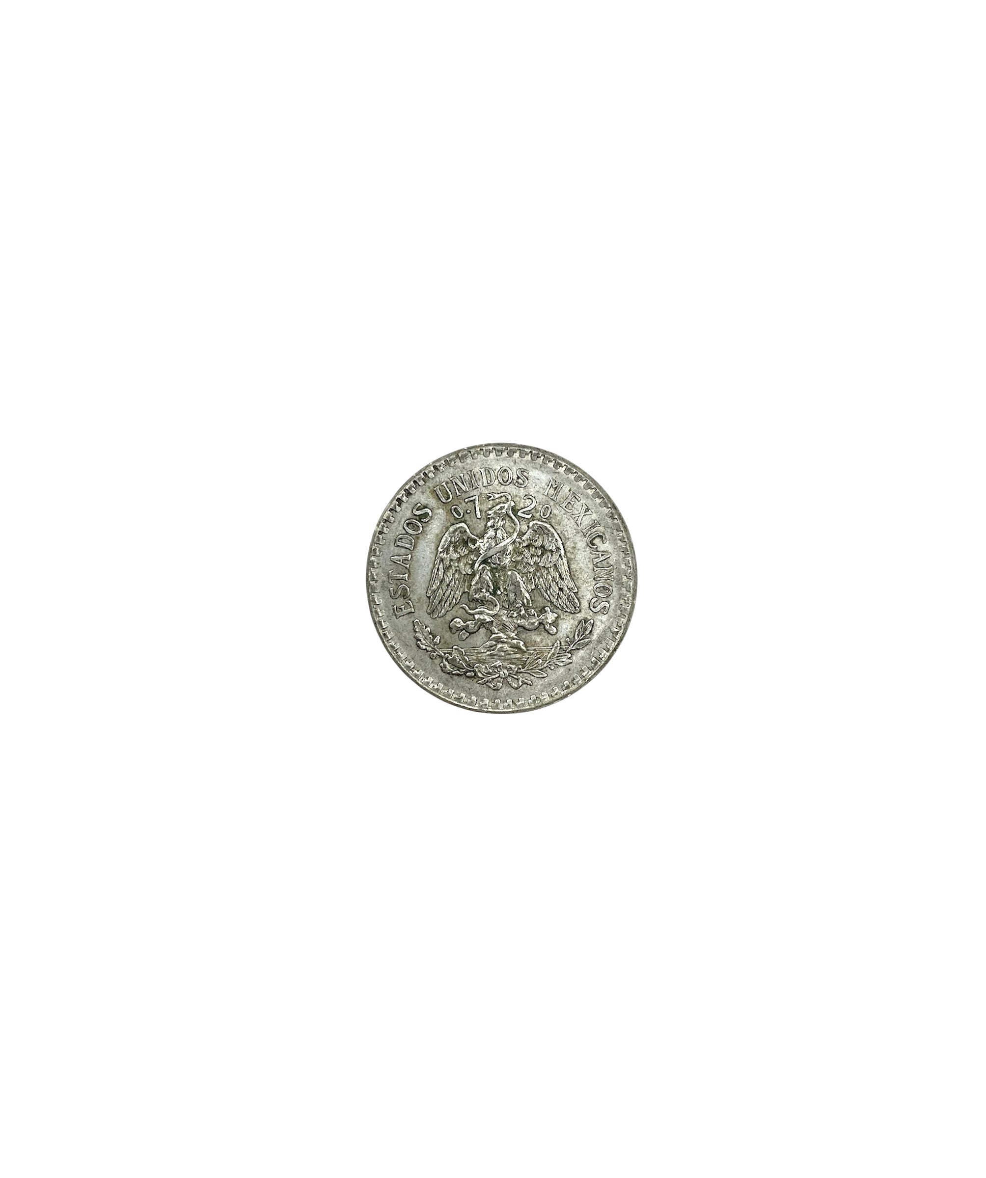 The Mexican coat of arms: a Mexican golden eagle perched on a prickly pear cactus devouring a rattlesnake. The eagle, cactus and snake are surrounded by a holm oak (encina) branch on one side and a laurel branch on the other. The head of the eagle and snake separates the purity (0.720). “ESTADOS UNIDOS MEXICANOS” over the coat of arms.