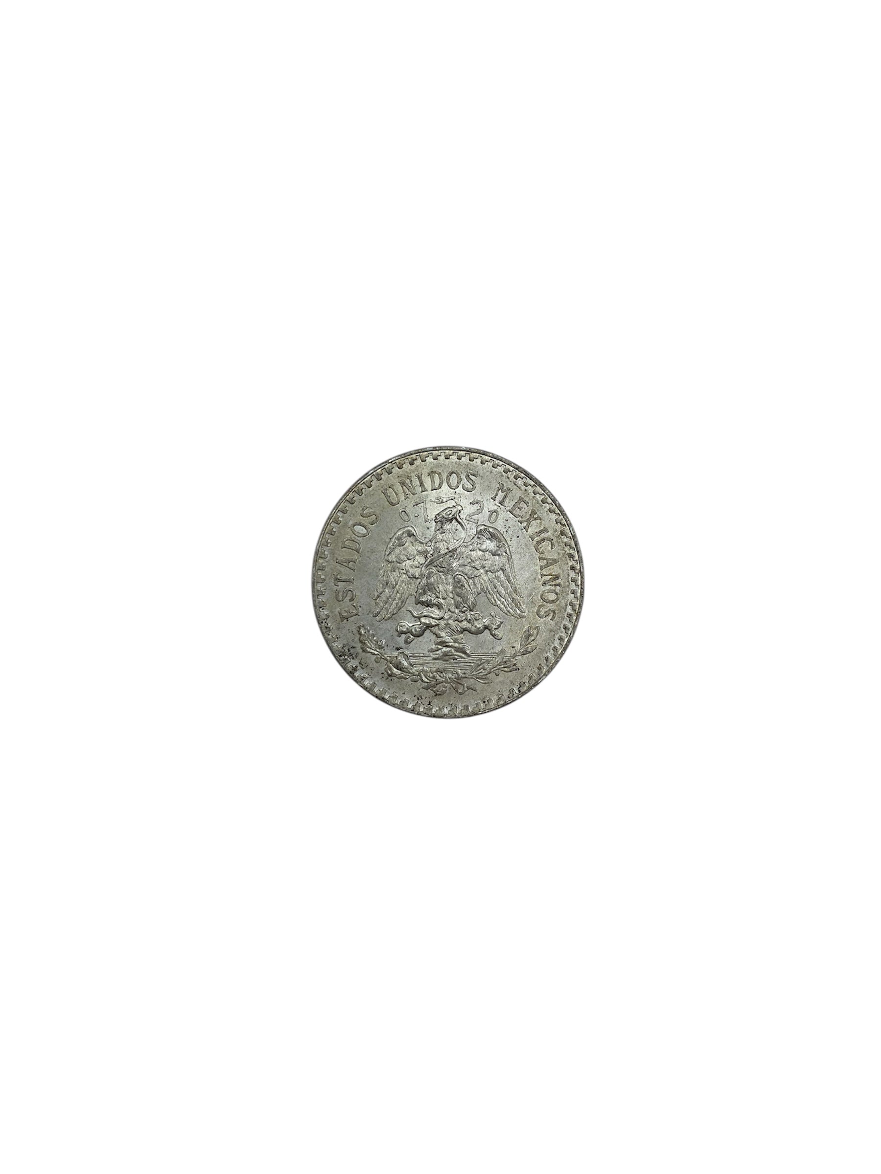 The Mexican coat of arms: a Mexican golden eagle perched on a prickly pear cactus devouring a rattlesnake. The eagle, cactus and snake are surrounded by a holm oak (encina) branch on one side and a laurel branch on the other. The head of the eagle and snake separates the purity (0.720). “ESTADOS UNIDOS MEXICANOS” over the coat of arms.