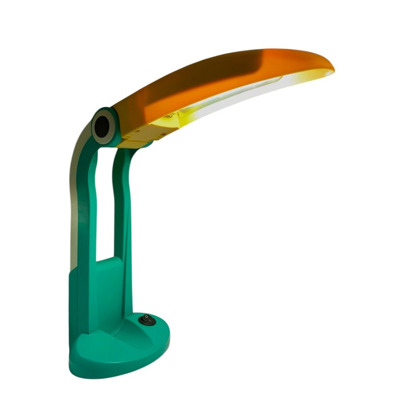 The beak hides a fluorescent bulb underneath, and can be folded and adjusted to any position.