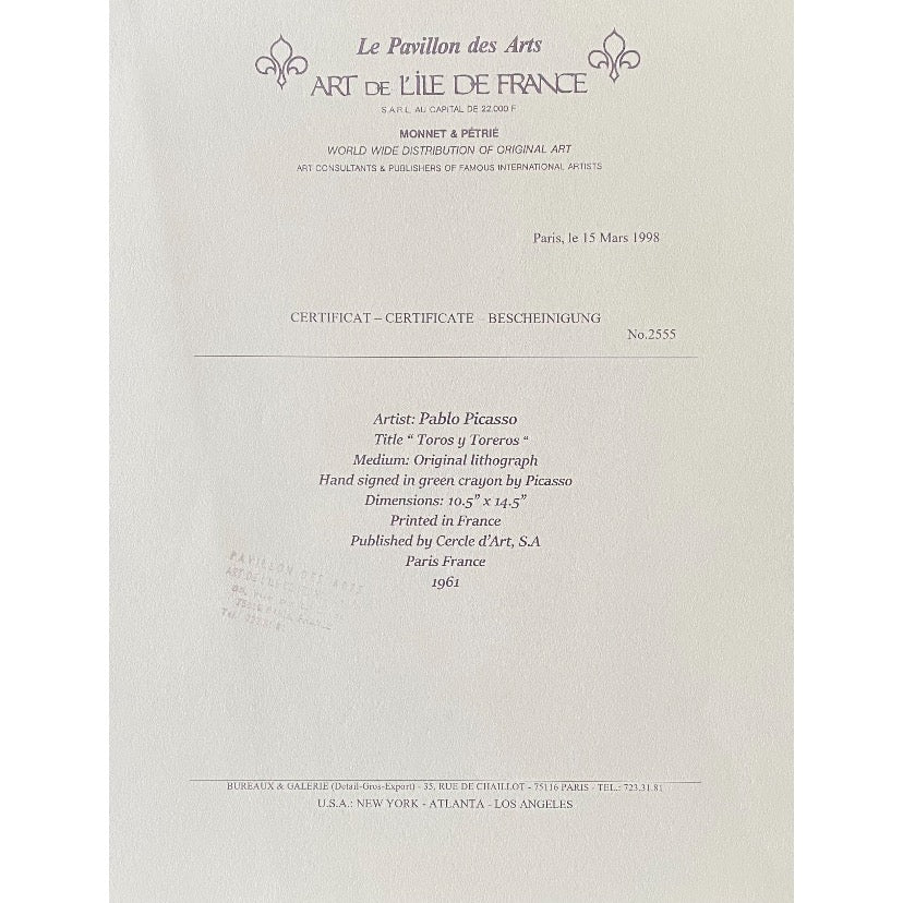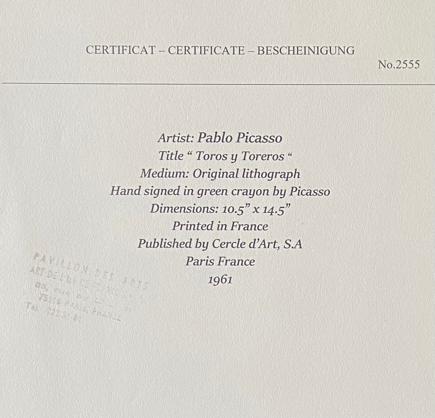 Toros y Toreros Frontispiece by Pablo Picasso (1961) is a limited-edition lithograph, part of the toros and toreros series, published by Cercle d’Art in Paris. Hand-signed by Picasso, the lithograph captures the dynamic energy of a bullfight, a recurring theme in the artist’s work. The piece employs loose, gestural strokes to depict the movement of bullfighters and bulls, creating a sense of chaos and rhythm. Textured patterns add depth and evoke the atmosphere of the bullring, while abstract shapes emphasize movement over detail. This work highlights Picasso’s fascination with the drama and spectacle of the bullfight, depicted in his signature expressive style.