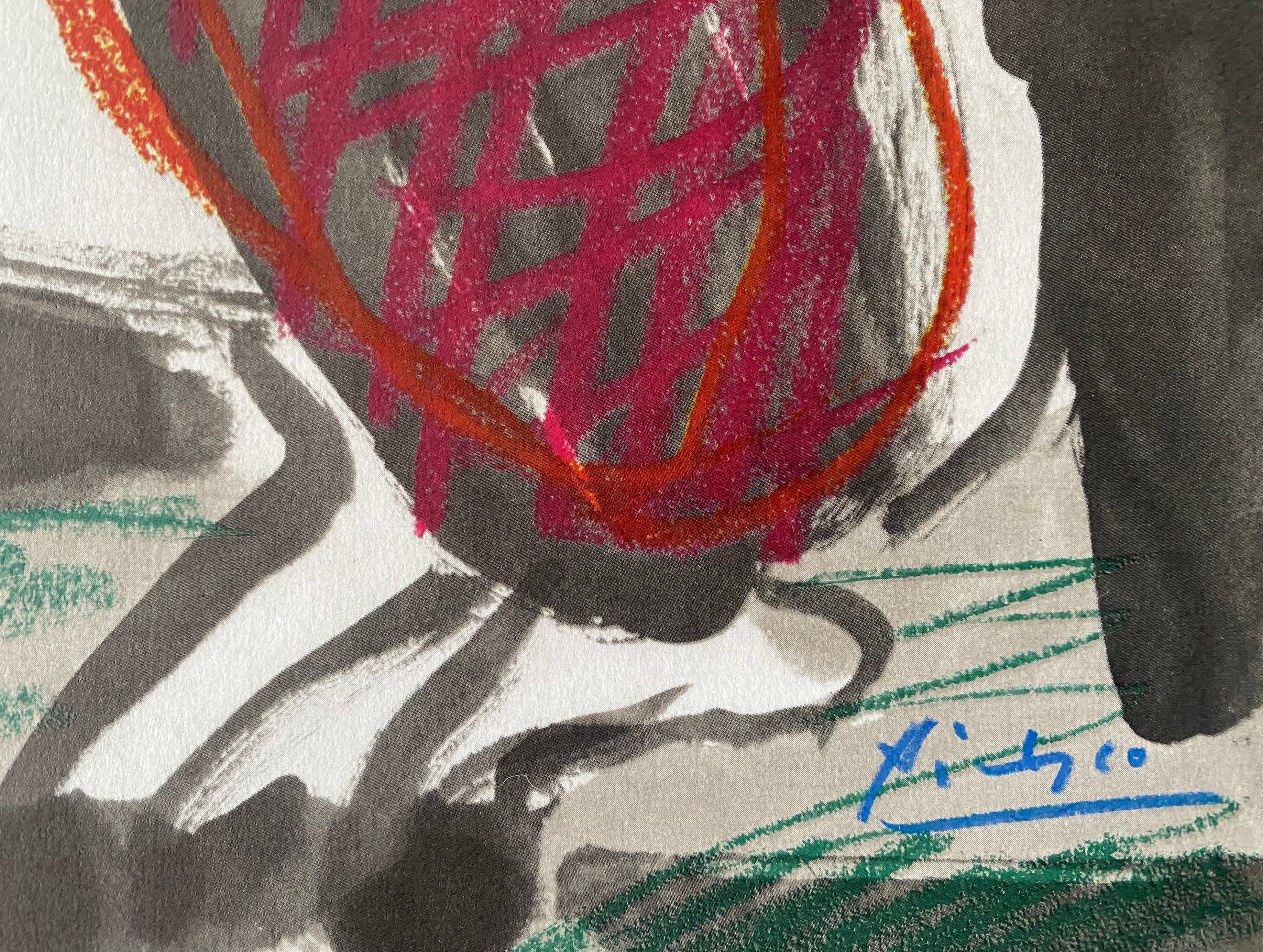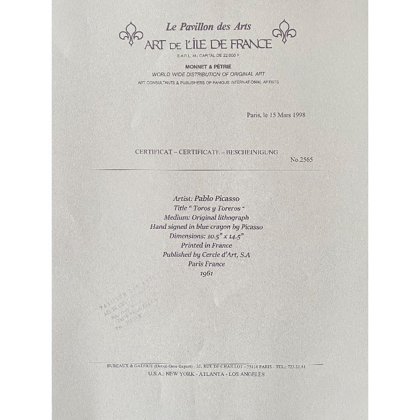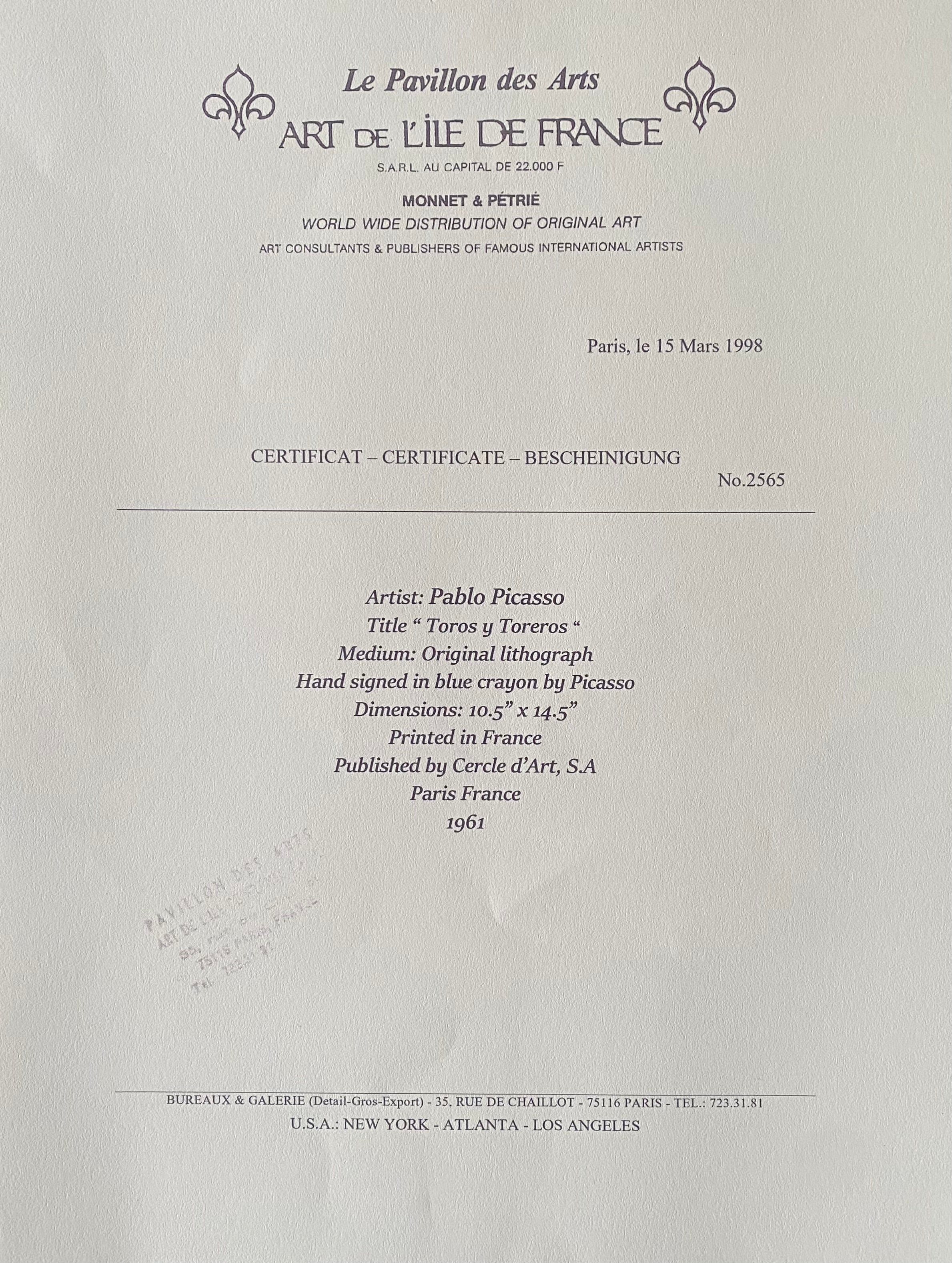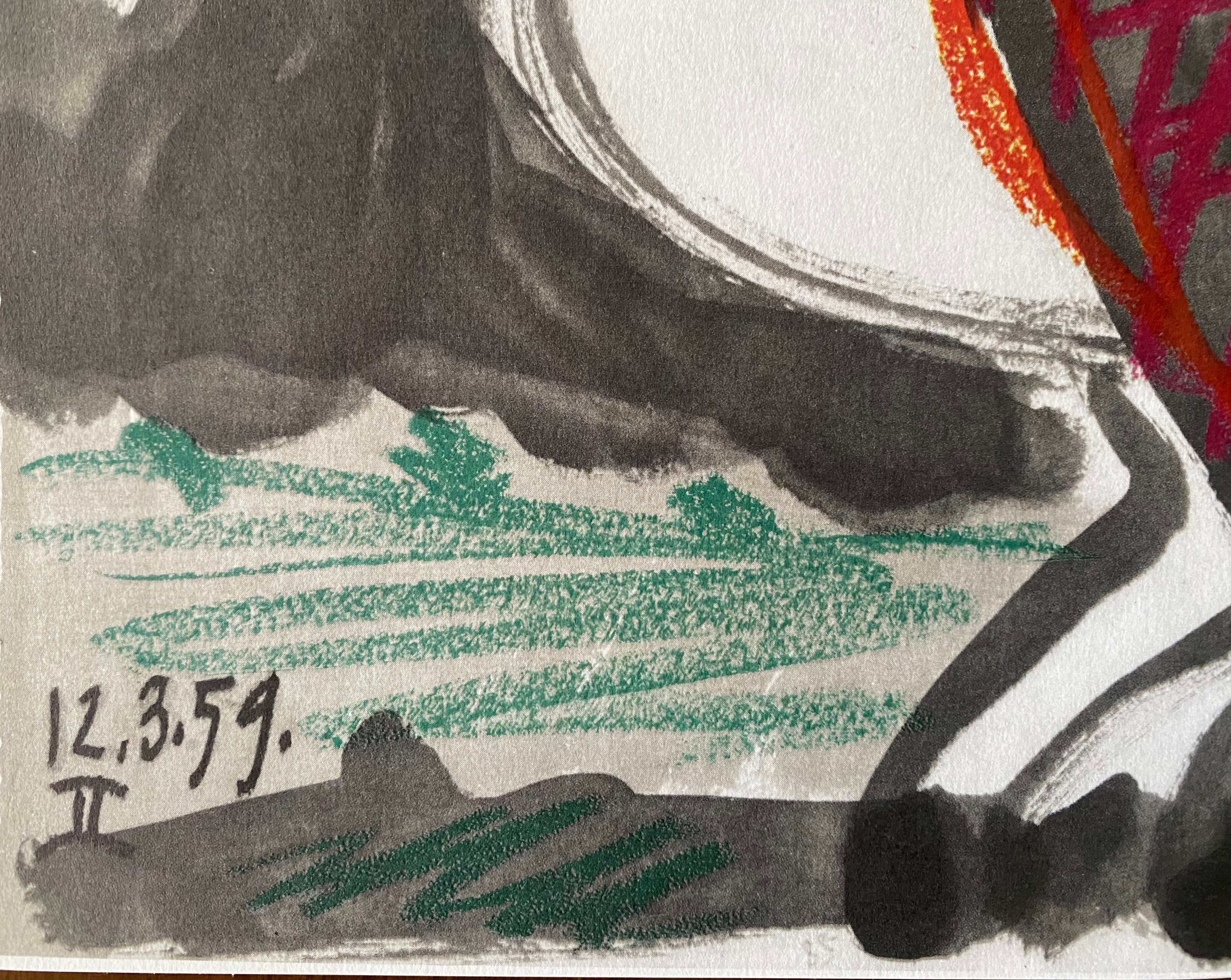 Toros y Toreros Frontispiece by Pablo Picasso (1961) is a limited-edition lithograph, part of the toros and toreros series, published by Cercle d'Art in Paris. Hand-signed by Picasso, the lithograph captures the dynamic energy of a bullfight, a recurring theme in the artist's work. The piece employs loose, gestural strokes to depict the movement of bullfighters and bulls, creating a sense of chaos and rhythm. Textured patterns add depth and evoke the atmosphere of the bullring, while abstract shapes emphasize movement over detail. This work highlights Picasso's fascination with the drama and spectacle of the bullfight, depicted in his signature expressive style.