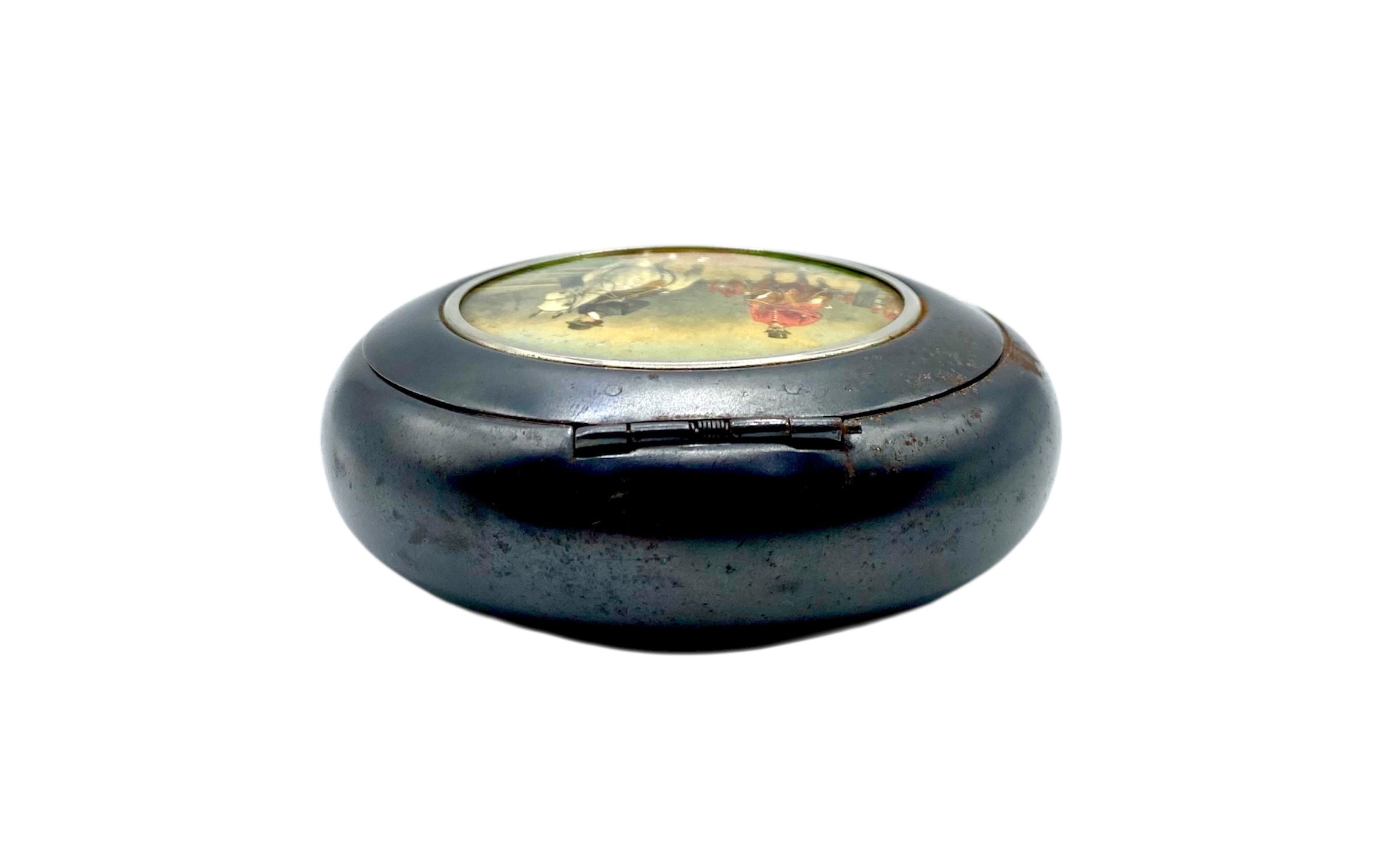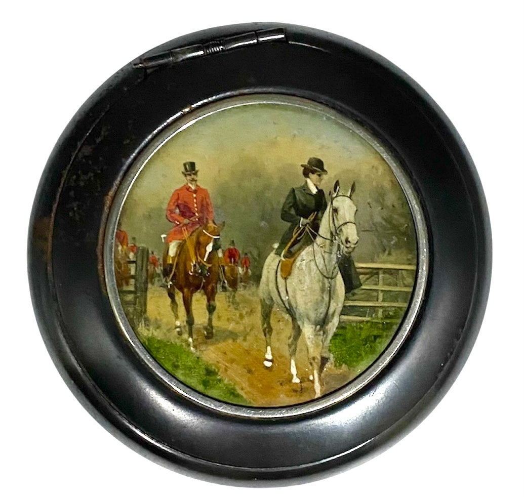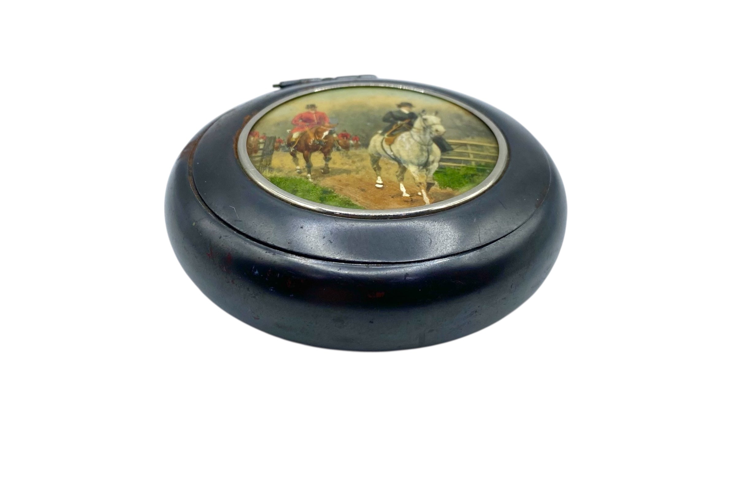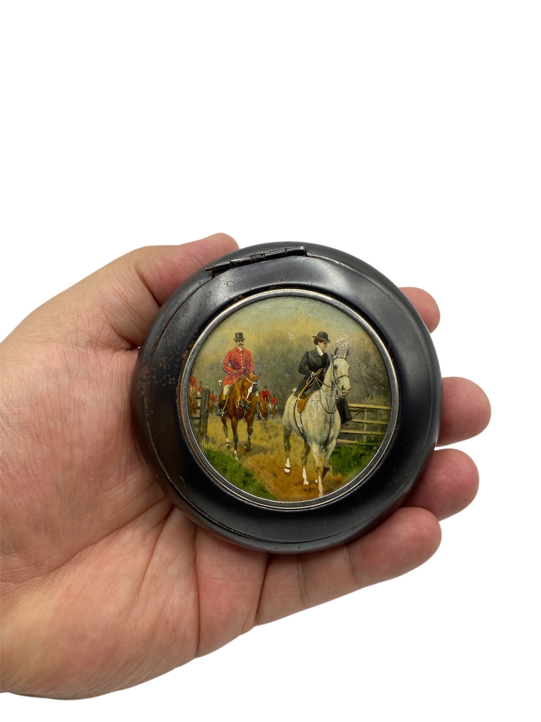 Metallic snuff box, with a hand-painted hunting scene. 1930s England