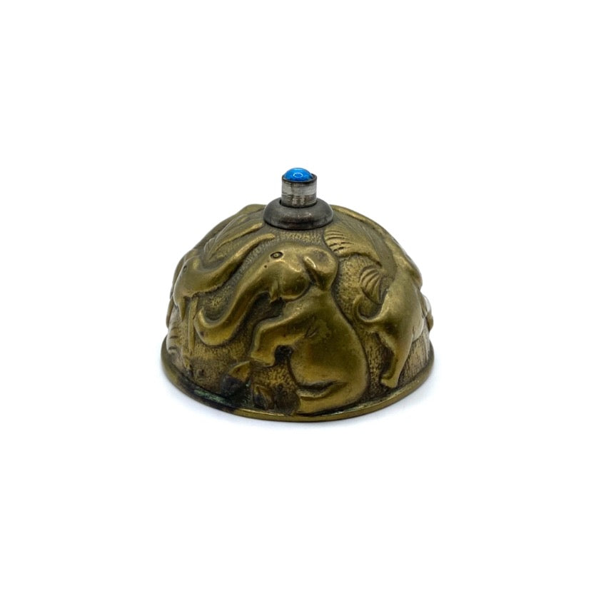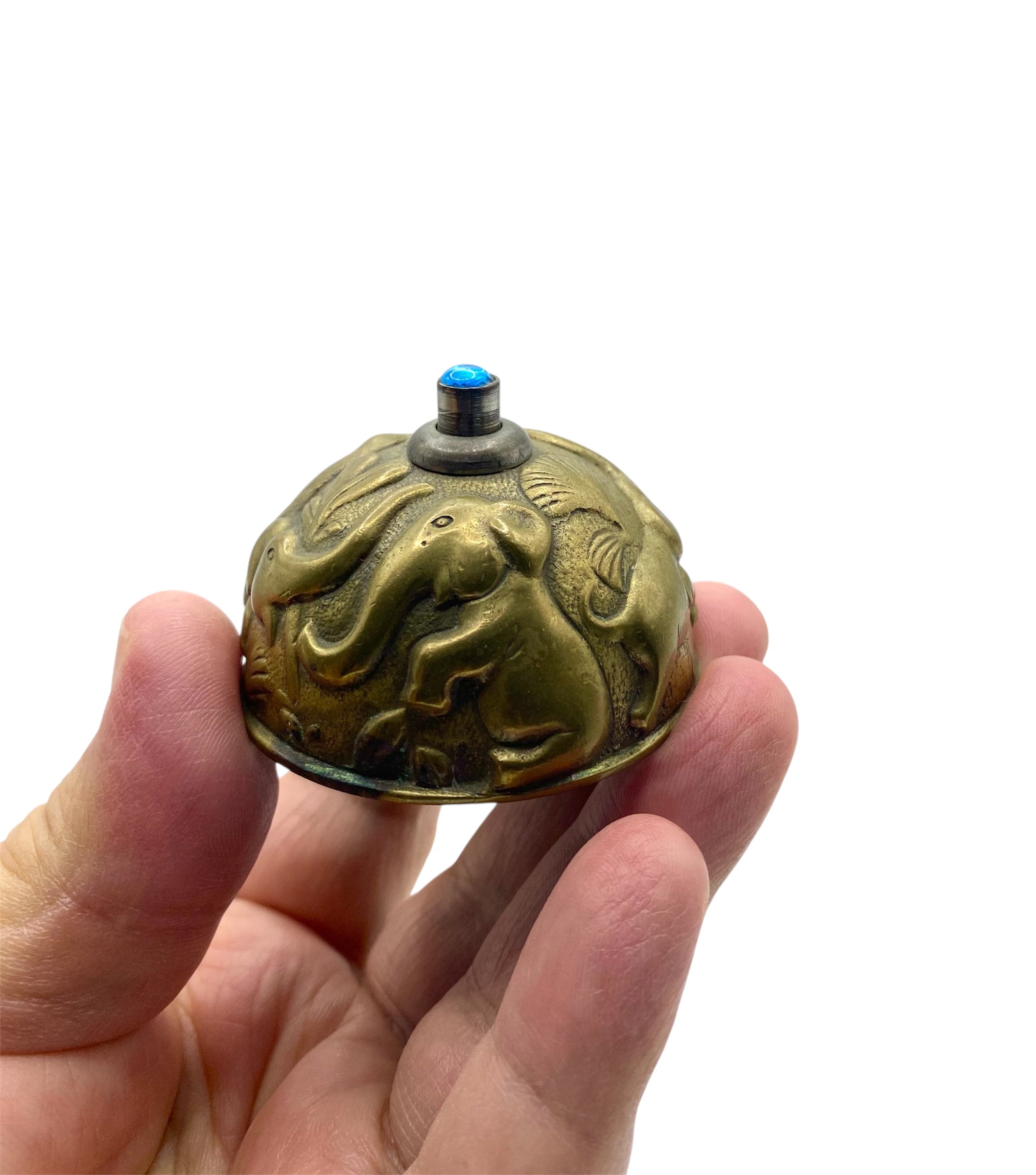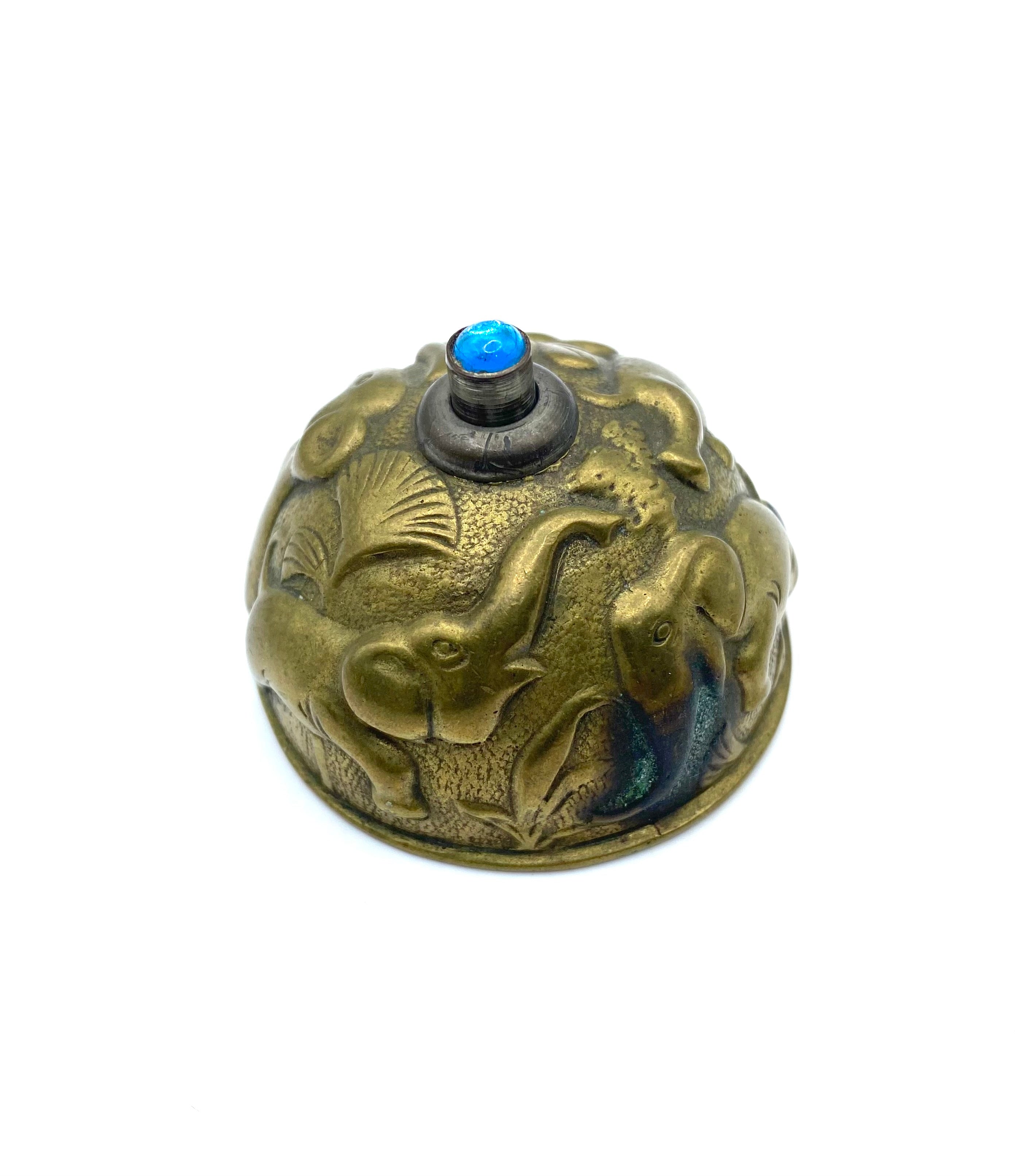 Rare Antique Art Nouveau Cast Brass & Blue Glass Stone Elephant Theme Push Bell Ringer
