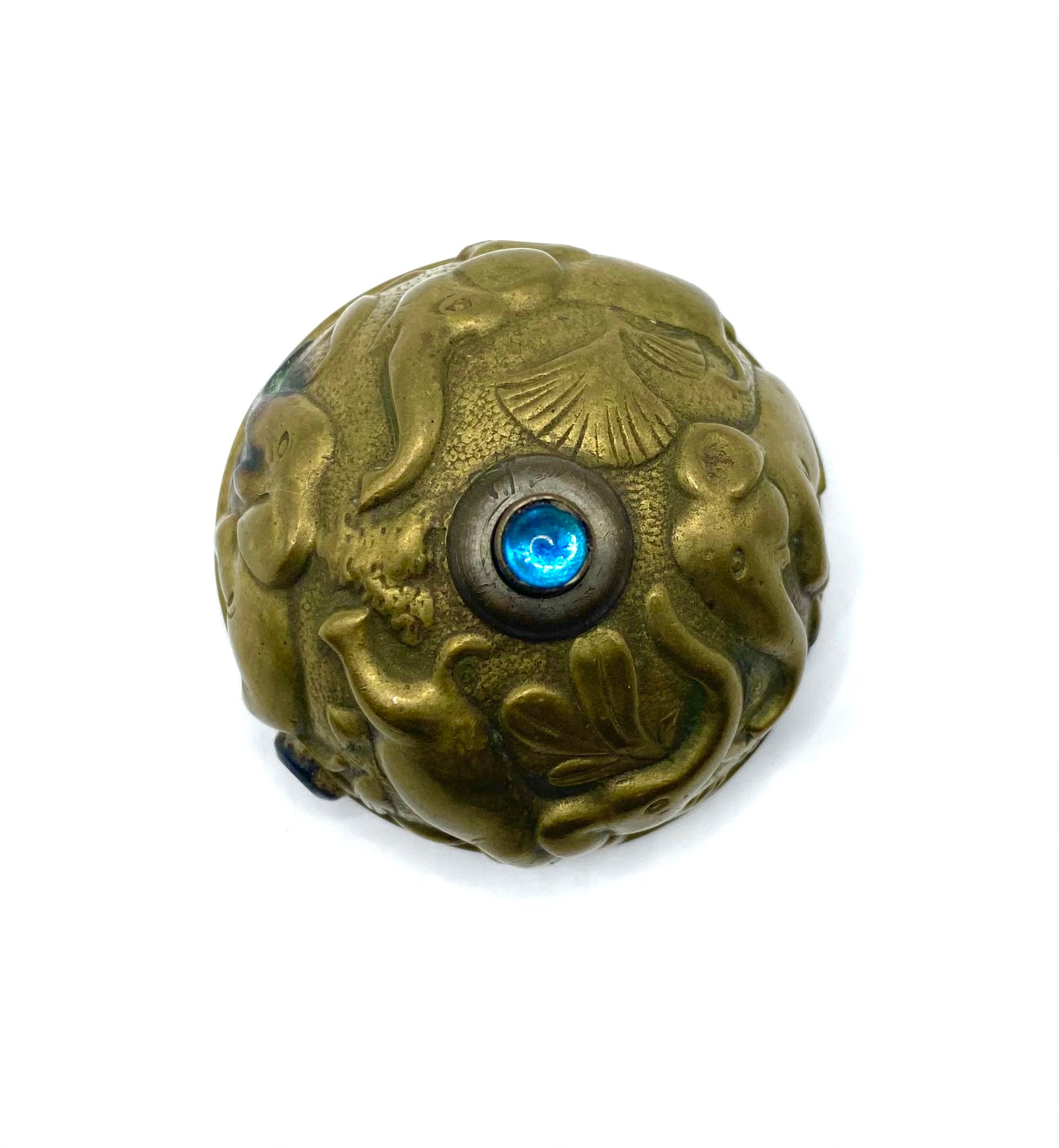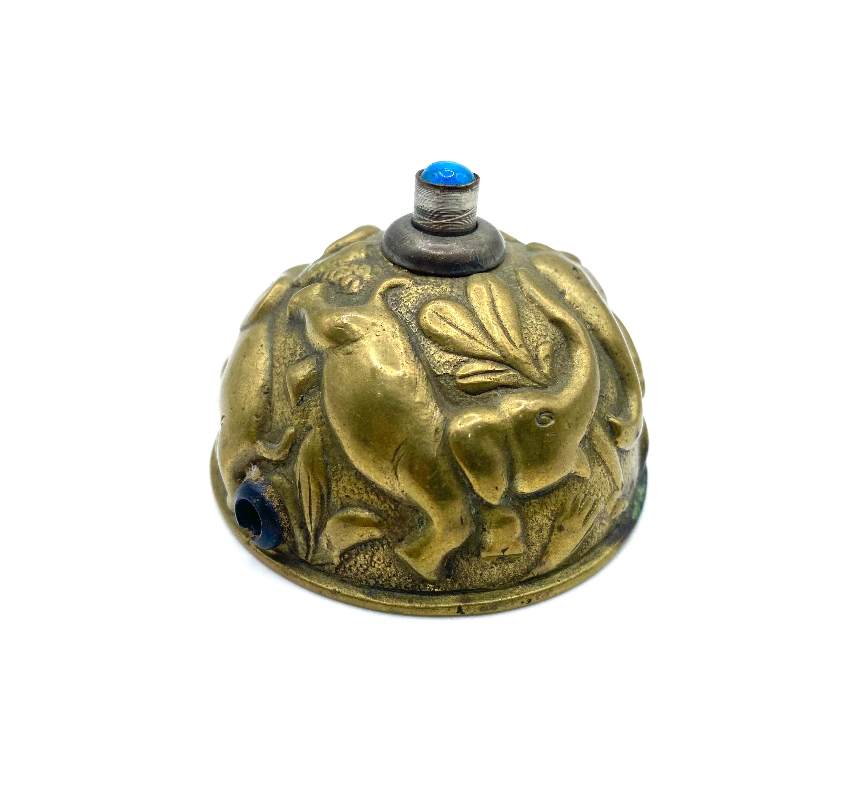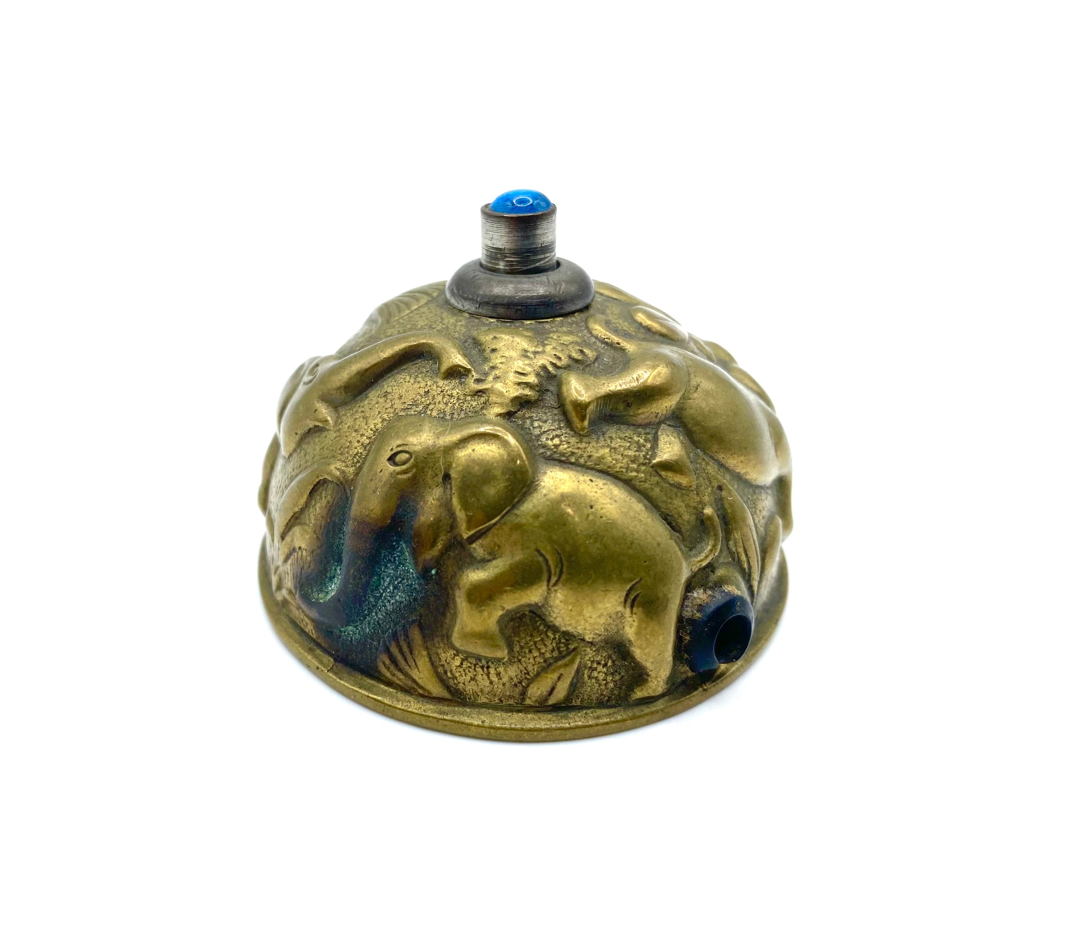 Rare Antique Art Nouveau Cast Brass & Blue Glass Stone Elephant Theme Push Bell Ringer