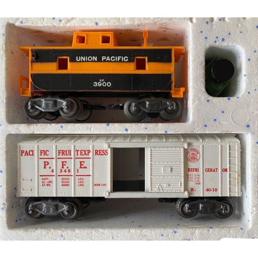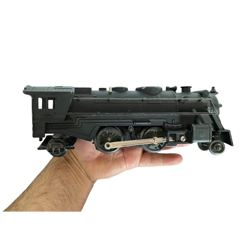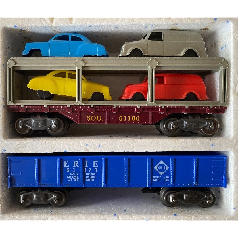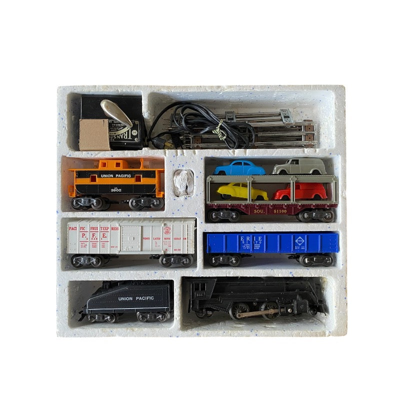 Die cast set 52875, 666 die cast loco w/smoke, 961 tender, 51170 gondola, 43461 box car, 51100 auto loader, 3900 caboose, w/track & transformer, orig boxes & inserts, C8-9.