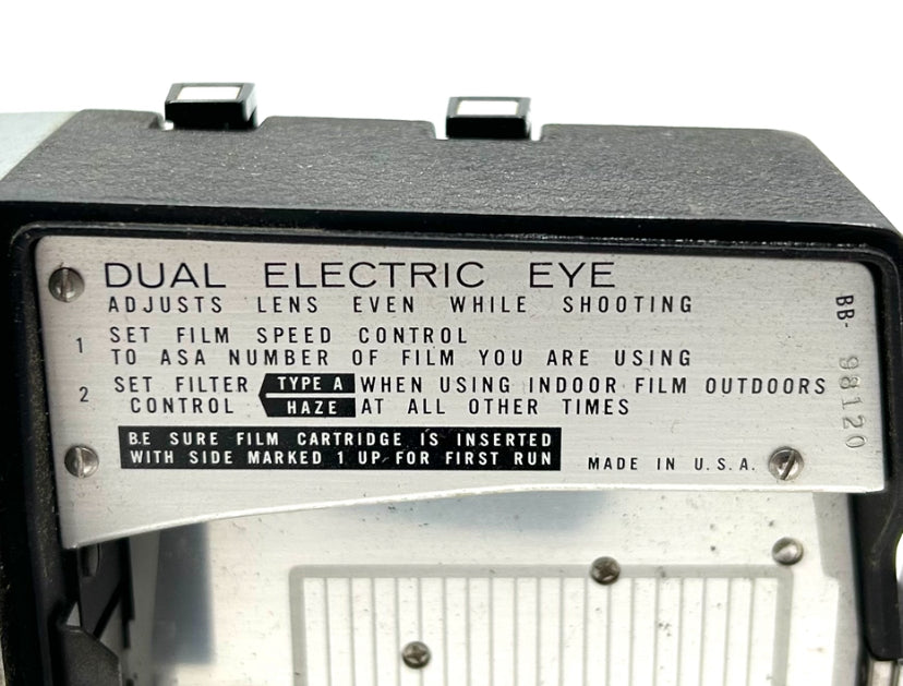 Varamat Zoom Lens f/1.8. Features dual electric eye, animation and slow motion, haze, type A, and built-in filters. Includes 3 empty film cartridges and leather case.