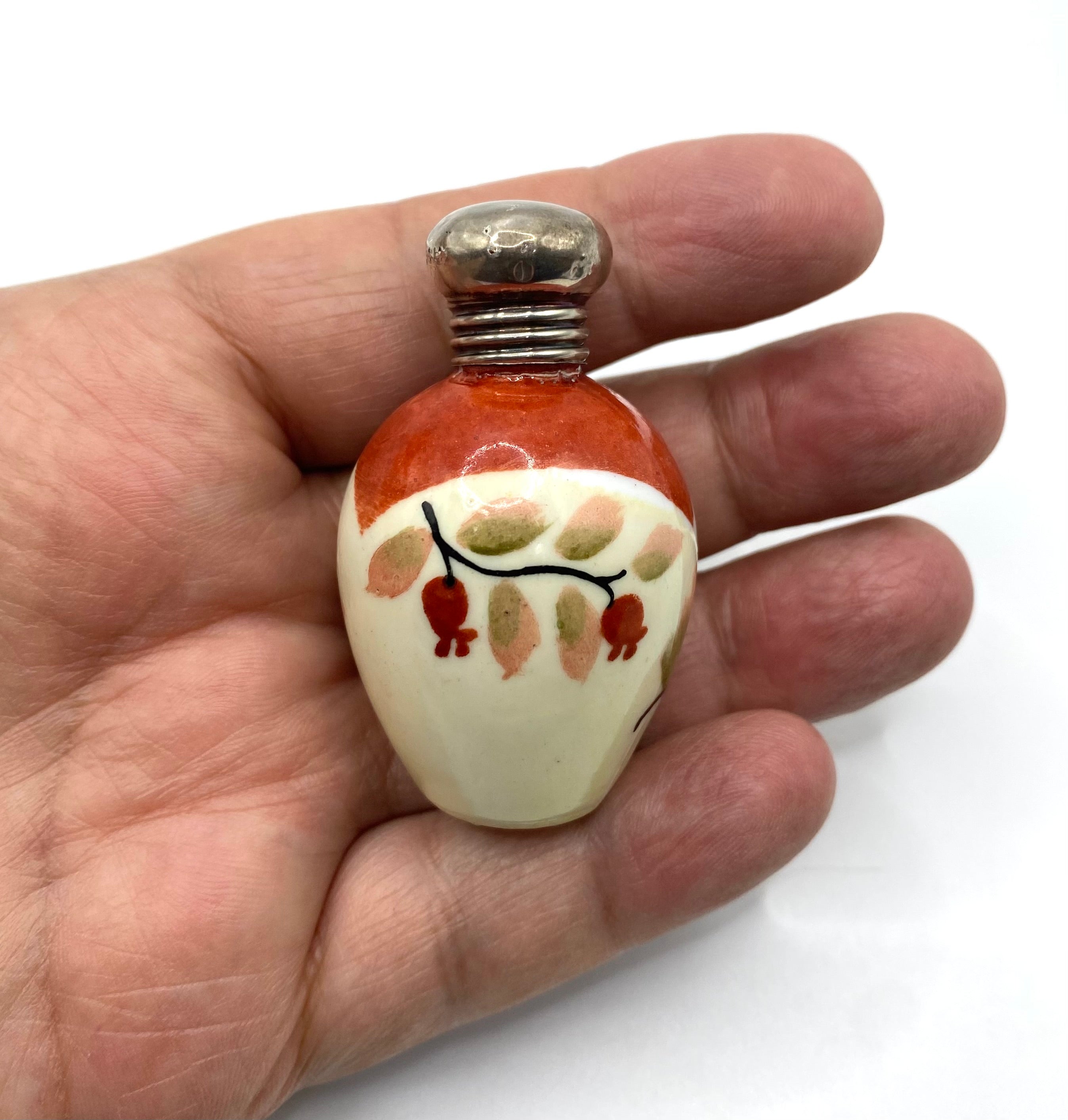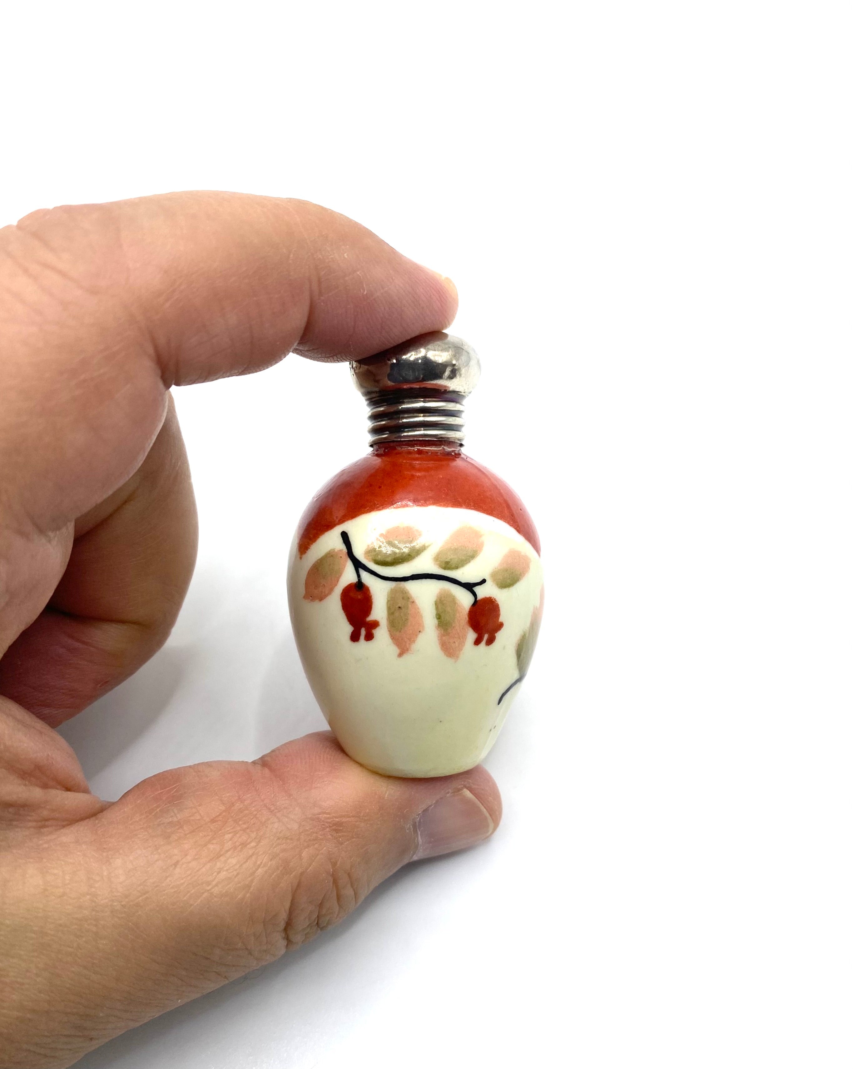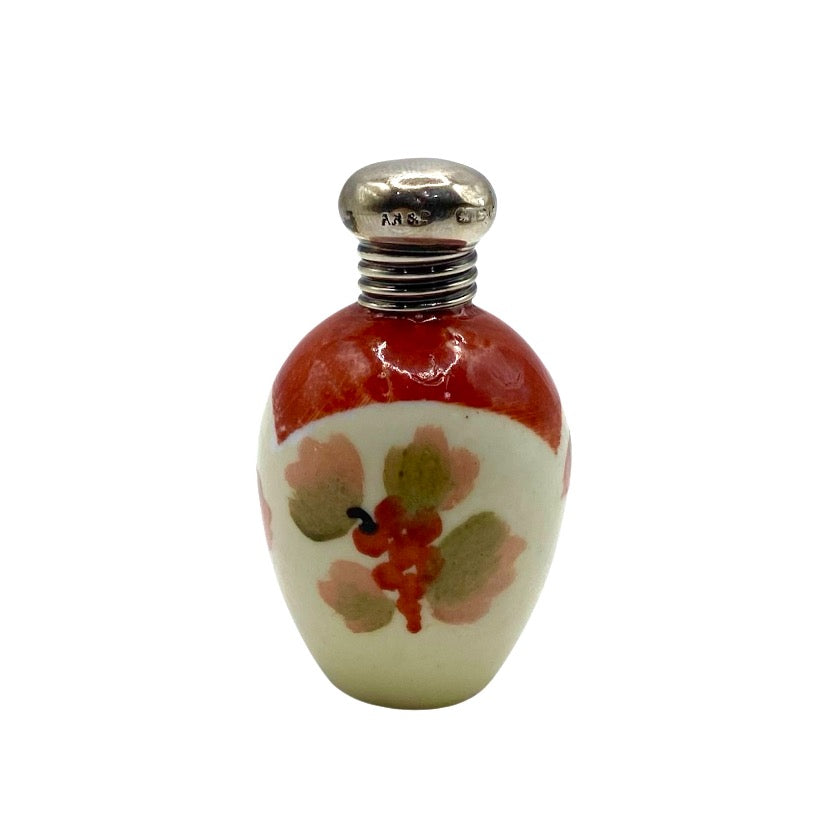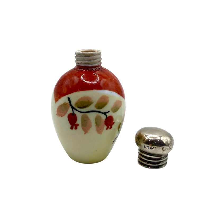 Antique ceramic miniature scent / perfume bottle with silver mount hallmarked Birmingham  1899 maker A B & Co.