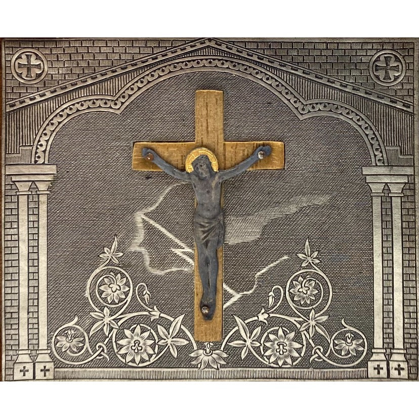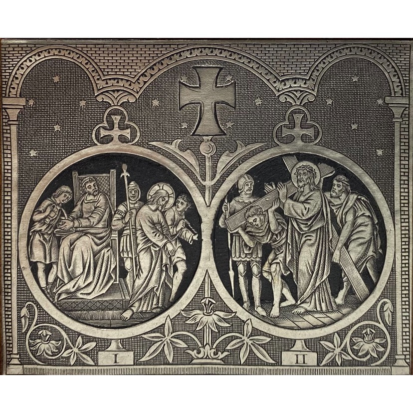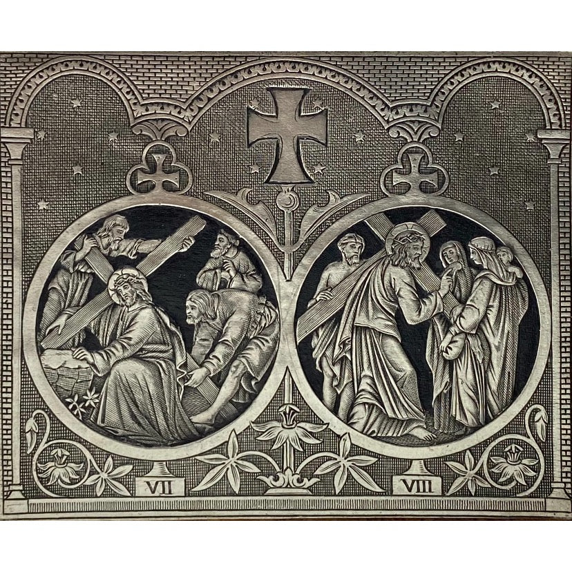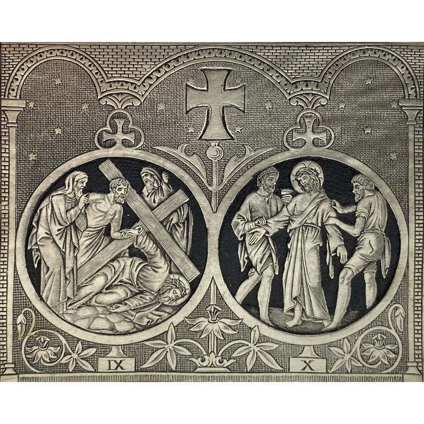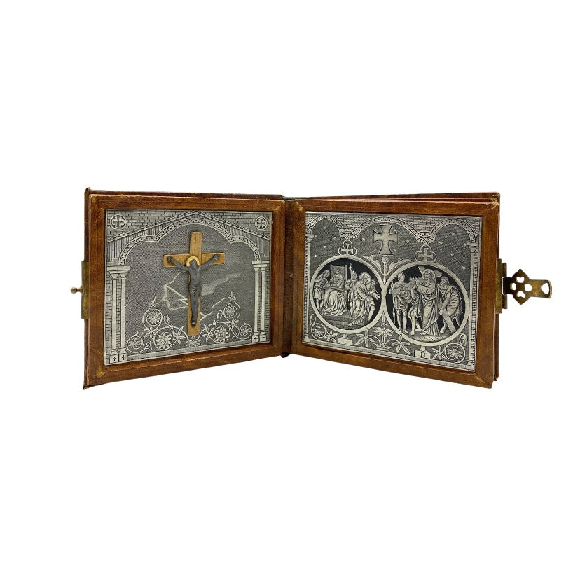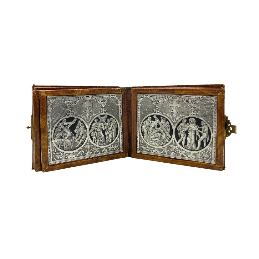 Chemin de Croix”, French Stations of the Cross, leather bound book with eight silver-chased, paneled medallions. Each station is numbered I-XIV with a central crucifix panel on the first page.