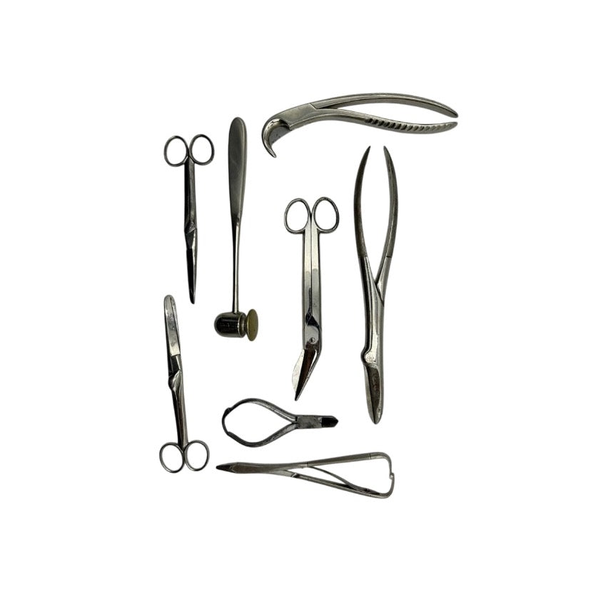1 reflex hammer, 5 different scissors and 2 forceps.