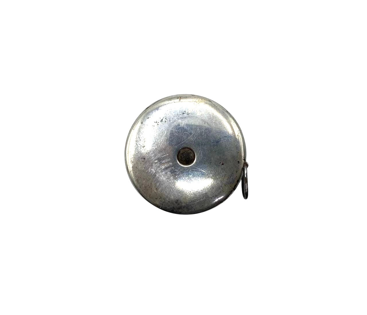 A rare pocket sized silver cased tape measure of excellent quality. The tape pivots on a central pin and of is sprung steel. It works via a ratchet system and once pulled will remain extended until the release button on the top is slid to one side. On sliding the release button the sprung loaded tape retracts back into the body.